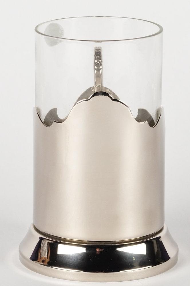 Корпус подстаканника представляет собой авторский образец художественного литья. Он искусно оформлен в соответствии с оригинальным эскизом из никелированной стали. Литой корпус тонирован в технике серебрения. Имеет удобную фигурную ручку для нескольких пальцев. Вставной стакан сделан из ровного прозрачного хрусталя.