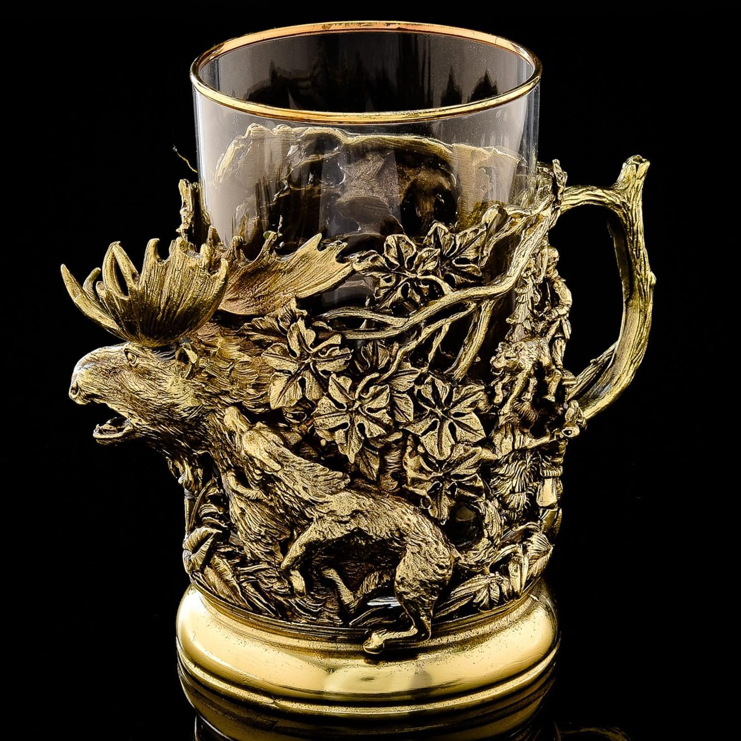 Корпус подстаканника представляет собой авторский образец латунного/бронзового литья. Он искусно оформлен в соответствии с оригинальным эскизом, предполагающим детальный и объемный прорезной орнамент-композицию, тонирован позолотой и патиной. Имеет удобную фигурную ручку для нескольких пальцев. Вставной стакан сделан из ровного прозрачного стекла.