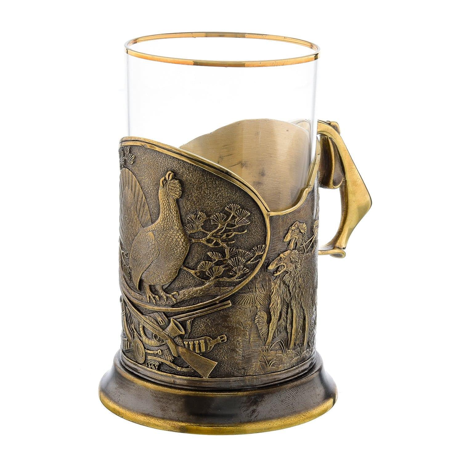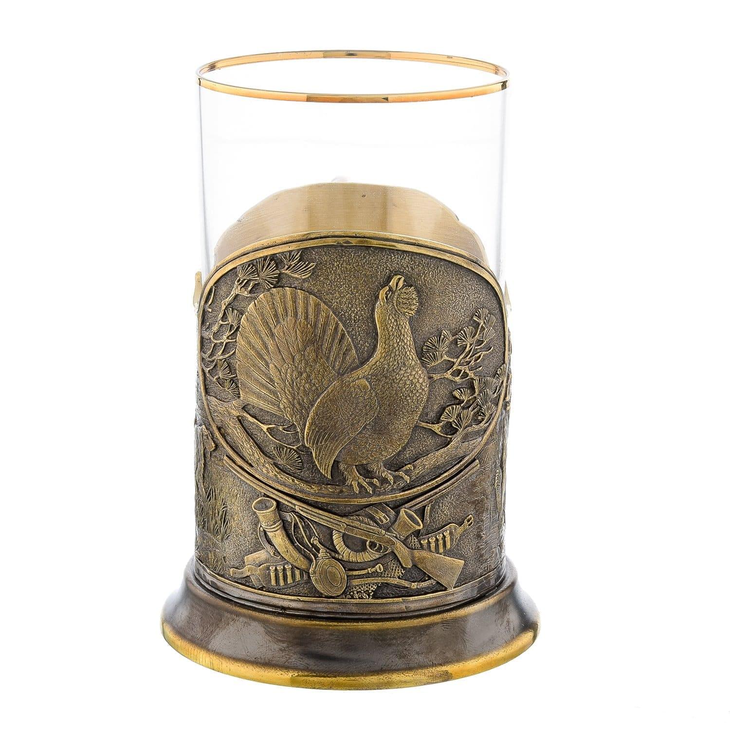 Корпус подстаканника представляет собой авторский образец латунного литья. Он искусно оформлен в соответствии с оригинальным эскизом, предполагающим детальную композицию с образом птицы глухаря - символа уверенности в себе, по фэн-шуй. Литой корпус тонирован позолотой и патиной. Имеет удобную фигурную ручку для нескольких пальцев. Вставной стакан сделан из ровного прозрачного стекла.