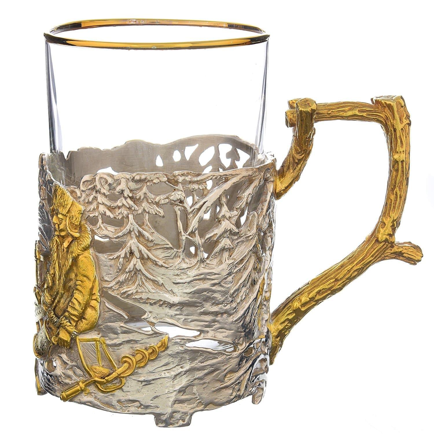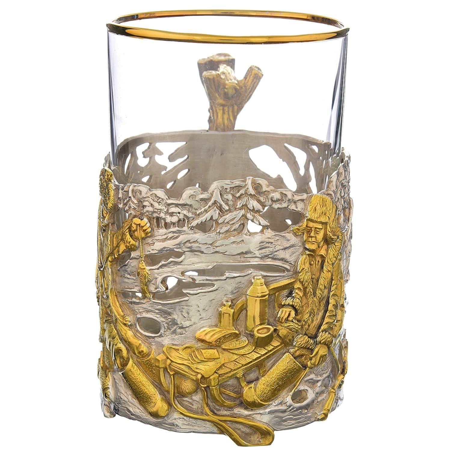 Вашему вниманию - подстаканник с оригинальным туловом, украшенным композицией-барельефом с образом рыбака на льду, ловящего в проруби рыбу, который тонирован эффектной позолотой. Этот сувенир ХИТ во славу России, дизайнерский предмет утвари в русском стиле с высоким стаканом из прозрачного стекла, украшенным золотой каемкой, - вариант адресного подарка для любителя зимней рыбалки.