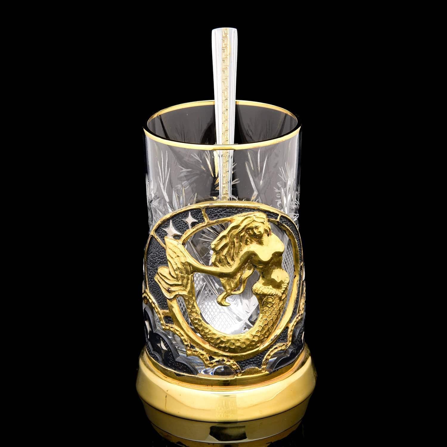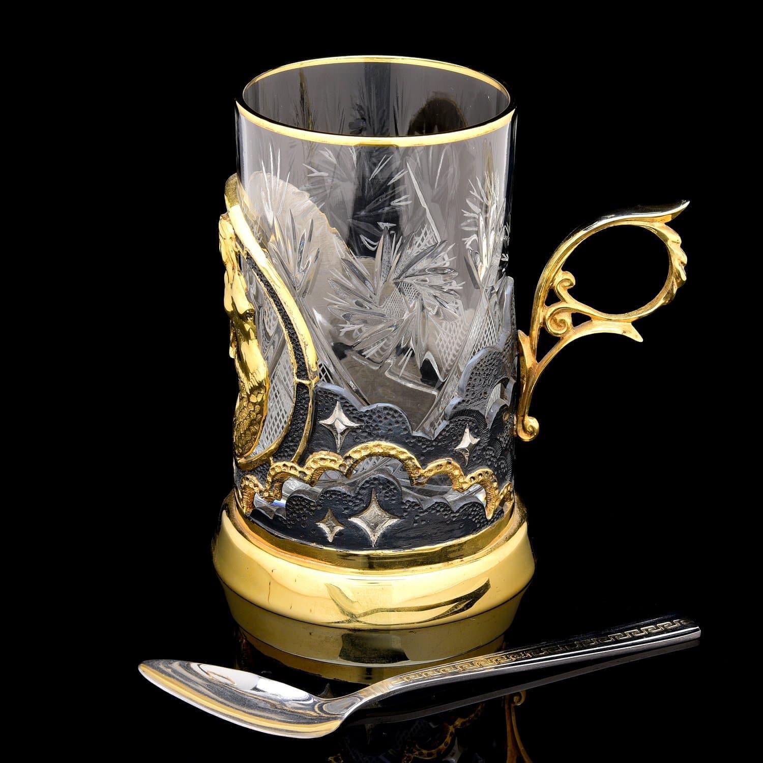 Подстаканник в имперском стиле с ложечкой - дизайнерский питейный сосуд в русском стиле, который предназначен для горячих и холодных напитков. Дизайн посвящен прекрасному знаку зодиака Рыбы, символу плодородия, и украшен Златоустовской гравюрой. Литой корпус тонирован стойкими позолотой и серебристым покрытием. Имеет удобную фигурную ручку для нескольких пальцев. Вставной стакан сделан из прозрачного хрусталя, декорированного в технике резьбы. Подстаканник - предмет обихода в русском стиле из металла и стекла узнаваемого дизайна, известный с 19 века. Он напоминает россиянам о приятном времени, проведенном в поездах дальнего следования, и вкусе сладкого чая с лимоном. Подстаканники получили распространение во времена активной государственной деятельности министра Витте. Подстаканник с ложкой уложен красивую подарочную упаковку из дерева.