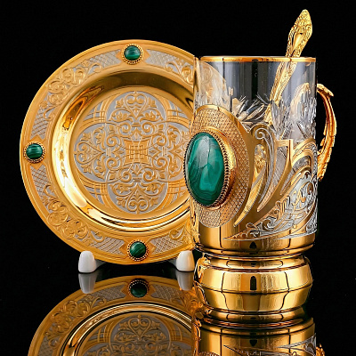 Подстаканник с золочением и нефритом «Орнамент». Златоуст