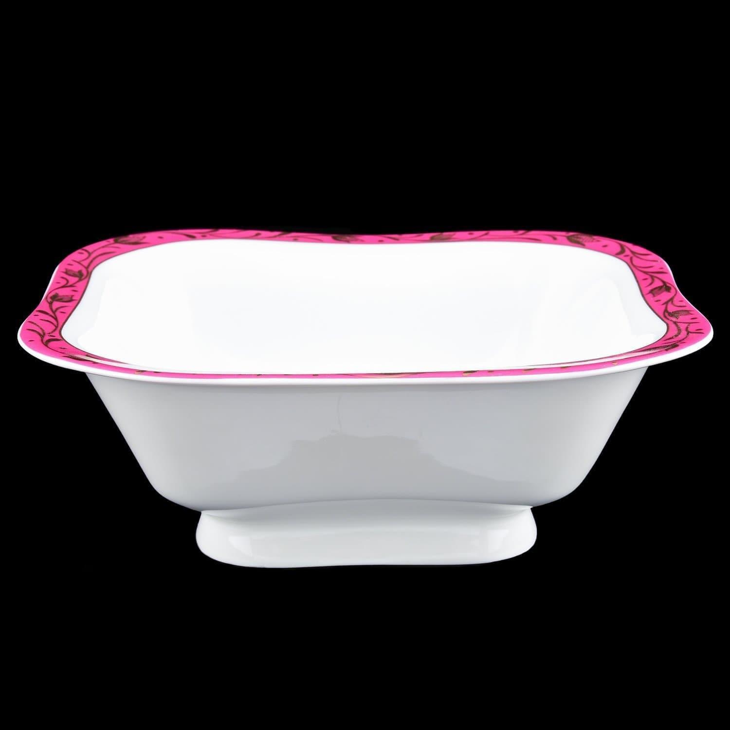 Корпус салатника изготовлен из твердого, не пористого фарфора, который отличается глубоким и насыщенным цветом благодаря особой рецептуре, разработанной ученым Виноградовым в 18 веке. Форма изделия называется "Молодежная". Поверхность фарфора расписана вручную краской оттенка фуксии.