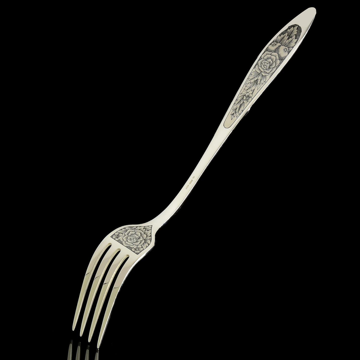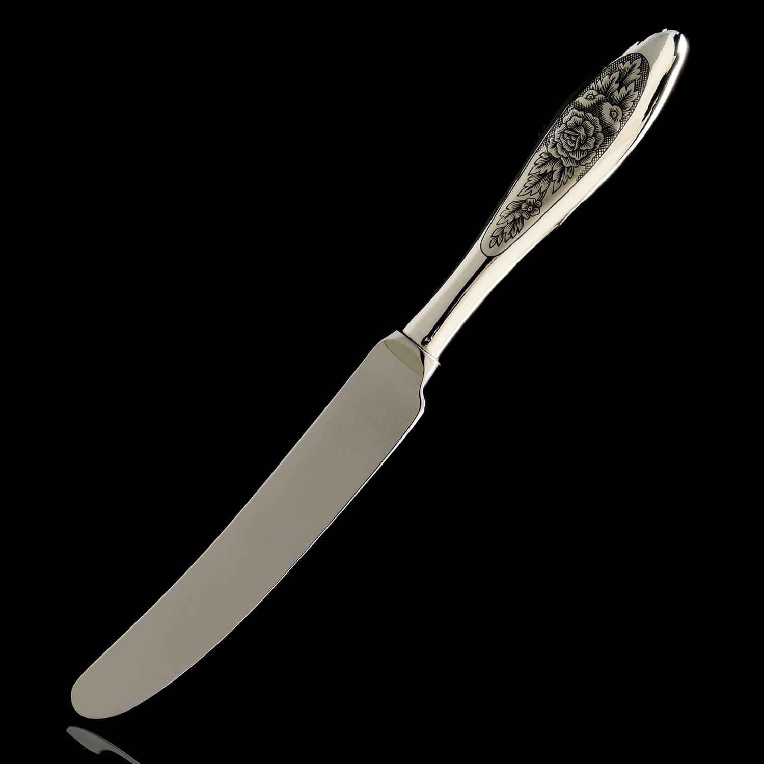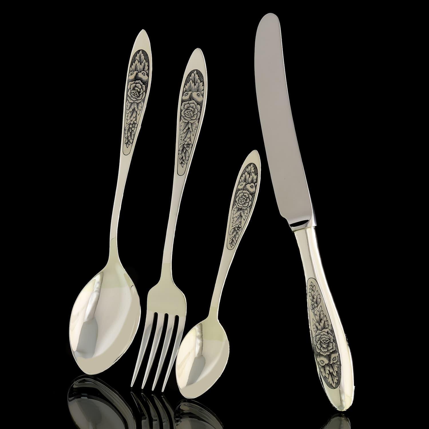 Серебро настолько тягучий, пластичный и ковкий металл, что легко режется ножом. Его использовали еще до нашей эры. В Сардинии серебро добывали и обрабатывали с эпохи раннего энеолита. В древности вавилоняне и ассирийцы считали его символом Луны и почитали как священный металл. В России он впервые был выплавлен в конце 17 века. Само слово переводится как «светлый»/«белый», восходит к древнеиндийскому «сарпа» - название Луны и древнего орудия земледельцев. Итальянский мореплаватель Себастьян Кабот встретил моряка, утверждавшего, что видел страну с горами серебра. Путешественник отправился искать его в Аргентину, но не нашел. Благодаря этой истории государство получило свое название. Самые большие запасы серебра находятся в Индии и в нейронах человеческого мозга. Согласно легендам, металл отпугивает вампиров, злых духов. На Руси в качестве первой валюты употребляли серебряные брусочки, которые рубили на части (отсюда и название «рубли»). В набор входят 24 предмета. Размеры: столовая ложка - 20,5 см. чайная ложка - 14,5 см. вилка - 20 см. нож - 22,5 см.