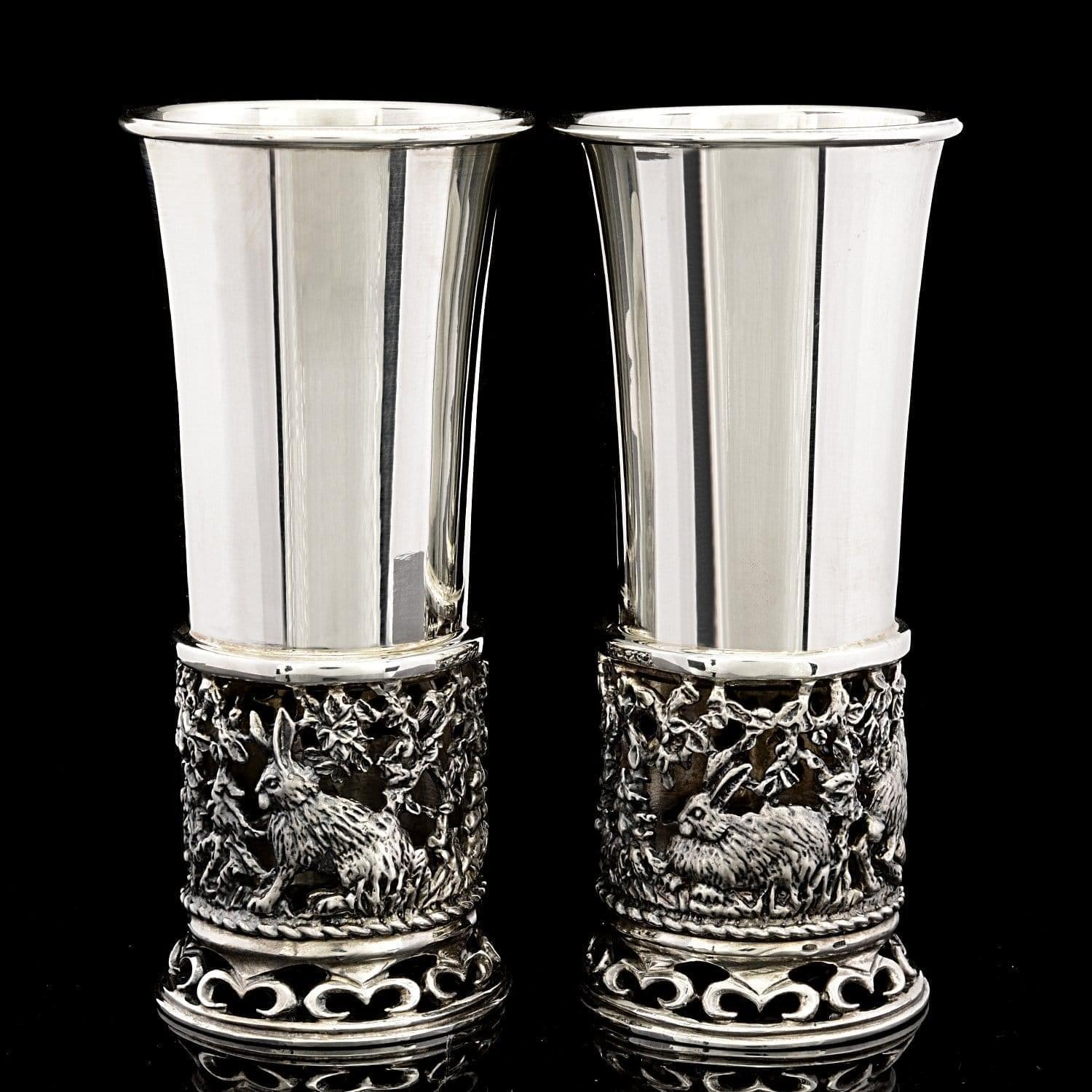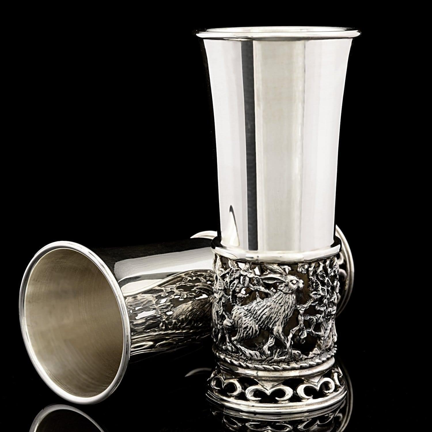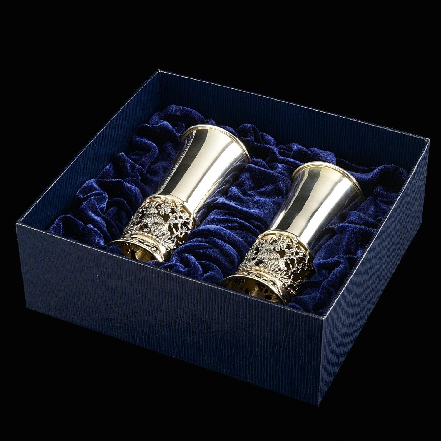 Авторская работа, набор из двух серебряных стопок для водки "Зайцы", в подарочной упаковке - это практичный и изысканный вариант мужского vip-подарка на Новый год, Юбилей. Свадьбу, День рождения, общий или личный, в том числе профессиональный праздник.