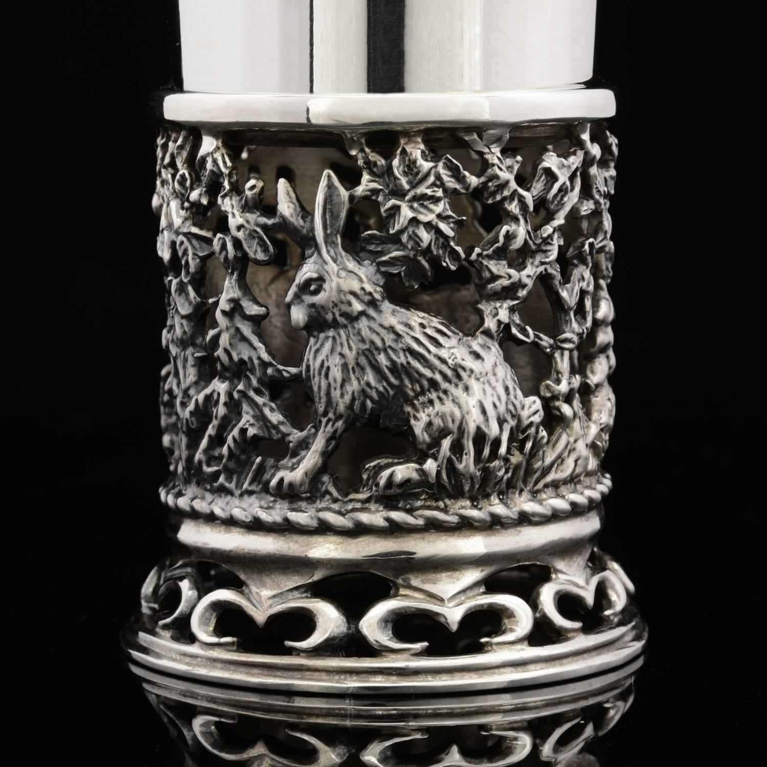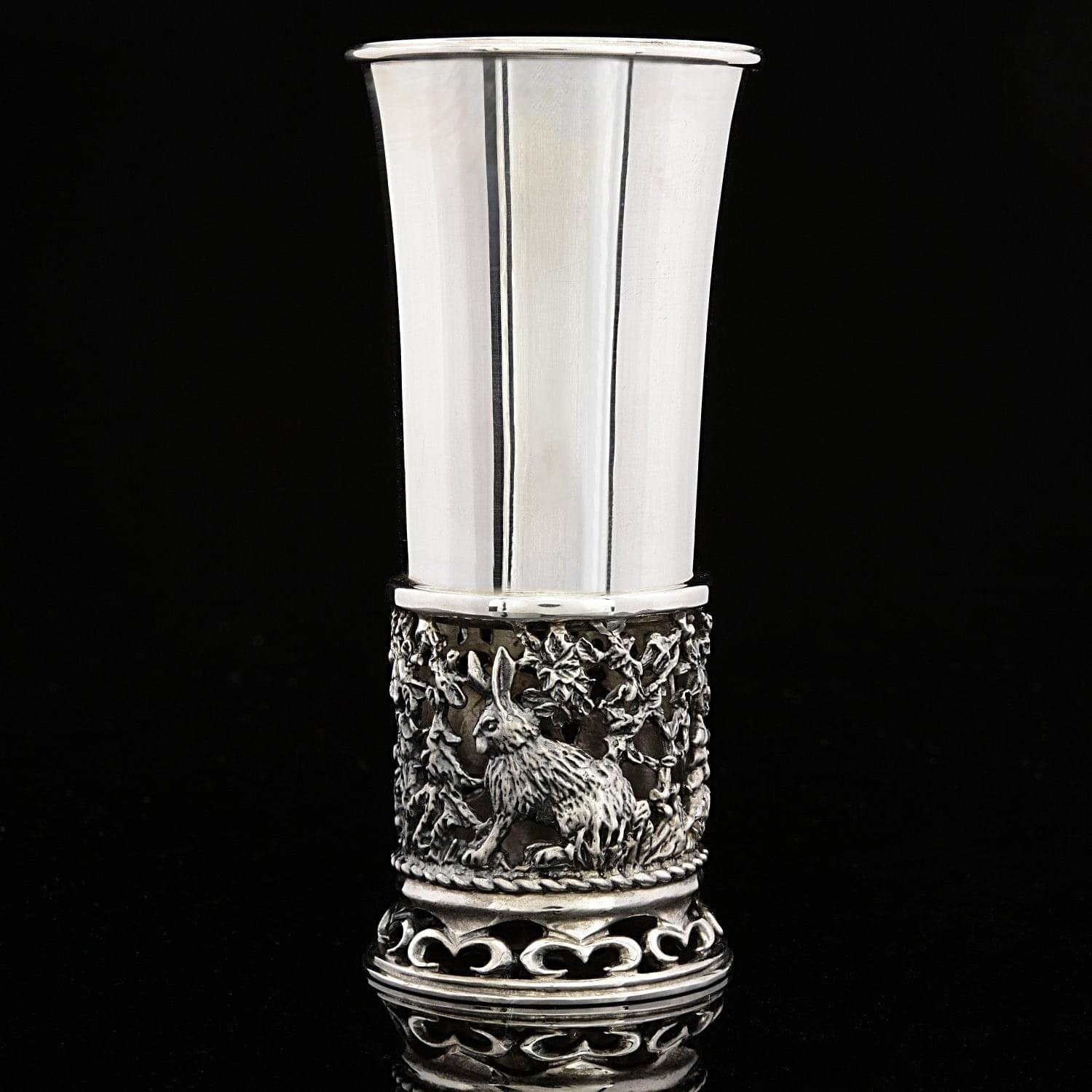 Корпус каждой стопки оформлен в соответствии с оригинальным авторским эскизом художником по металлу из драгоценного металла-самородка, серебра. В нижней части корпуса каждой - изображена прорезная композиция с зайцами.