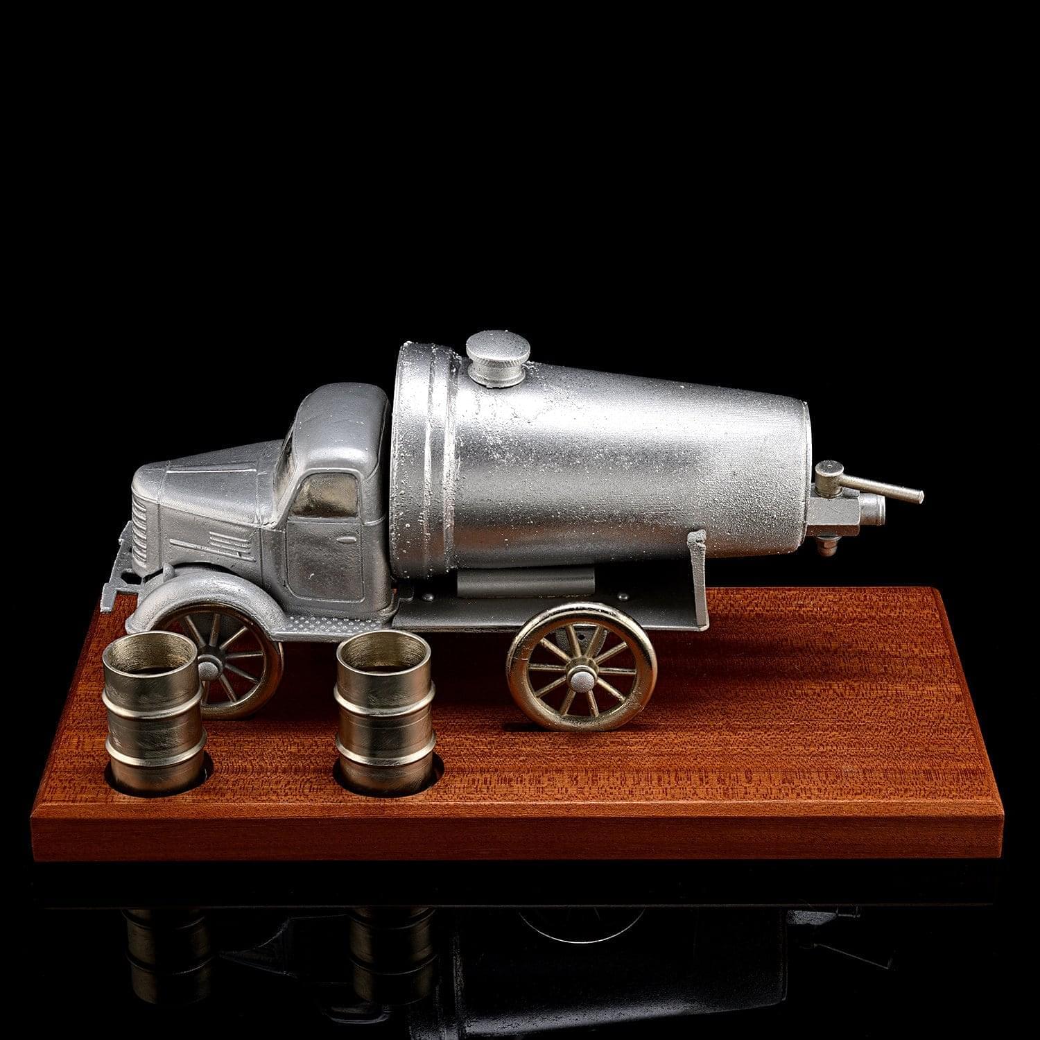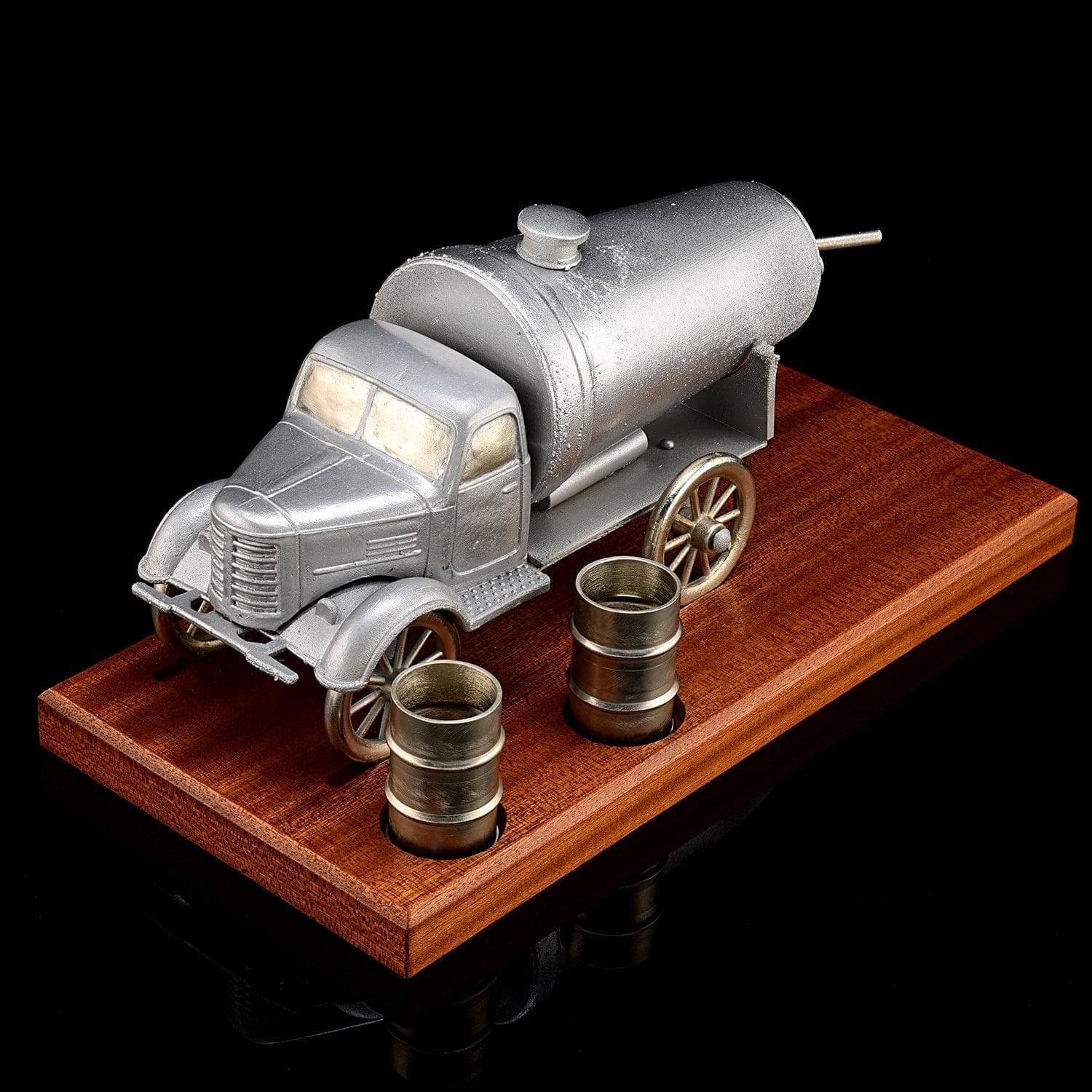 Вашему вниманию - эксклюзив Галереи, подарочный питейный набор, который призван подчеркнуть чувство вкуса и стиля хозяина дорогого интерьера, который является почитателем эксклюзивных предметов декора ручной работы. Набор с парой стопой и металлической скульптурой ретро-грузовика на подставке их дерева ценной породы.