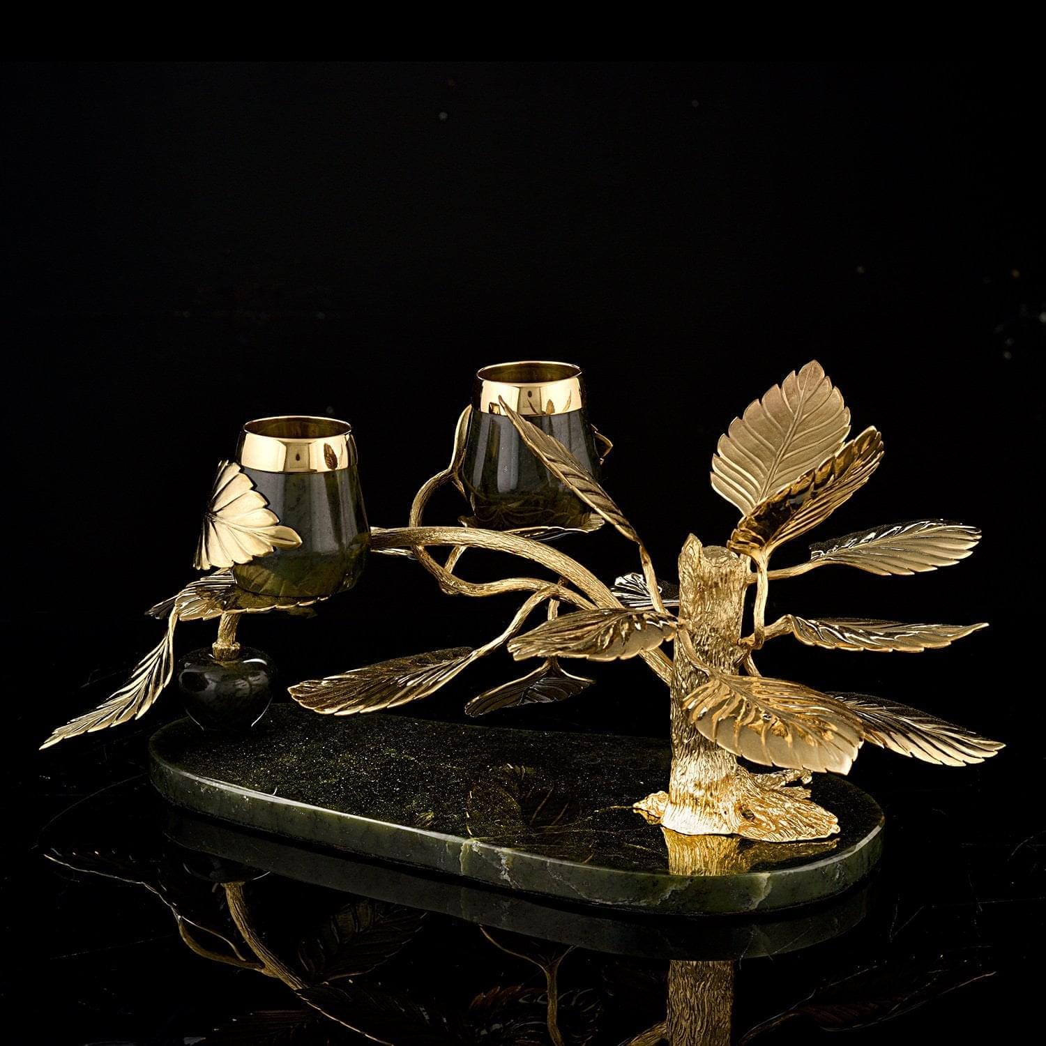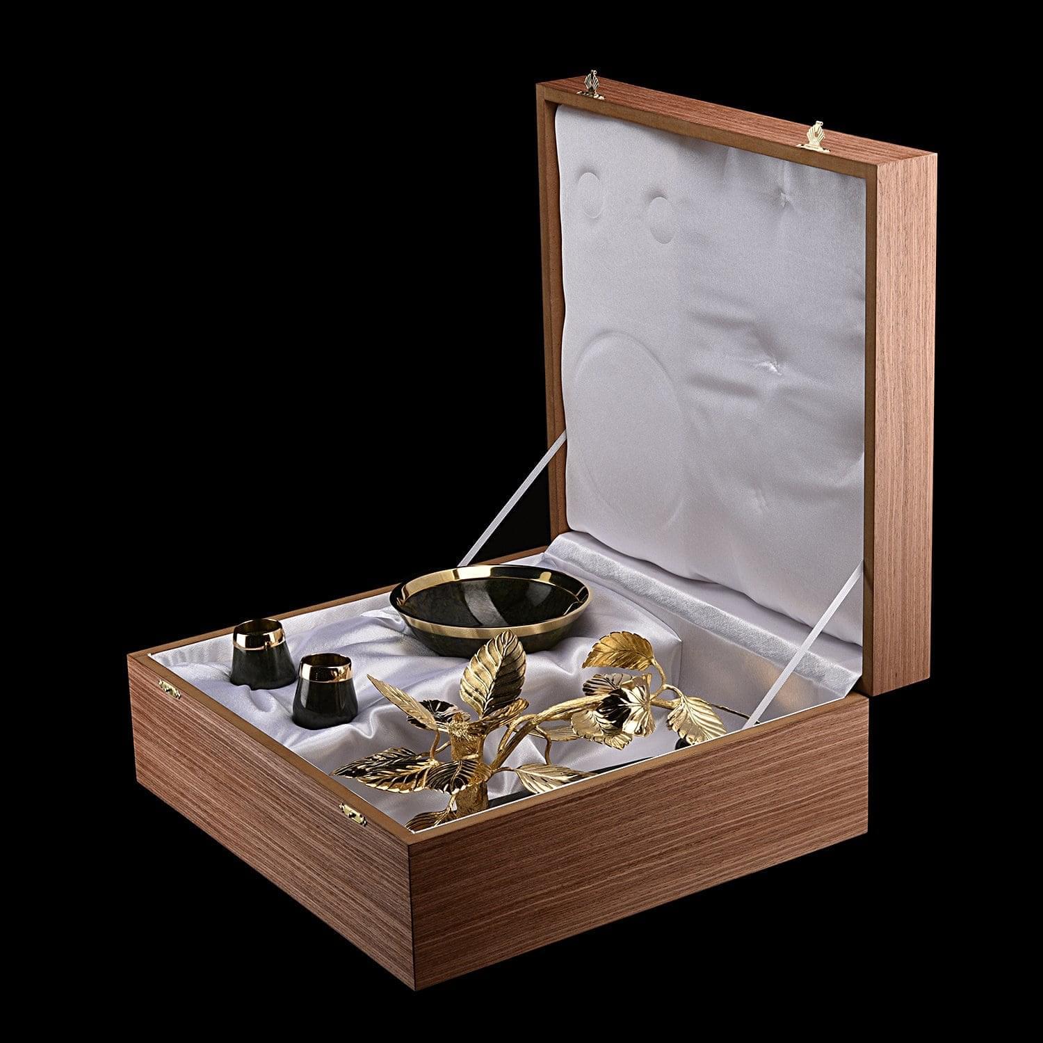 Набор включает два питейных сосуда с корпусами из нефрита, украшенными декоративными элементами из латуни с выгравированными на них вручную композициями и орнаментами, затем - чашу из нефрита с декоративным элементом из латуни, подставку с яблоней.