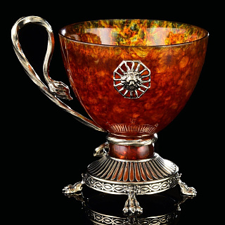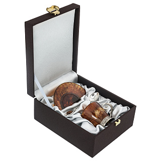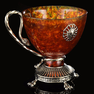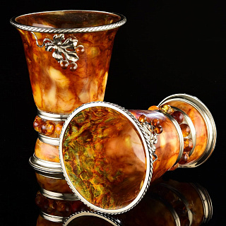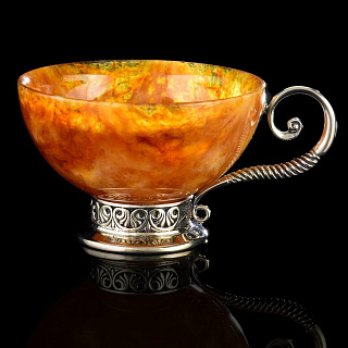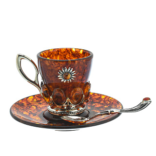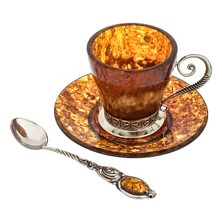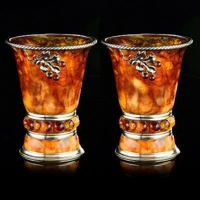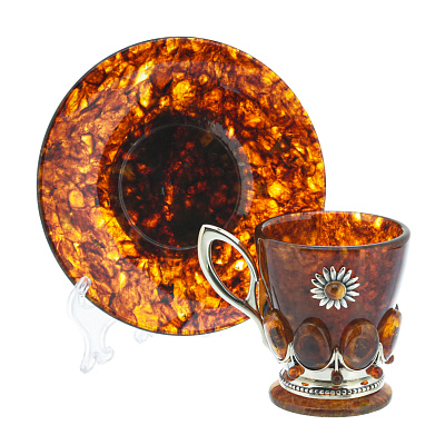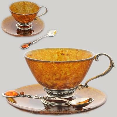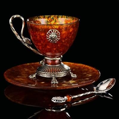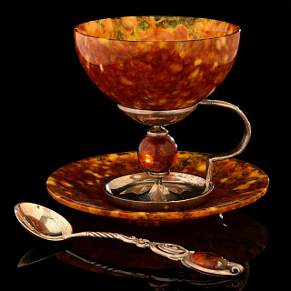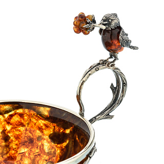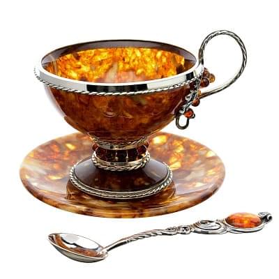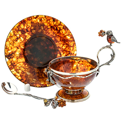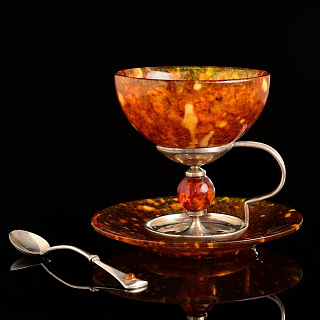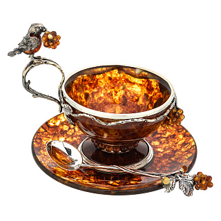 Набор на две персоны. Чайная пара из янтаря «Виноград». Серебро 875 пробы