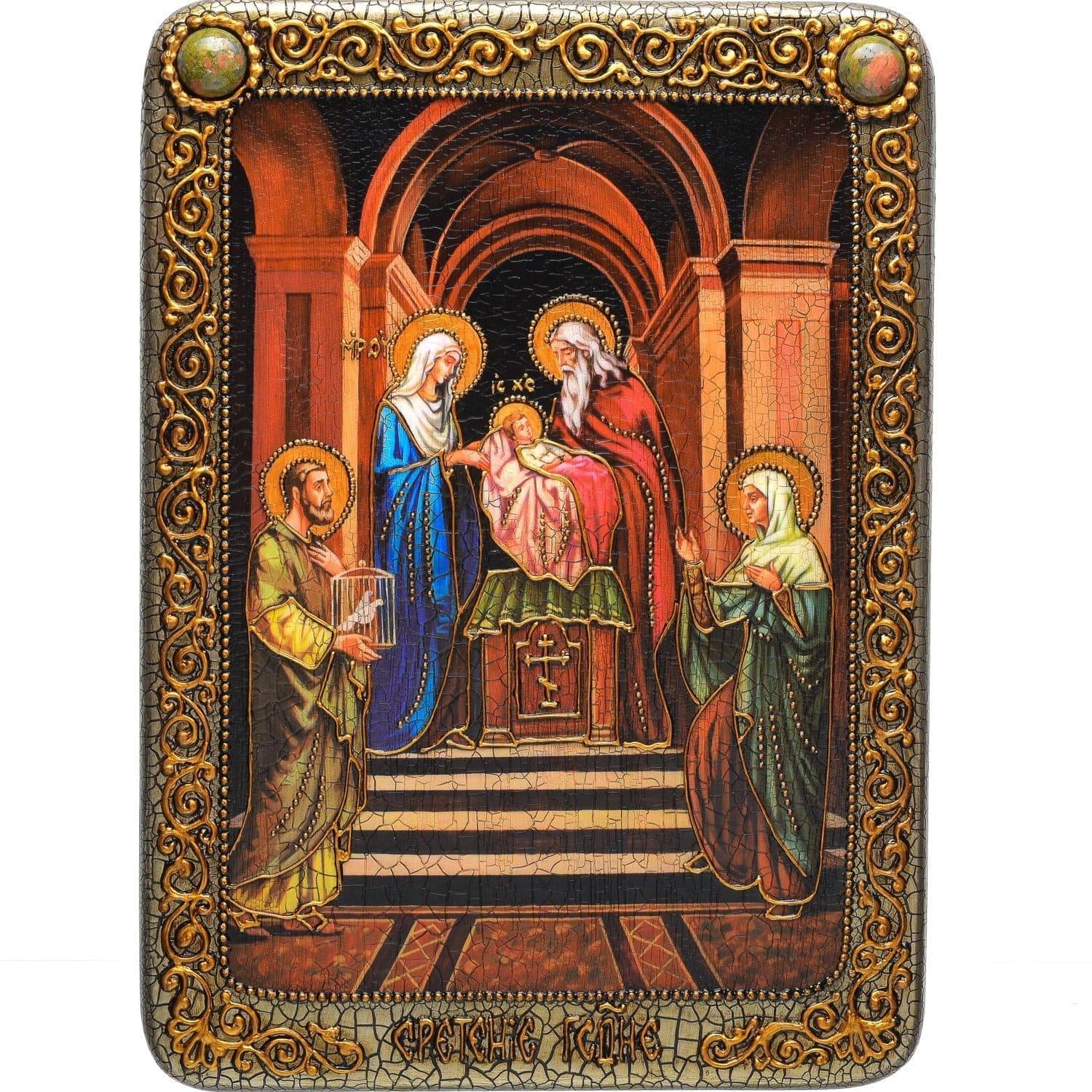 Вашему вниманию - редкая икона из нашей обширной коллекции с иконописным изображением сцены сретения Господа (принесения в Иерусалимский храм младенца Иисуса Христа его родителям, которое состоялось на 40 день после Рождества и на 32 день после Обрезания).