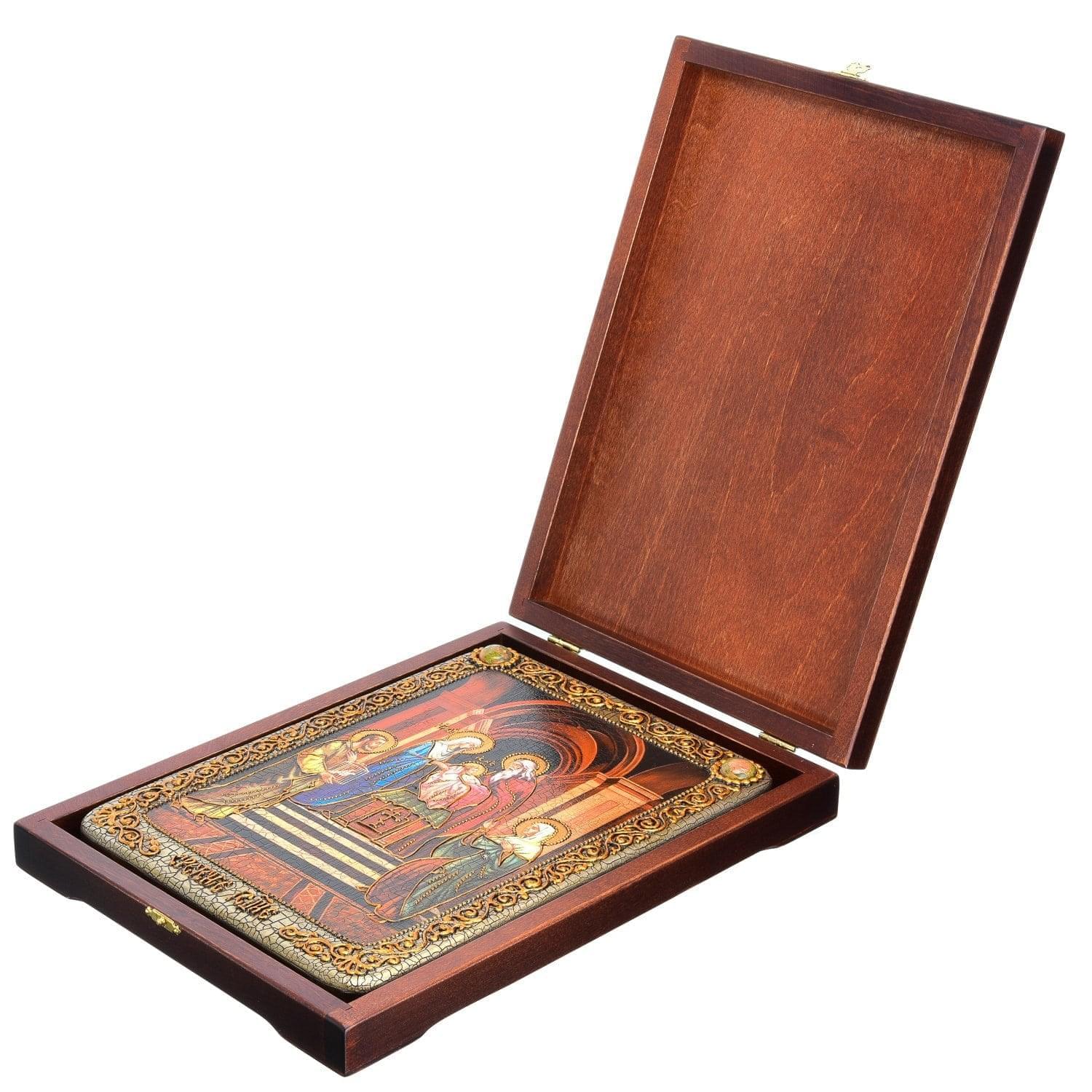 Икона уложена в подарочный короб из дерева и готова к дарению. Эксклюзивная работа российского иконописца, резчика по дереву, икона подарочная