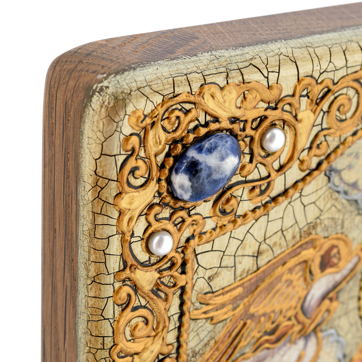 Материалы: мореный дуб, краски, жемчуг, содалит.