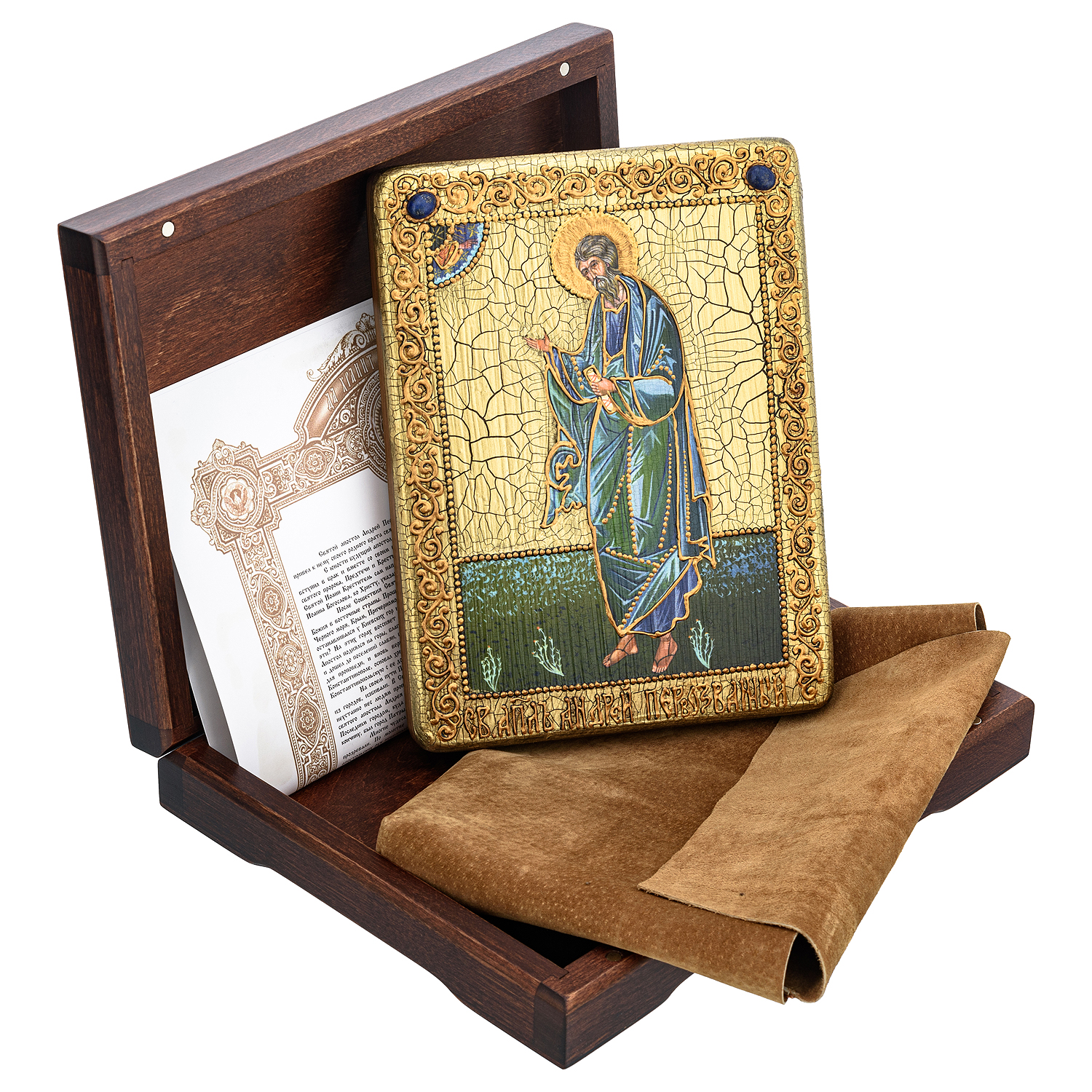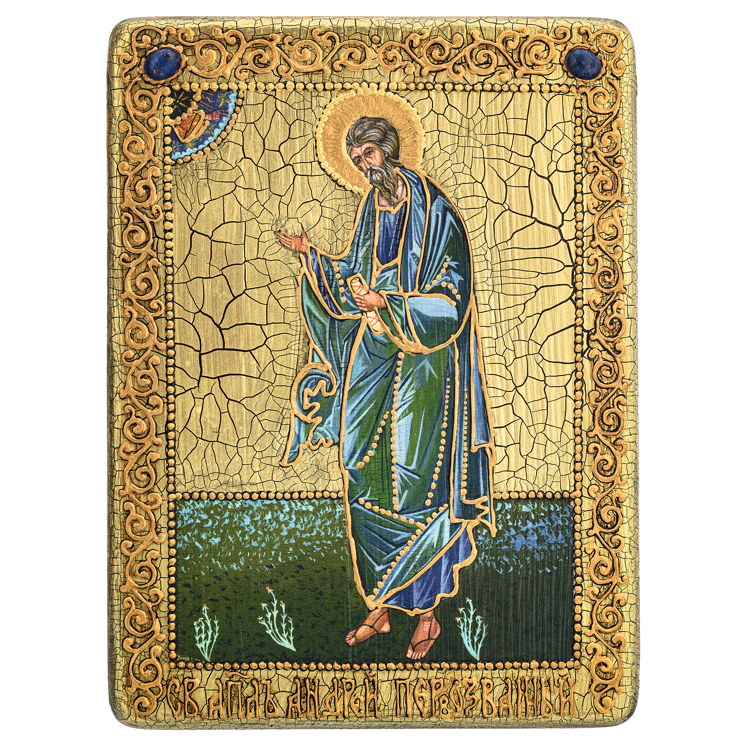 Апостол Андрей один из 12 апостолов, учеников Иисуса Христа. Персонаж книг Нового Завета. Иконографически изображается в красном и зеленом одеянии с бородой, держащий крест или с косым крестом, символом его мученической казни, а также свитком в руке или книгой. Андрей был родным братом апостола Петра, родился в Вифсаиде, на берегу Галилейского озера. Оба рыбачили. Стал первым из призванных учеников Христа, в связи с чем назван Первозванным. Услышав о том, что на реке Иордан Иоанн Предтеча проповедует о приходе Мессии и призывает к покаянию, Андрей отправился к нему. Так он стал учеником Иоанна Крестителя. В день Пятидесятницы (через 50 дней после Воскресения Иисуса) в Иерусалиме Святой Дух сошел в виде огненных языков на апостолов. Вдохновляемые Духом Божьим, они получили дар исцелять, пророчествовать и говорить на разных наречиях о великих делах Господа. Двенадцать учеников Иисуса разделили между собой страны, куда они должны были нести евангельскую проповедь, обращая язычников ко Христу. Святому Андрею выпали по жребию земли Вифинии и Пропонтиды с городами Халкидон и Византий, также земли Фракии и Македонии, простирающиеся до Черного моря и Дуная, земли Скифии и Фессалии, Эллады и Ахайи. Власти встречали апостола гонениями, он много страдал, но «с услаждением» переносил все бедствия во имя Христа. По преданию, был распят в Патрах около 67 года. В Патрах воздвигнут самый большой в Греции собор Андрея Первозванного. На Руси культ апостола Андрея Первозванного распространялся с 1080-х годов. Первую церковь в его честь построили в Киеве в 1086 году. Ему посвятили картины великие Мурильо, Эль Греко, Сурбаран. В 1698 году российский царь Петр I учредил первую награду России - Орден Святого Андрея Первозванного, позднее флаг русского флота - Андреевский.