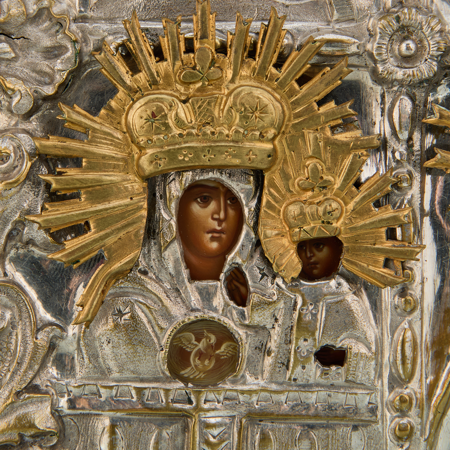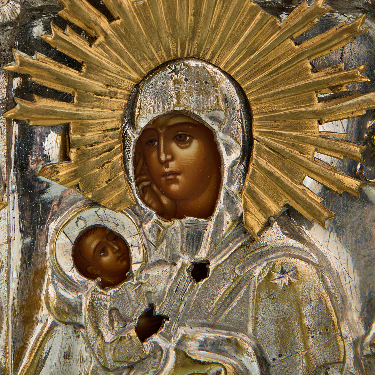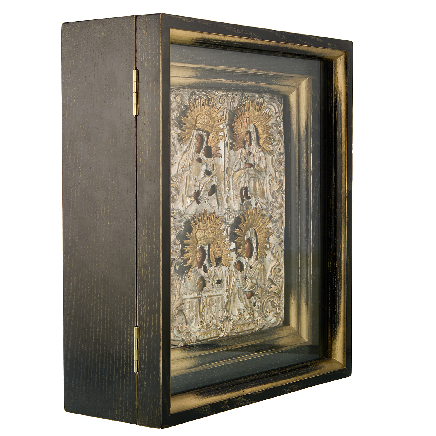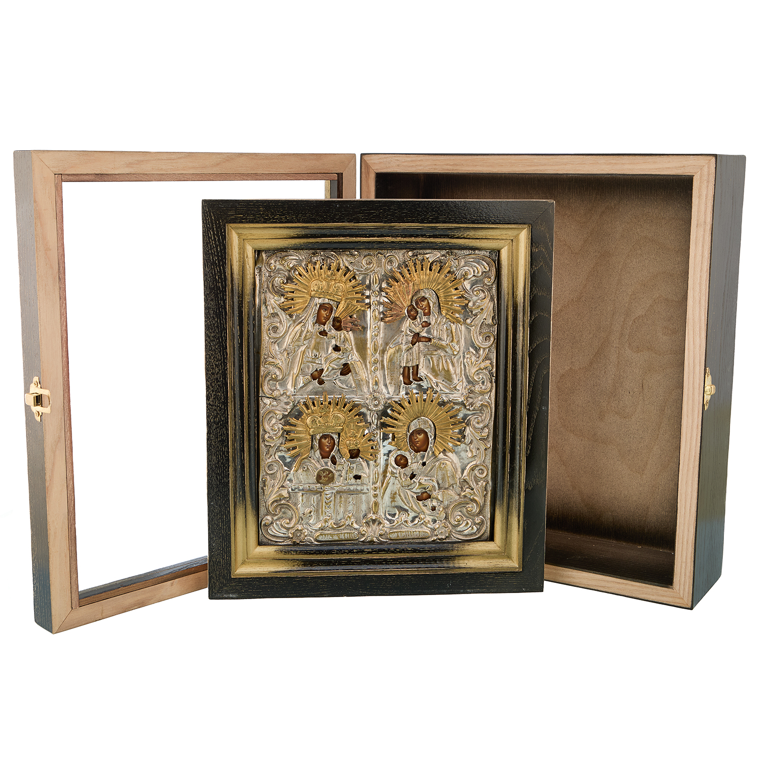 Икона в киоте "Благословение Матерей" написана маслом в стиле реалистичной живописи.