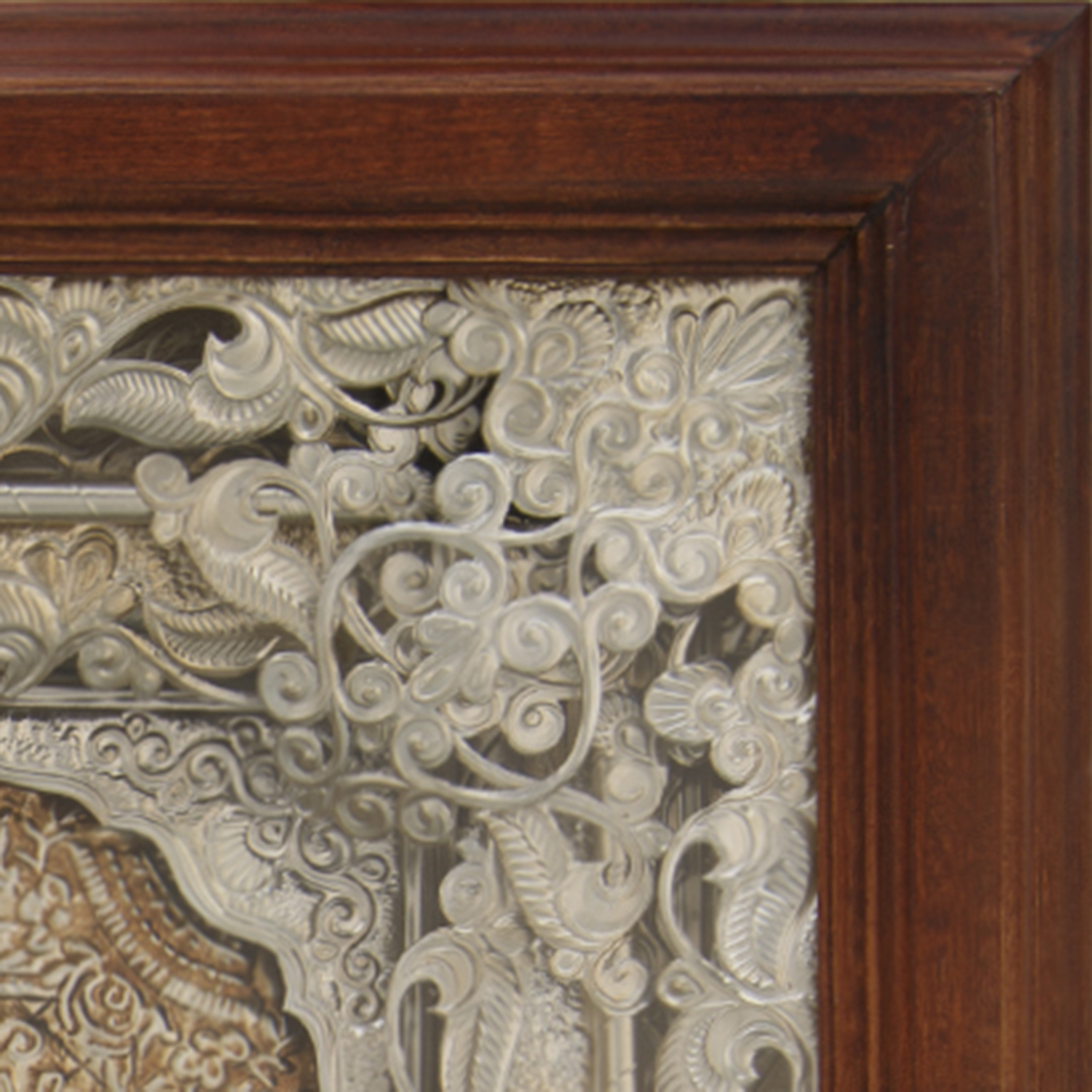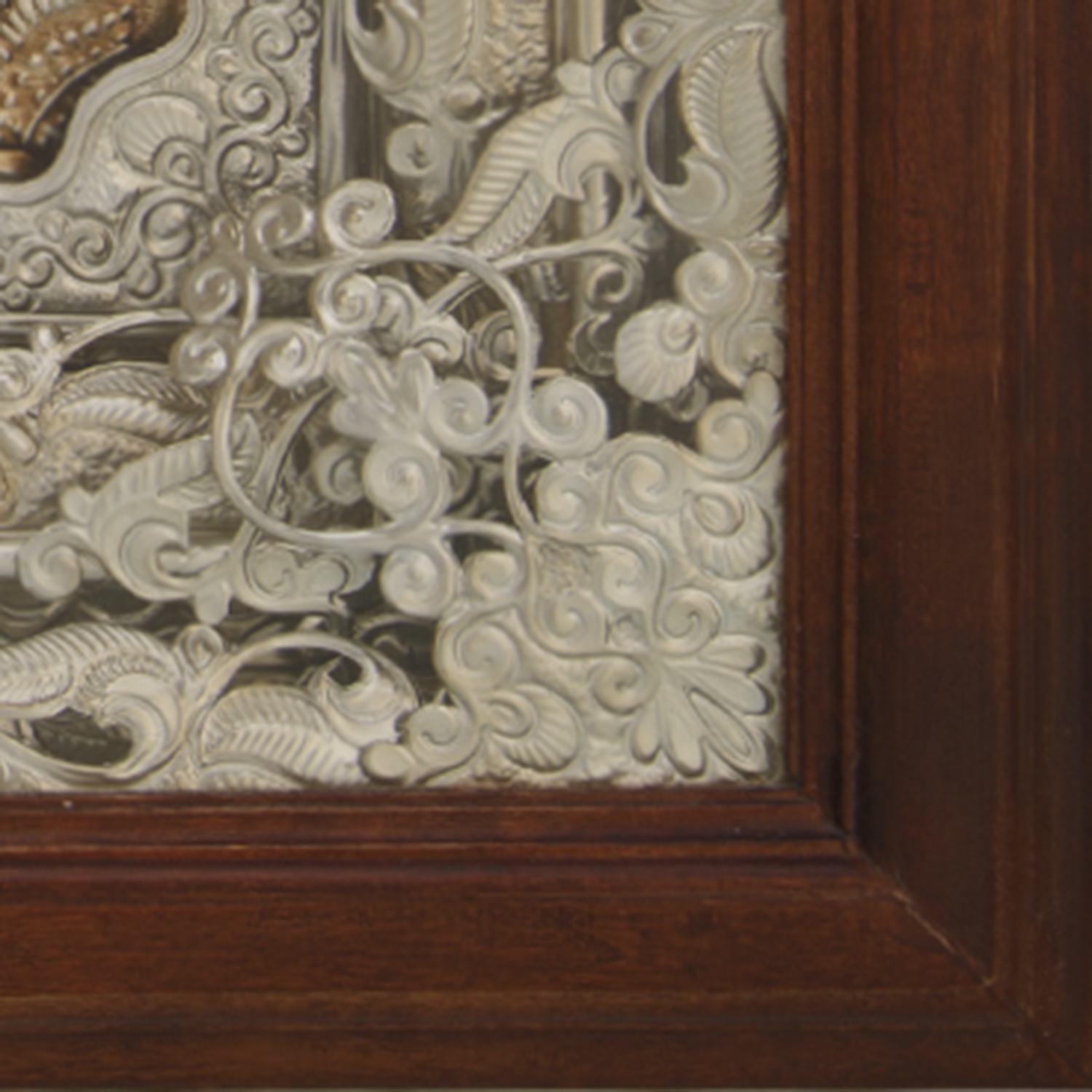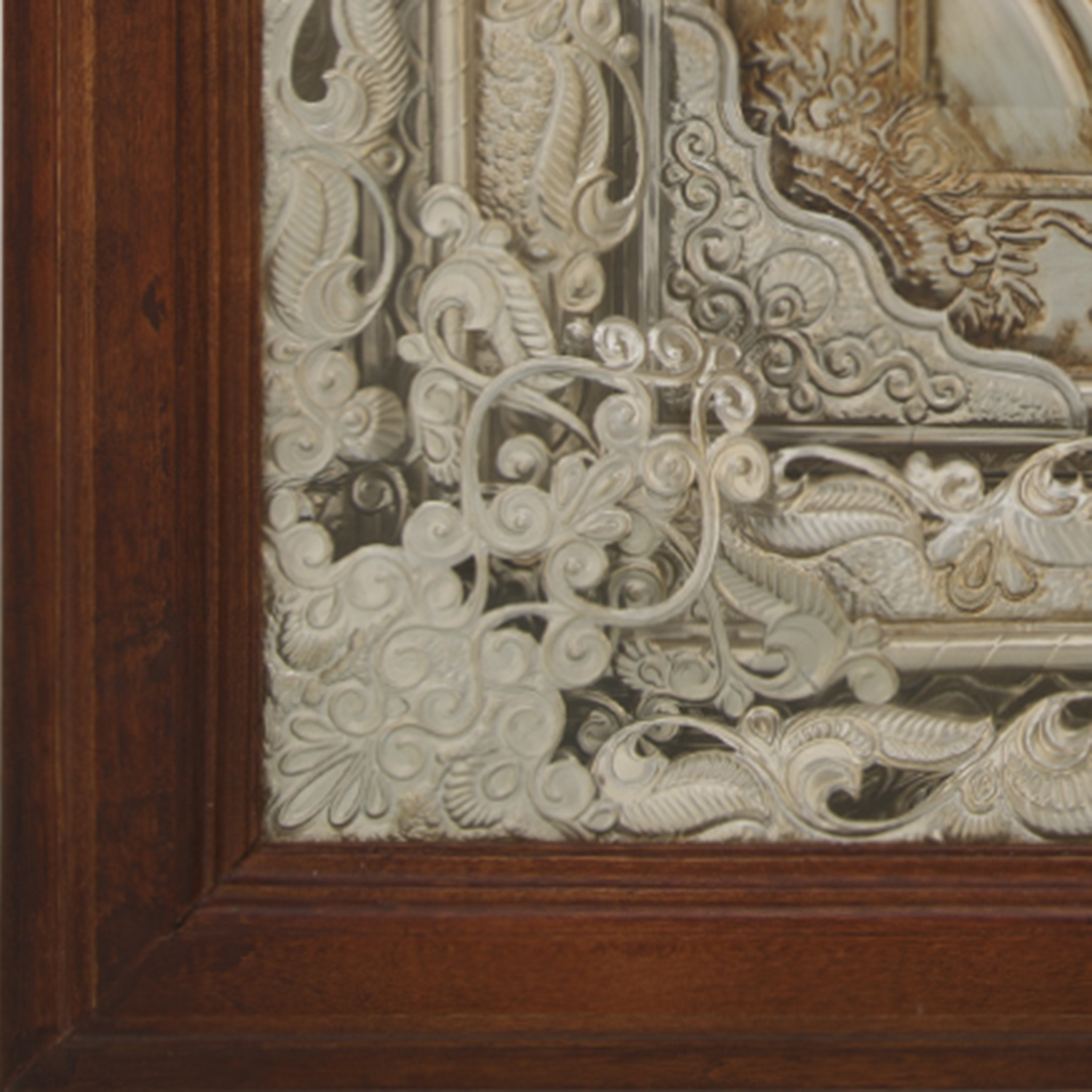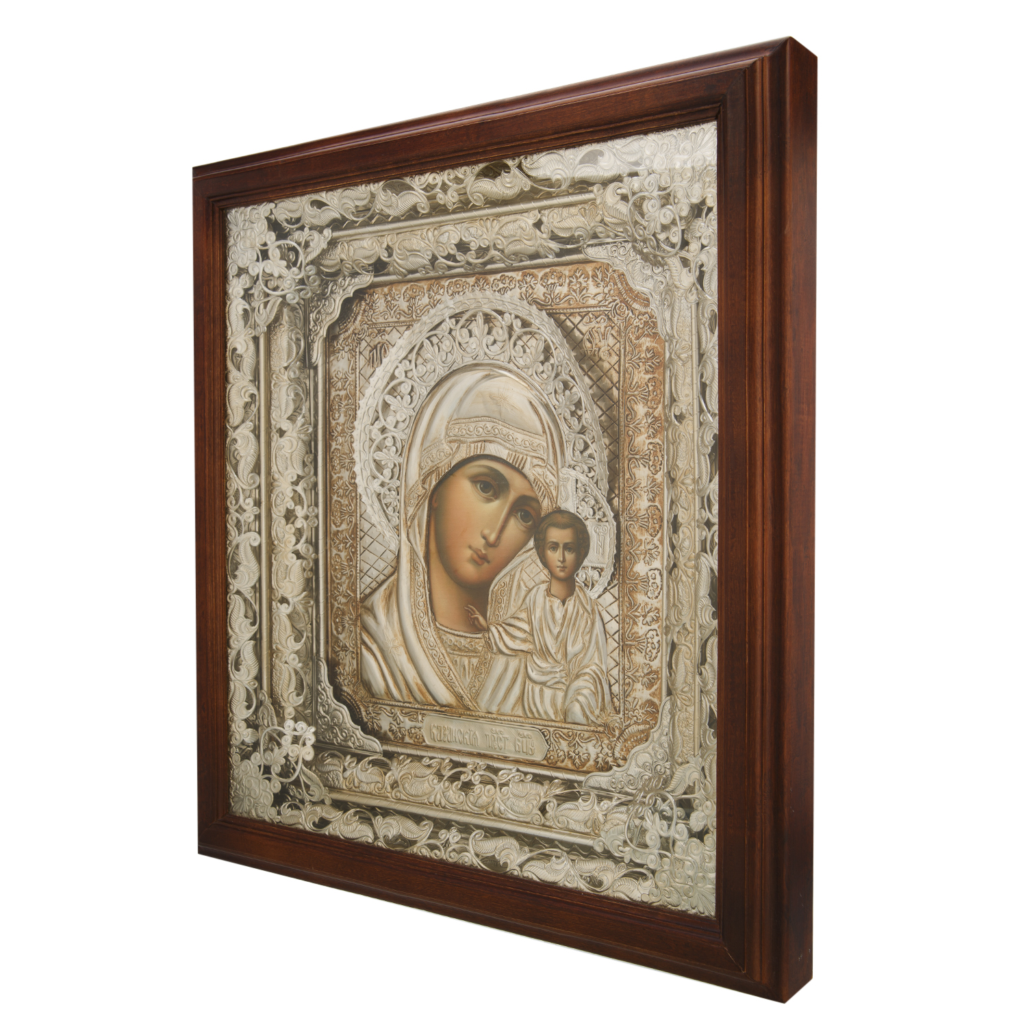 Икона крупного формата с окладом из драгоценного металла и киотом, отличающимися искусной ювелирной обработкой. Поверхность оклада и трехуровневая рама киота изготовлены вручную в технике художественного литья и представлены сочетанием множества растительных элементов. Молельный образ Богородицы написан темперными красками, приготовленными на основе натуральных пигментов и эмульсий, в соответствии с художественными канонами русско-византийской иконописи и помещен под стекло, обрамлен в тонкую раму из дерева ценной породы.