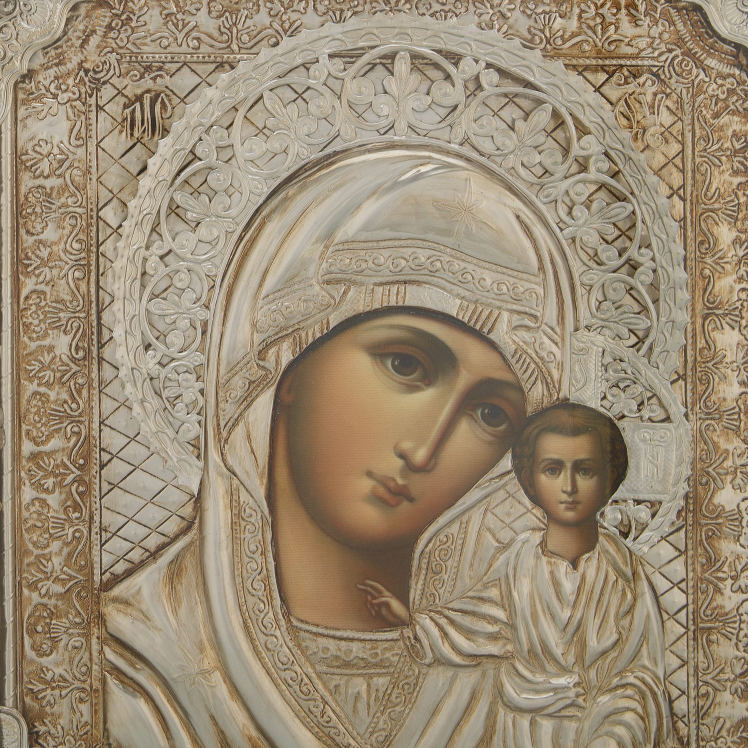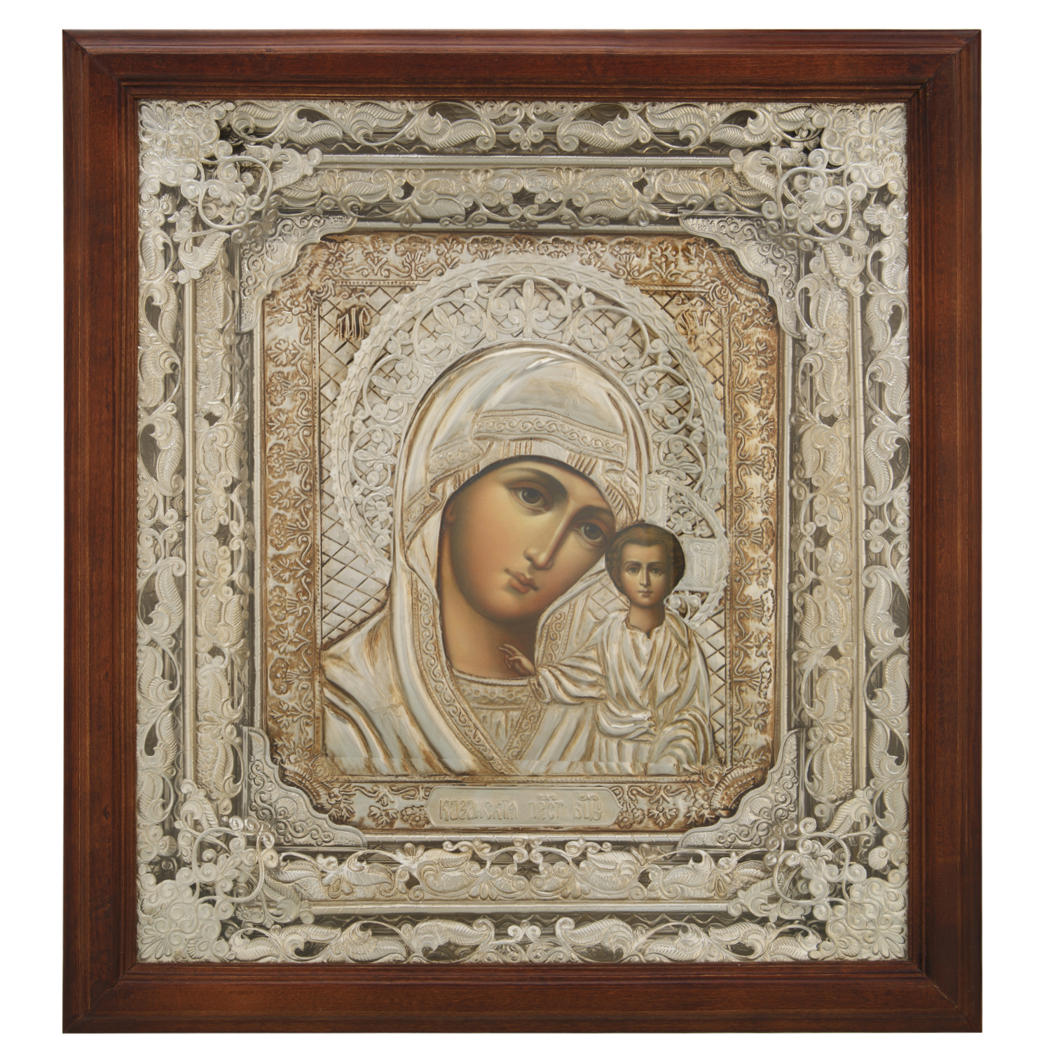 Это огрудное изображение Девы Марии с сыном Иисусом Христом на руках относится к иконописному типу Одигитрия (Указующая путь/Путеводительница). Впервые данная икона появилась в Казани в конце 16 века, а первые и последующие молитвы о здравии, обращенные к ней, принесли людям исцеления. Однако впоследствии икона была украдена и уничтожена. Икона Богородицы будет выражением истинного благолепия в красном углу у Вас дома. Обычно именно этой иконой благословляют молодых к венцу и именно ее вешают у детских кроваток.