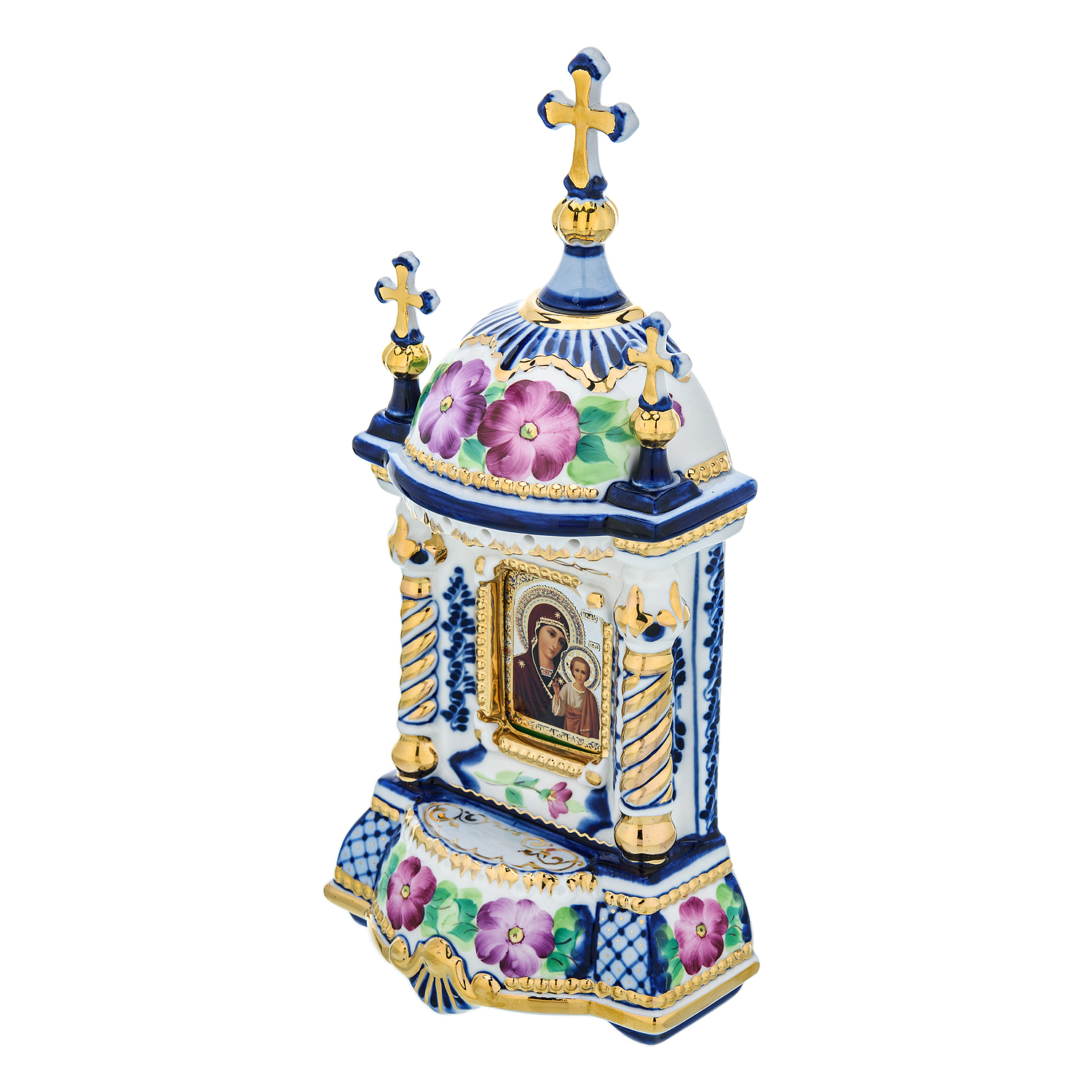 Киот выполнен в традициях кобальтовой и надглазурной росписи с использованием золота. Изделие выполнено из фарфора, но, благодаря сложному технологическому процессу изготовления, киот очень трудно разбить. Мастера позаботились о том, чтобы была обеспечена полная водонепроницаемость, экологическая безопасность и механическая прочность, достигаемая с помощью специально разработанных наполнителей. Мастера уже четверть века занимаются изготовлением киотов из художественного фарфора, успешно участвуя в многочисленных выставках. Казанская икона Божией Матери - почитаемая чудотворной икона Богородицы, явившаяся в Казани в 1579 году. До обретения Казанской иконы, в марте 1516 года, посол Василий Андреевич Коробов привез из Константинополя в Москву икону Богородицы для великого князя Василия III. Во времена царя Алексея Михайловича она хранилась в Московском Кремле. День явления Казанской иконы - 8 июля 1579 года - ежегодный праздник в Русской Церкви. Материалы: Фарфор, краски, позолота.