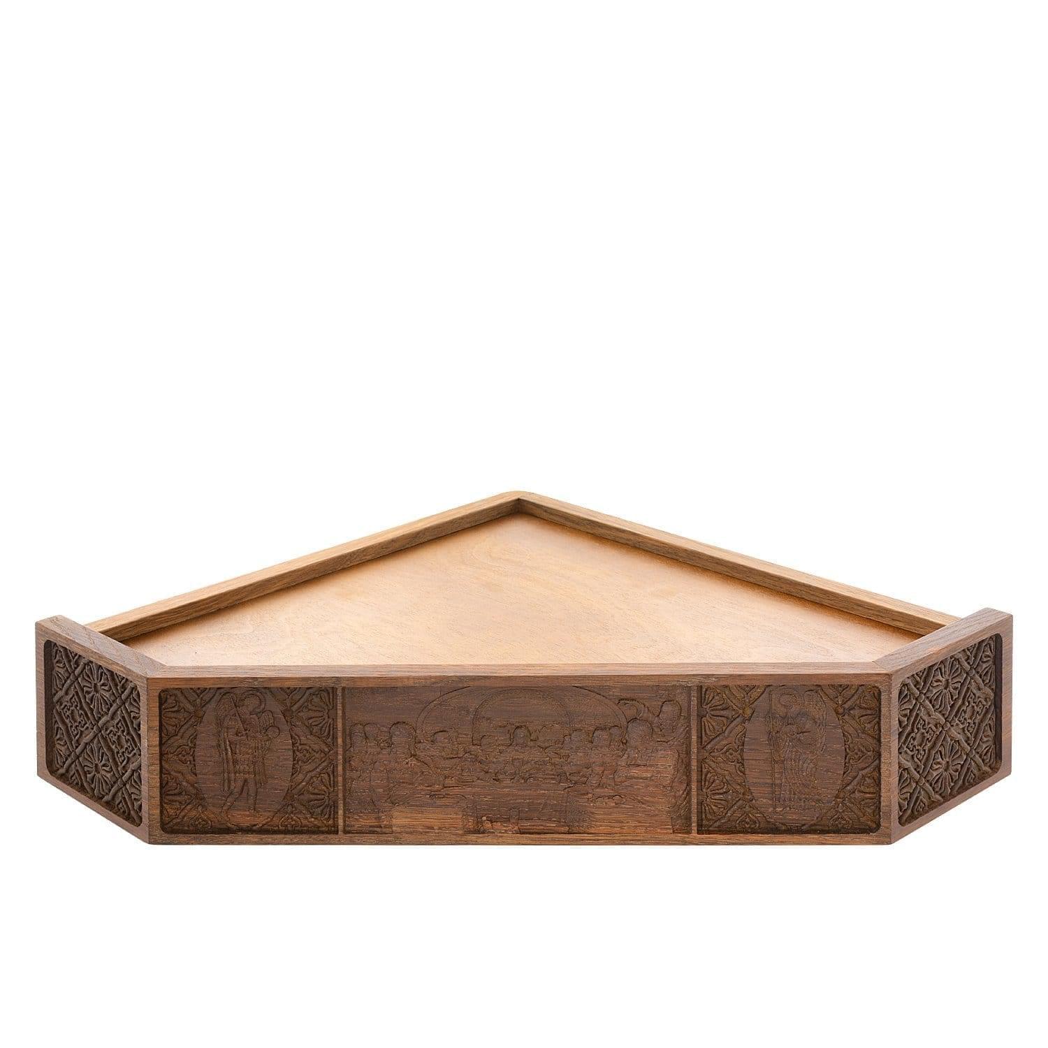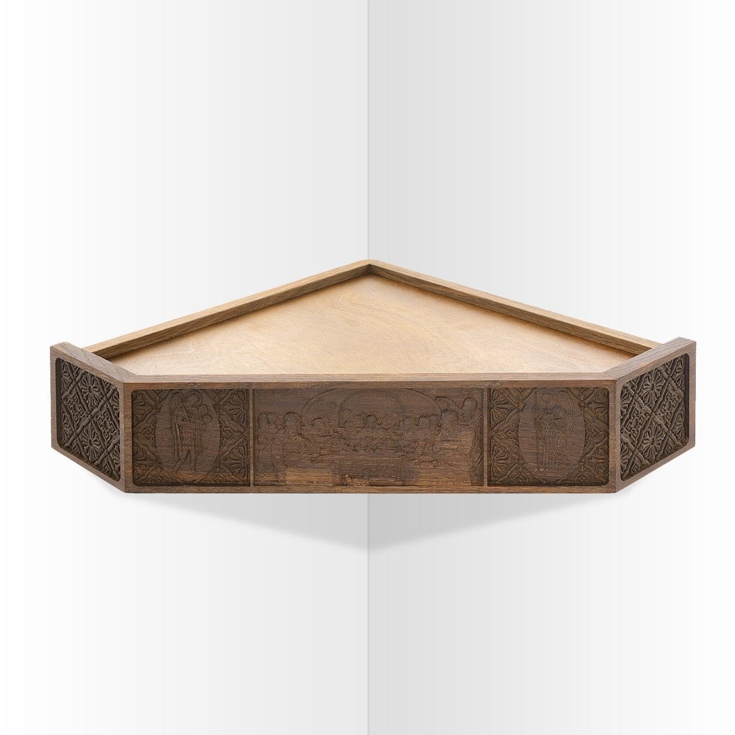 Перед Вами - чудесный образец авторской резьбы по дереву и эксклюзивный интерьерный аксессуар в русском стиле, а также вариант подарка для православного верующего, предназначенный для декора домашнего "красного угла". Угловая полка для икон мастерски выточена из массива ценного сорта древесины и декорирована вручную в технике объемной резьбы по дереву резной композицией, молельными образами и изысканным авторским орнаментом...