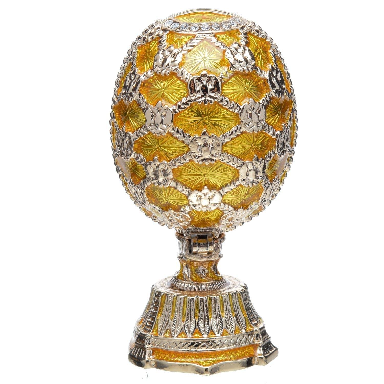 Перед Вами - символ ювелирного промысла России, яйцо в традициях Фаберже с раскрывающимися створками и сюрпризом внутри. Сияющие покрытие металла в оттенке белого золота эффектно сочетается с сочной эмалью цвета яичного желтка . Изделие создает роскошный акцент в интерьере. Прекрасный символичный подарок в русском стиле!