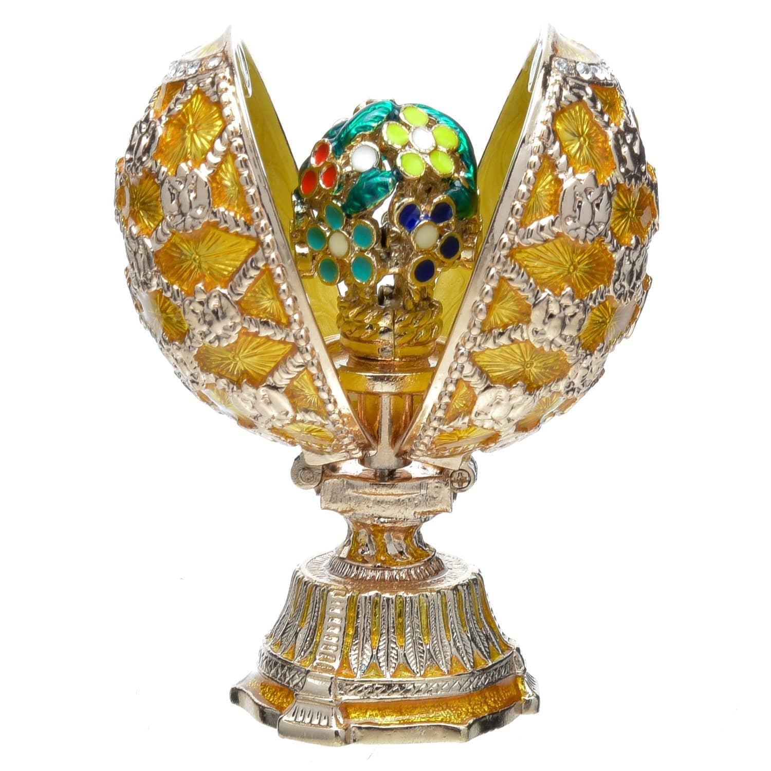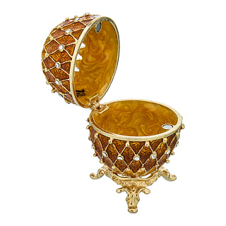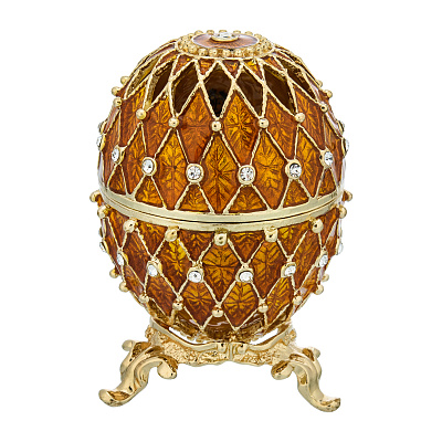Перед Вами - символ ювелирного промысла России, яйцо в традициях Фаберже с раскрывающимися створками и сюрпризом внутри. Сияющие покрытие металла в оттенке белого золота эффектно сочетается с сочной эмалью цвета яичного желтка . Изделие создает роскошный акцент в интерьере. Прекрасный символичный подарок в русском стиле!..