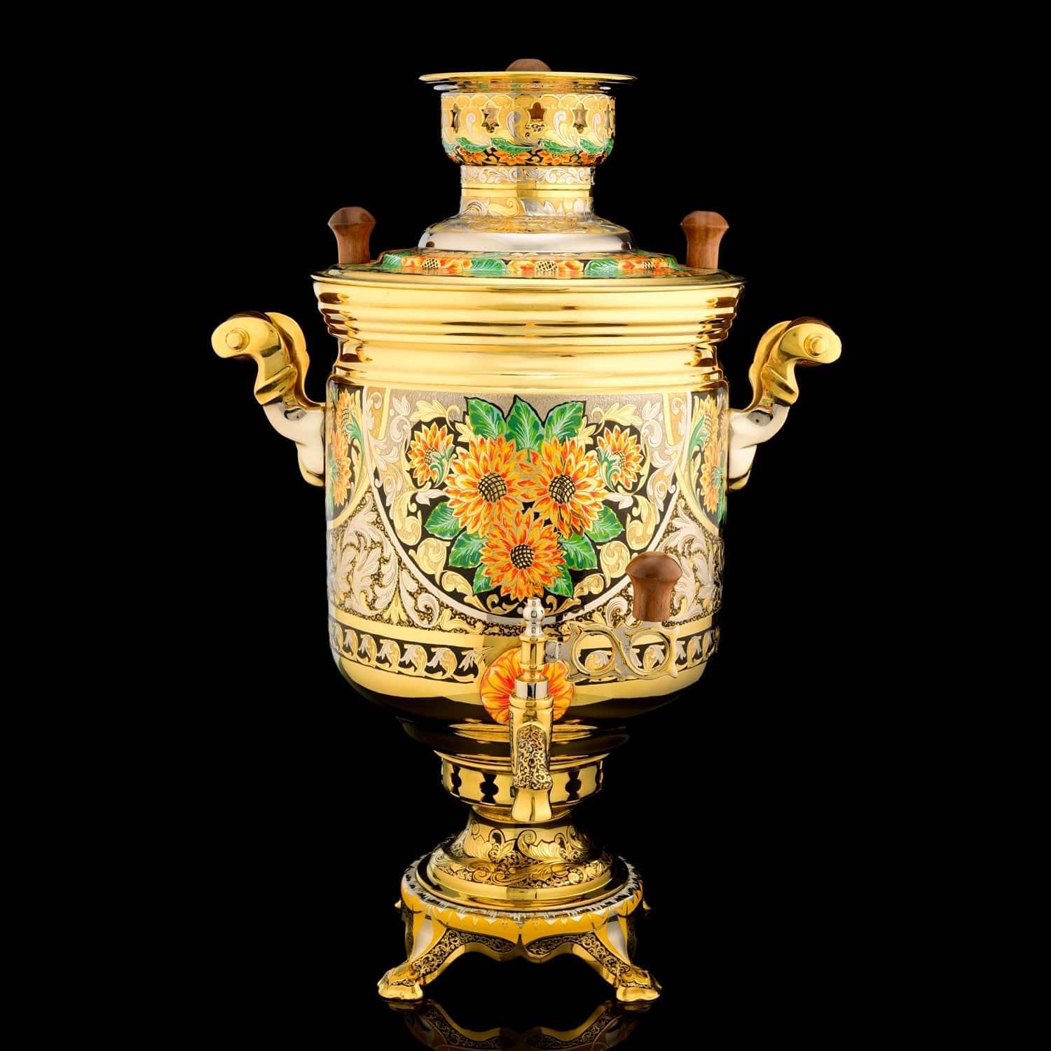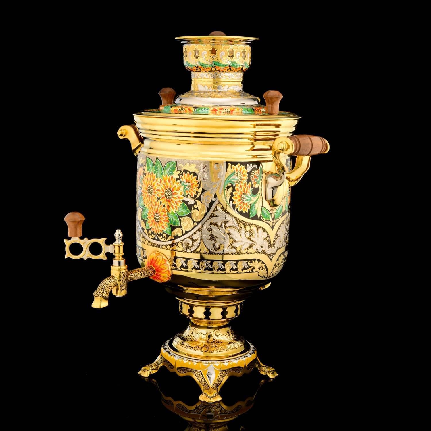 Самовар 5 литров позирует в композиции с чашками на круглом подносе. Корпуса чашек комбинированы: на чаши из русского "белого золота", фарфора надеты золотые "юбки" из металла.