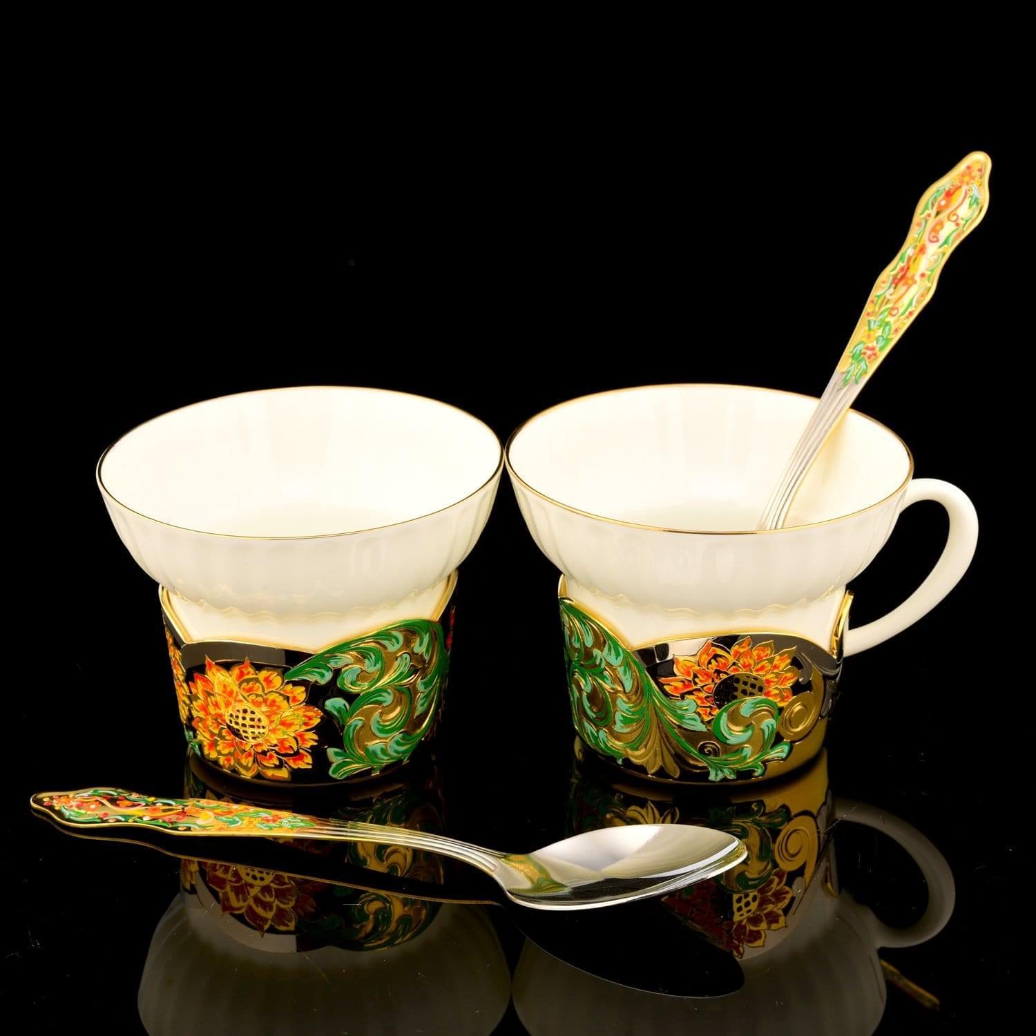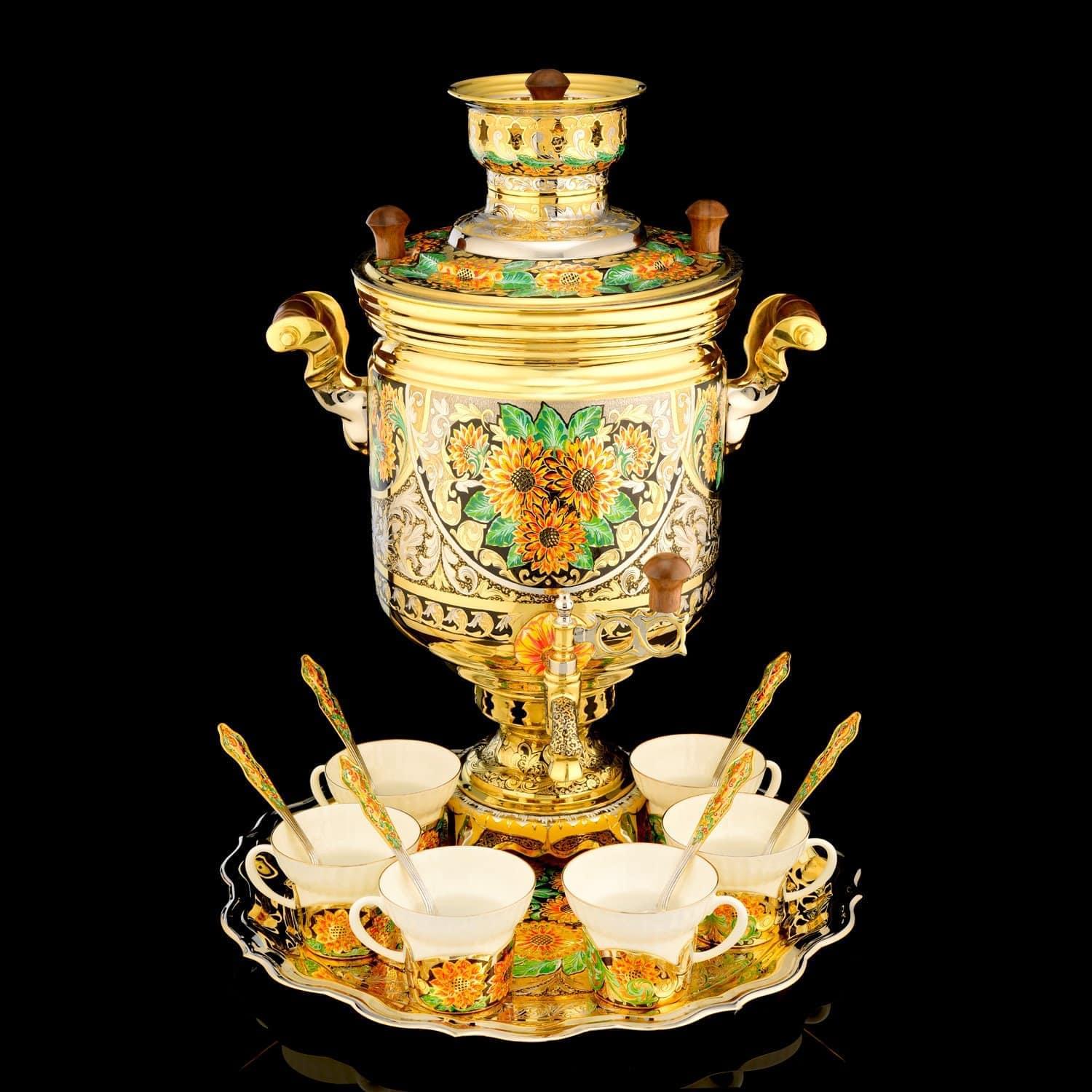 Набор посуды для чаепития на шесть персон сделан мастерами Златоуста - поставщиками элементов декора, элитной посуды, сувенирного оружия для главной резиденции президента России, Московского Кремля. Поднос, чашки и ложки изготовлены с использованием форм ИФЗ. Такой позолоченный самовар станет не только украшением интерьера, но и семейной реликвией, которая сможет передаваться из поколения в поколение