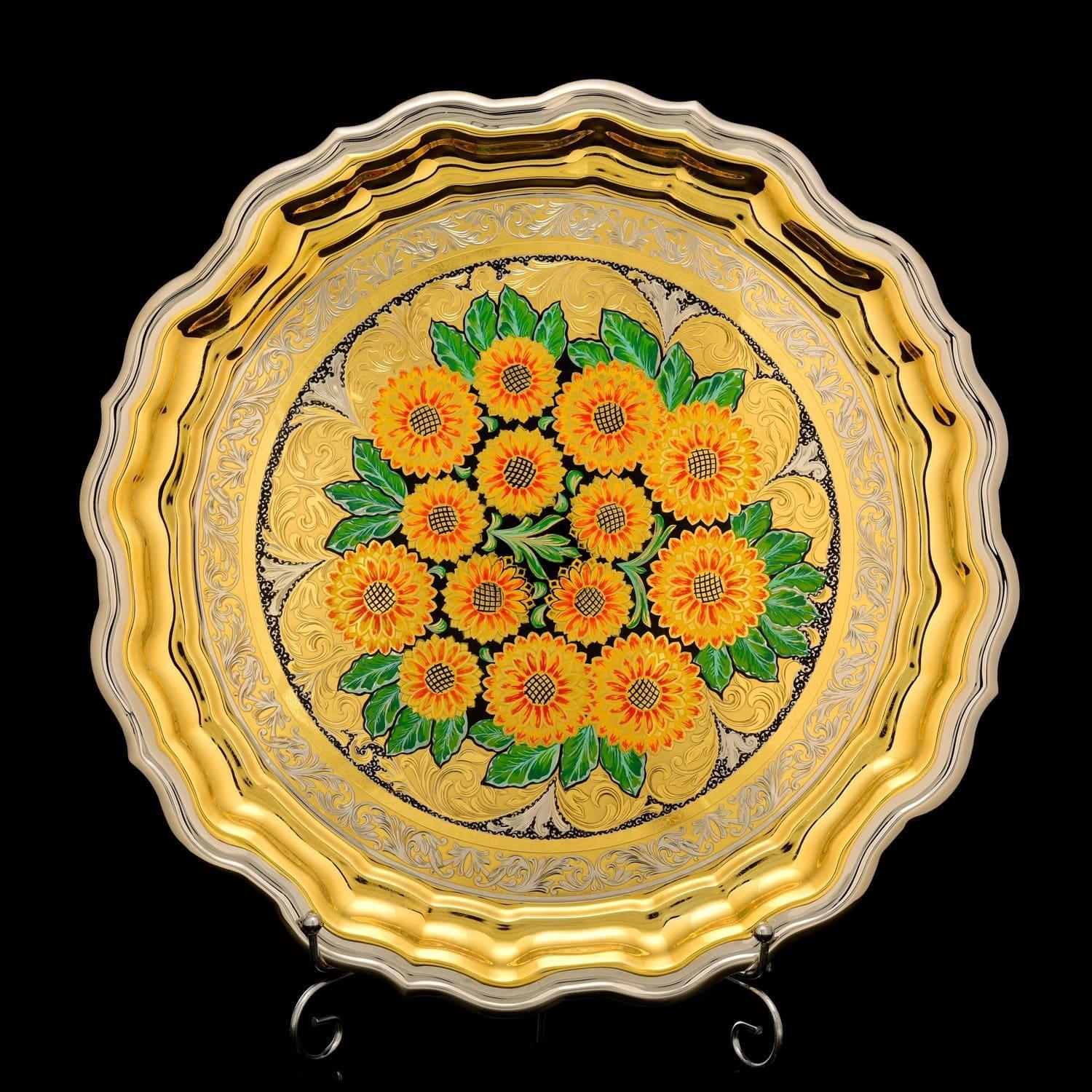 Корпуса самовара, подноса и "юбочек" украшены изображениями подсолнухов - цветов Солнца, символом плодородия и изобилия.