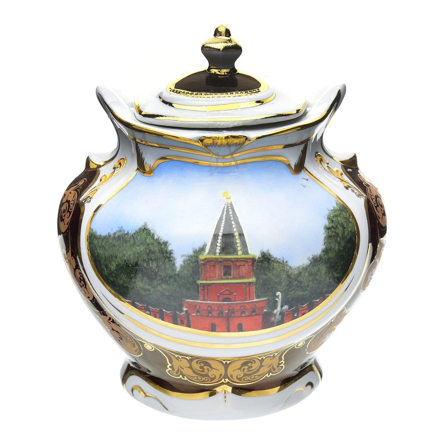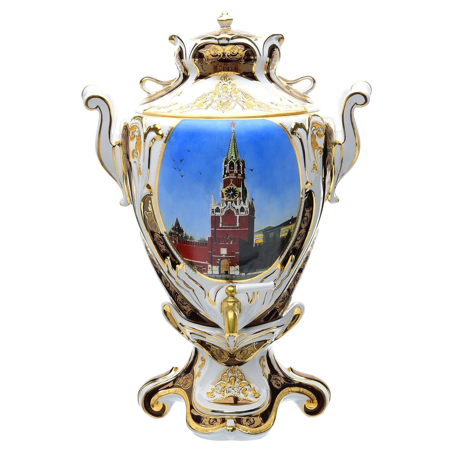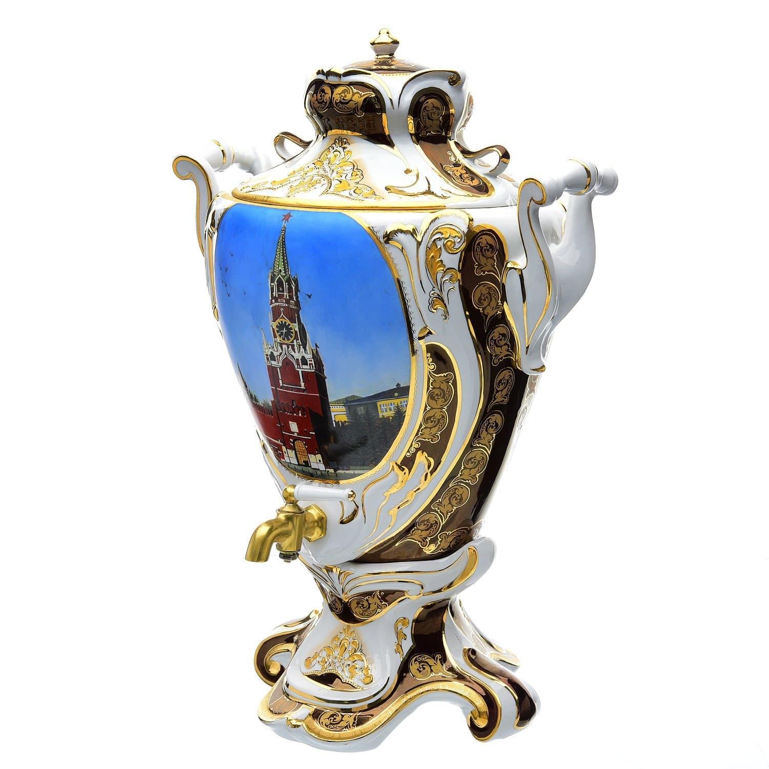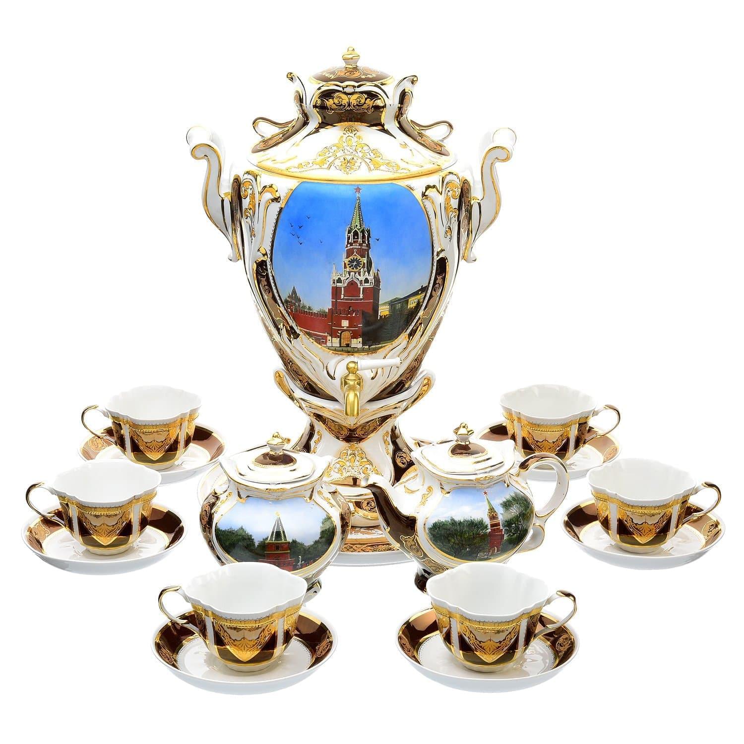 А вот и один из самых ярких ее образцов – роскошный самовар в наборе с сахарницей, заварочным чайником, чашечками, блюдцами и подносом. Эксклюзивный чайный ансамбль создан из дорогого, экологически чистого белоснежного фарфора. Каждый элемент набора расписан вручную в непревзойденном авторском стиле. Самовар украшен изображением Спасской башни. Заварочный чайник и сахарница – видами Кремля. Чашечки и поднос декорированы самобытным ярким узором в кофейно-шоколадных тонах. Особо стоит отметить то, как художник расставил акценты. Яркие элементы композиции мастер подчеркнул с помощью красивой позолоты и оригинального орнамента.