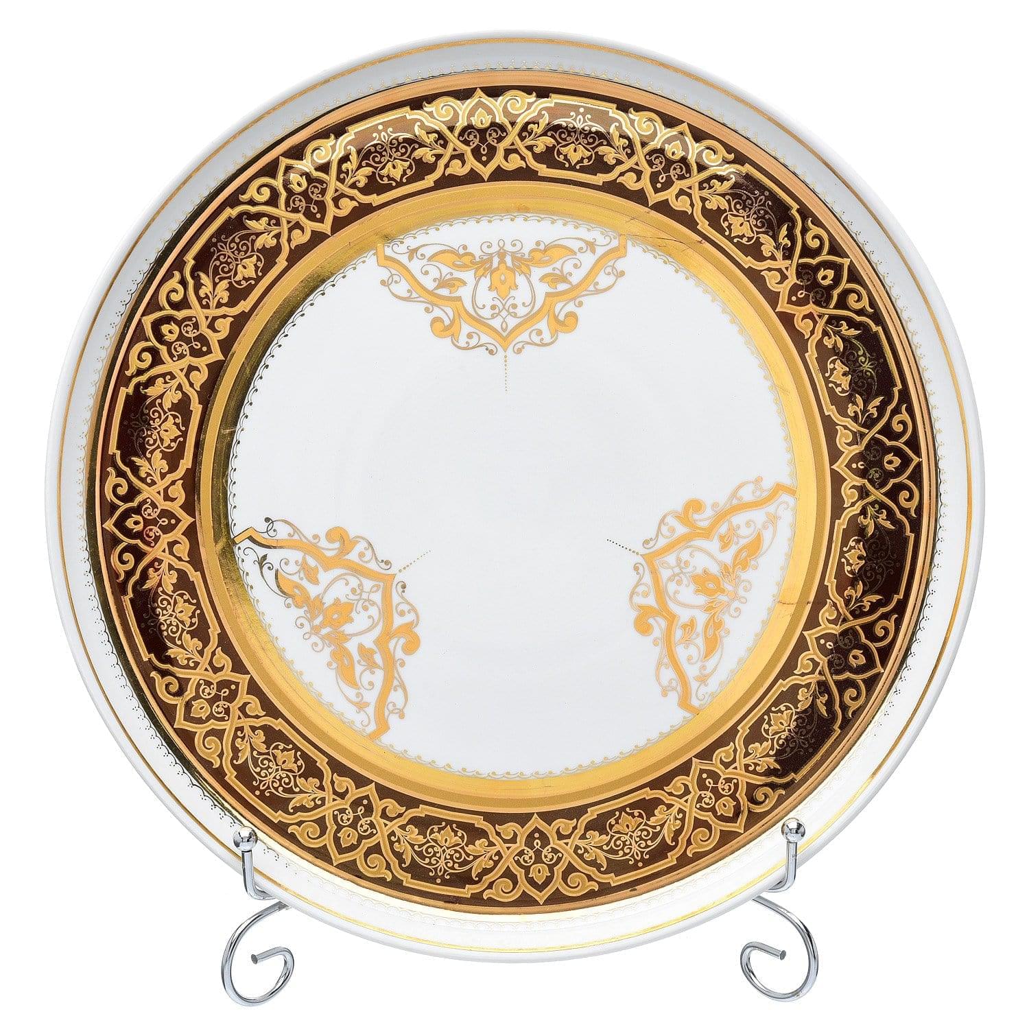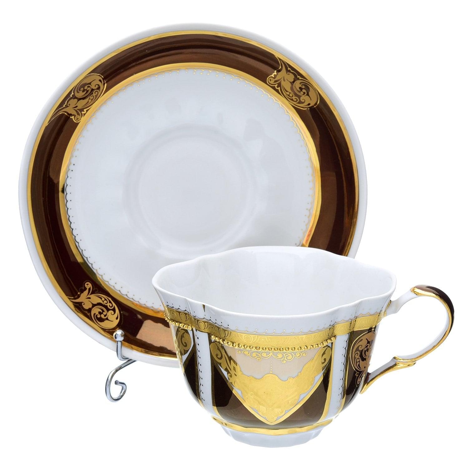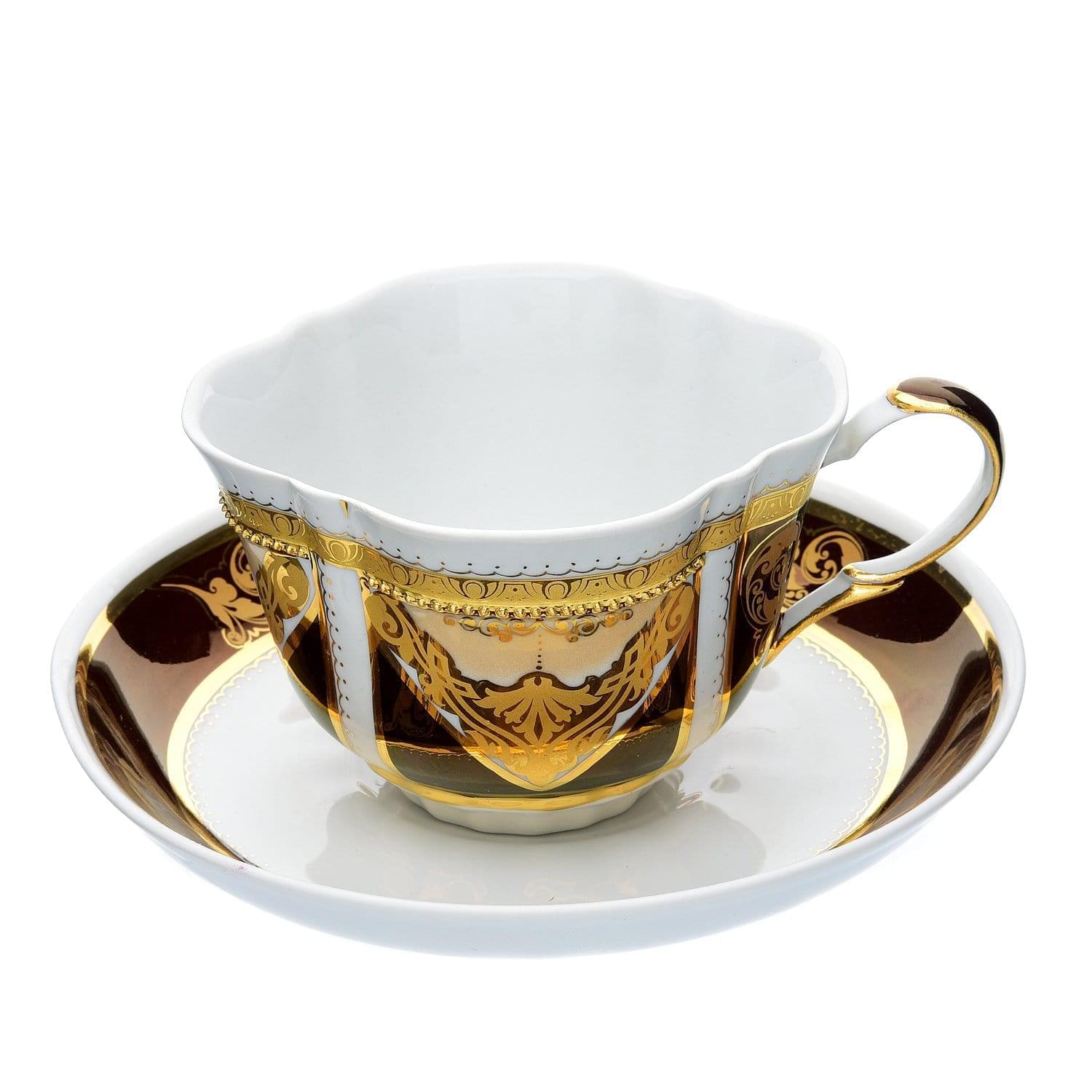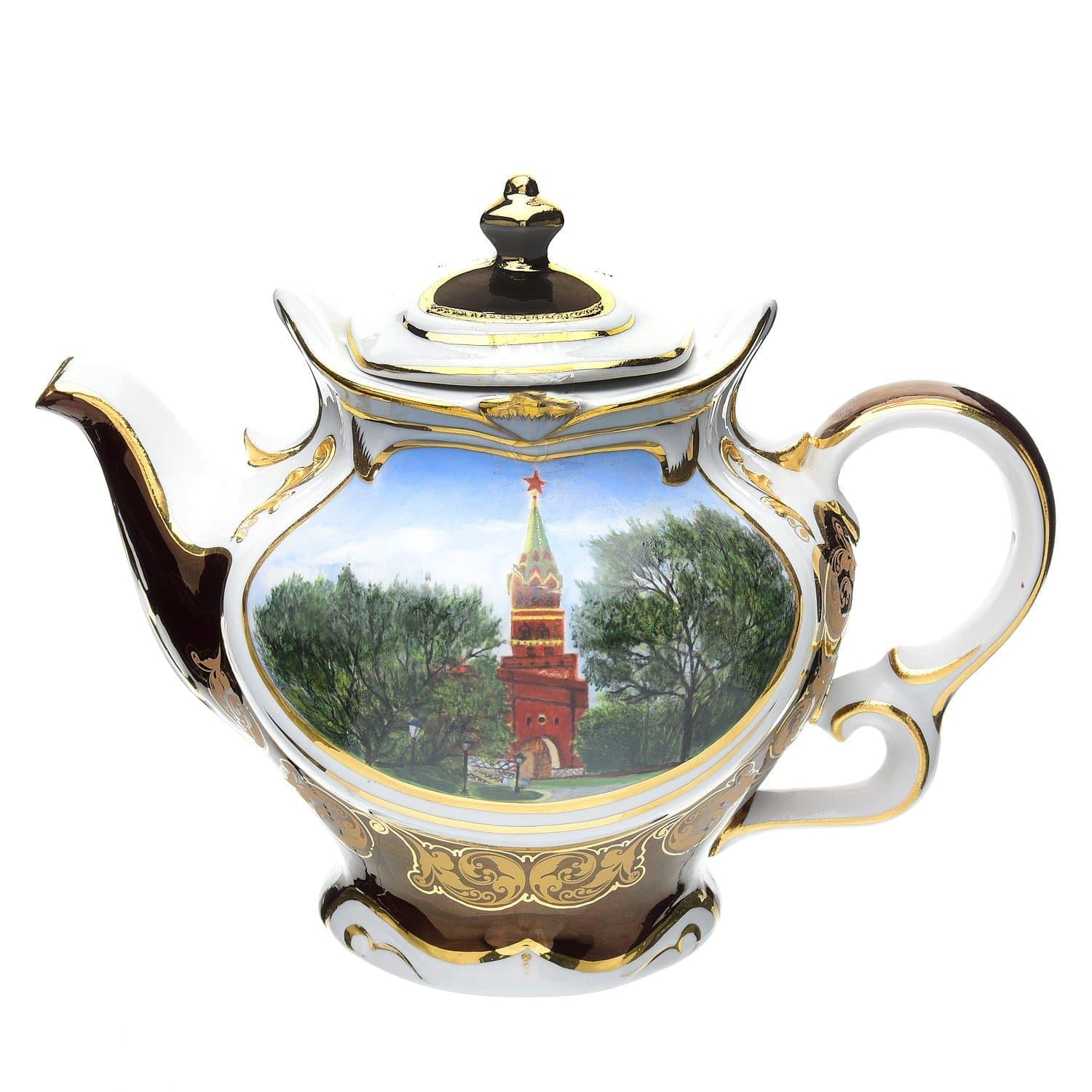 А вот и один из самых ярких ее образцов – роскошный самовар в наборе с сахарницей, заварочным чайником, чашечками, блюдцами и подносом. Эксклюзивный чайный ансамбль создан из дорогого, экологически чистого белоснежного фарфора. Каждый элемент набора расписан вручную в непревзойденном авторском стиле. Самовар украшен изображением Спасской башни. Заварочный чайник и сахарница – видами Кремля. Чашечки и поднос декорированы самобытным ярким узором в кофейно-шоколадных тонах. Особо стоит отметить то, как художник расставил акценты. Яркие элементы композиции мастер подчеркнул с помощью красивой позолоты и оригинального орнамента.