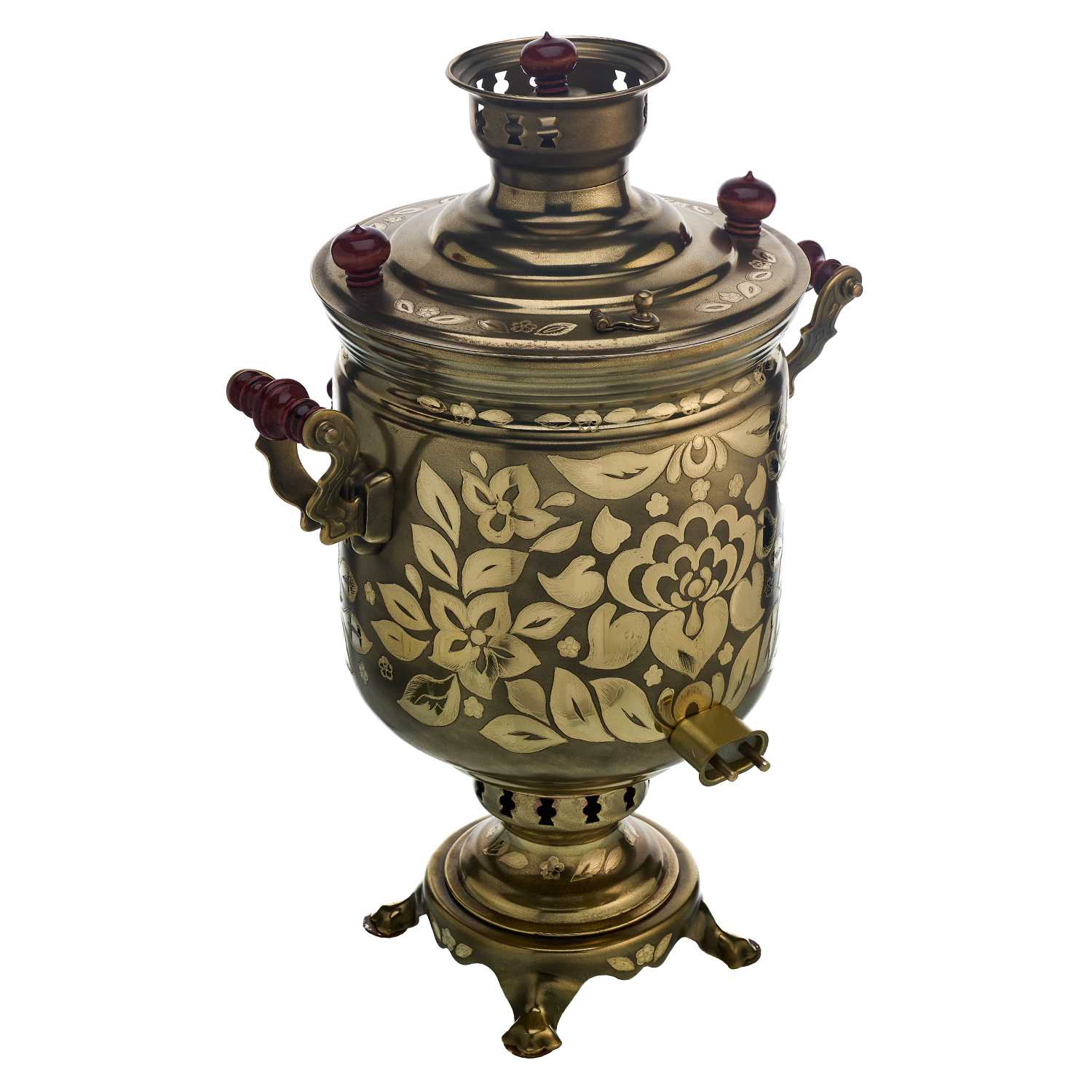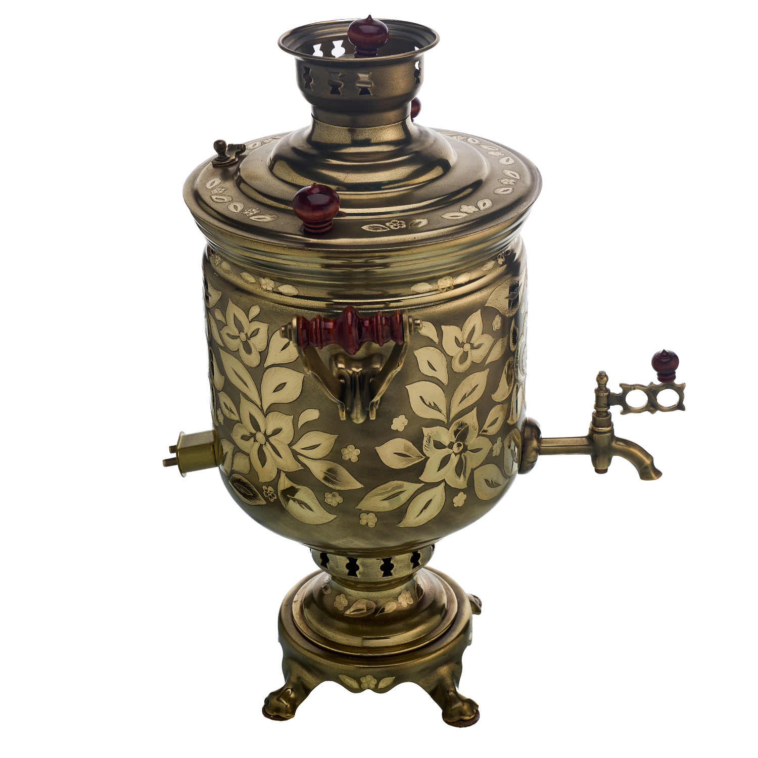 Самовар комбинированный (угольный и электрический) латунный толстостенный с деревянной полаченной фурнитурой. Шнур в комплекте. Гравировка художественная ручная.