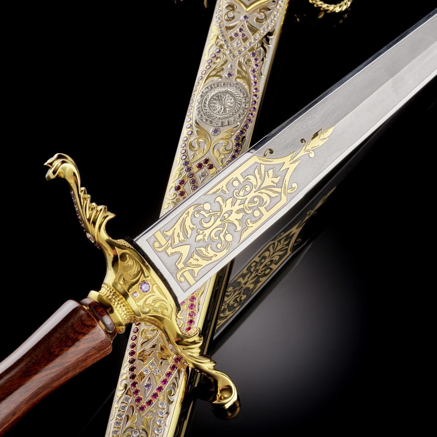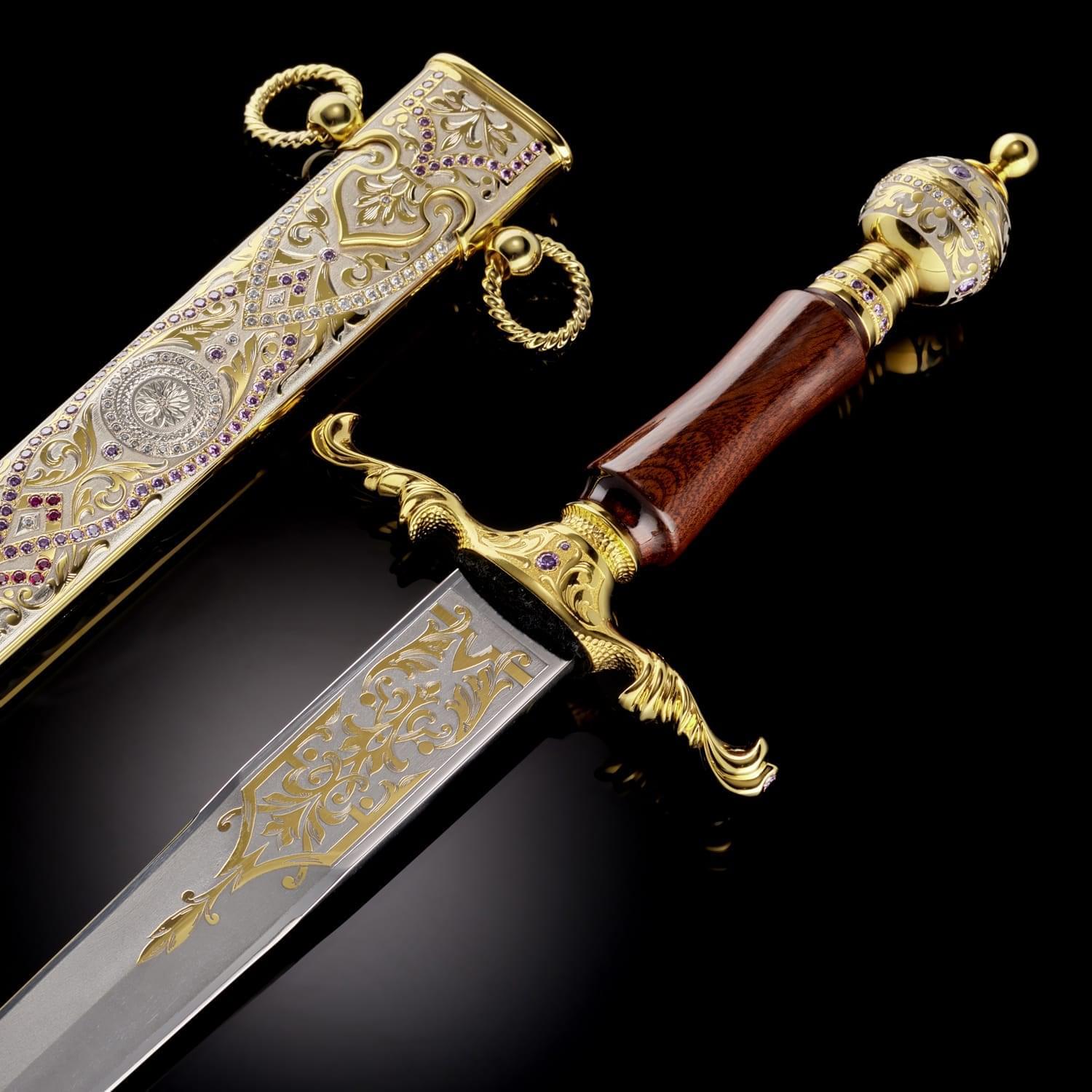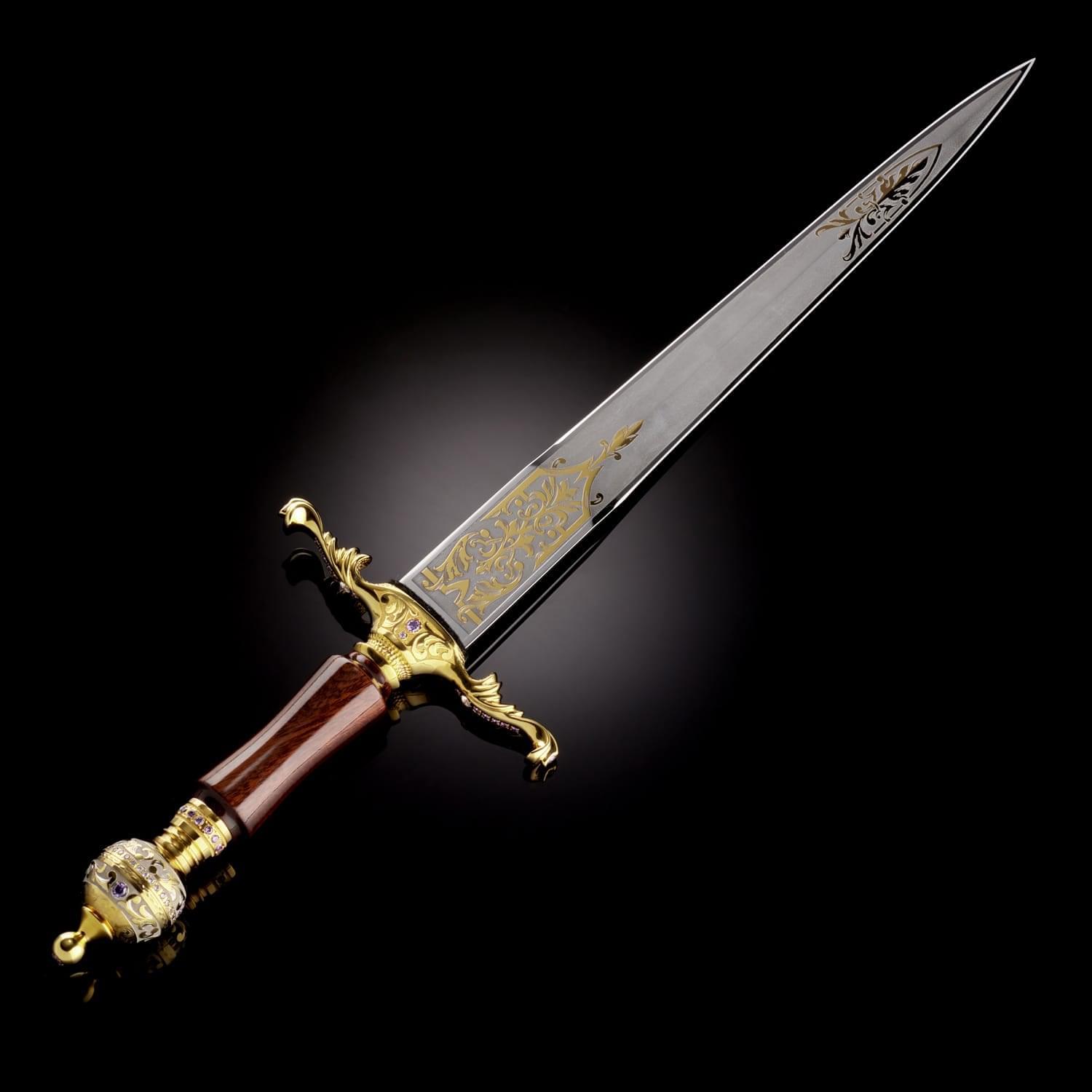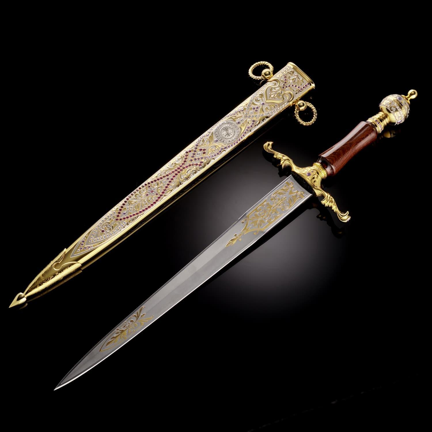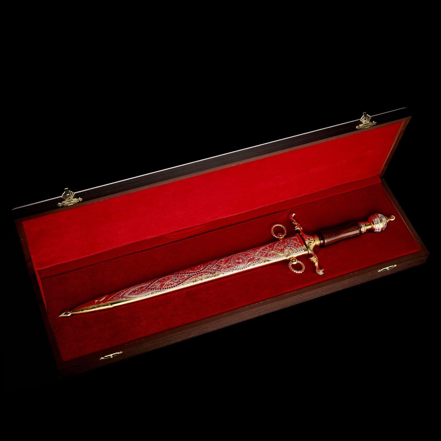 С середины XV века в Бургундии немецкоязычная знать пользовалась охотничьим мечом для добивания раненого зверя или самообороны. Это был больше статусный предмет, нежели элемент охотничьего костюма. Массивные мечи не имели эфесов, а их рукояти были так длинны, что оружием можно было действовать обеими руками. Имелись ножны с гнездами, где хранили два ножа (режущий и для разделки туши) и шило для отделения жил. Иногда добавляли гнезда для столовых приборов. В начале XVI века меч превратился в охотничий тесак, названный оленьим ножом (хиршфангер). Клинок укоротили и сделали легче. Рукоять изготавливали из рога оленя с крестовиной в виде ног косули. Хиршфангер распространился во всех германских государствах. Красота и изящество оленьего ножа привлекли и военных. Возрождение кинжал пережил во времена Третьего рейха. Размеры: общая длина - 52,5 см. ширина - 11,5 см. длина клинка - 30 см. ширина клинка - 2,8 см. толщина клинка - 0,4 см. коробка: длина - 56 см. ширина - 15,5 см. высота - 4,5 см.