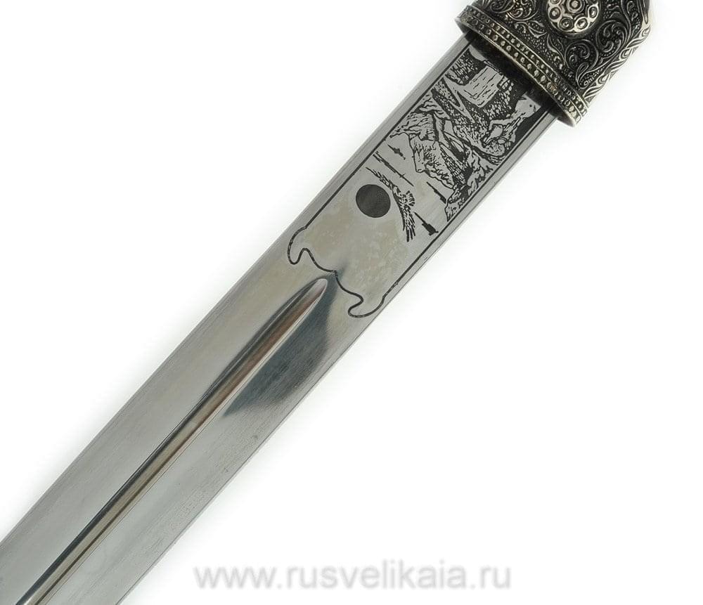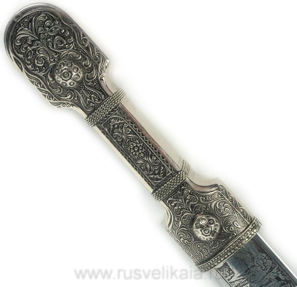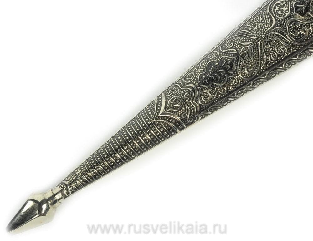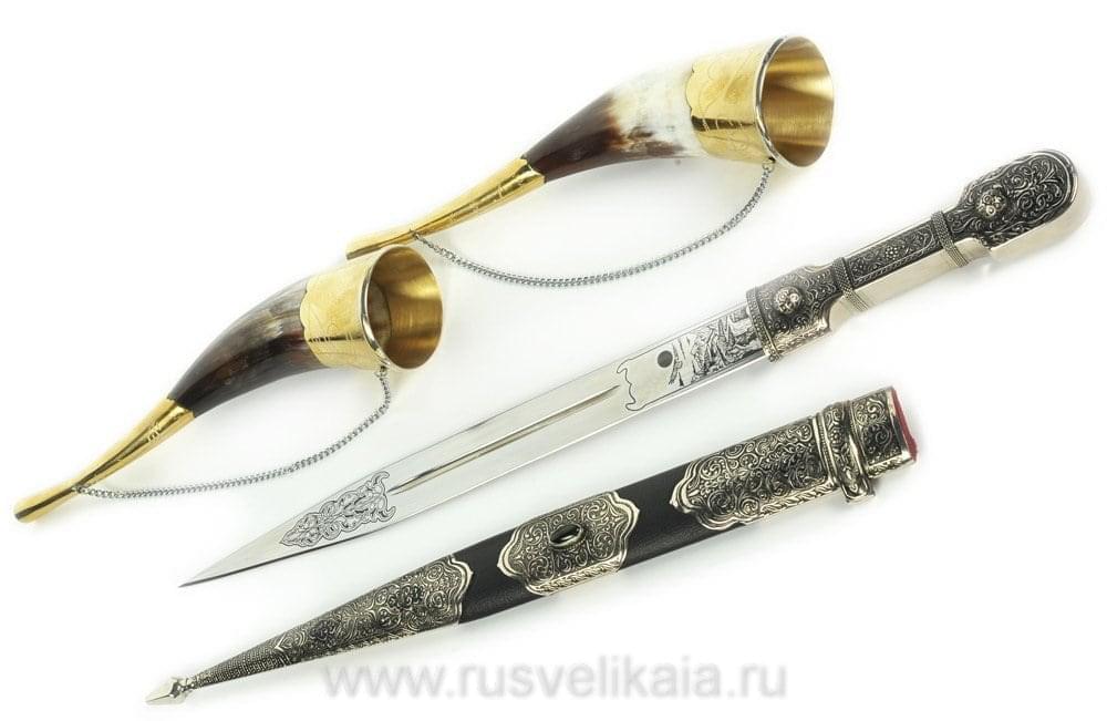 Кинжалом называют холодное контактное оружие с коротким (до 40 см.) прямым или изогнутым заточенным клинком. Чаще всего используется для ближнего боя, реже - для метания. Древние воины решили, что им нужно колющее оружие, которое можно носить с собой и удобно действовать в ситуациях, когда нет меча, сабли, палицы или копья. Первые кинжалы делались из дерева и кости (необработанных рогов животных). С переходом к металлургии кинжалы стали металлическими. Медные «мечи» микенской эпохи уже обладали режущей кромкой, но были слишком малы (клинок 20-30 см.). Для изготовления более длинного оружия медь не годилась. После того, как железо сменило медь и бронза, маленькие «мечи» применялись ассирийцами, греками и македонцами. Кинжал переводится с арабского (ханджар), тюркского (канжал - лист железа (металла), [кан] «кровь» + [жар] «пороть, вспарывать»). Восточный «киджар», по изгибу клинка, подражает коровьему рогу, только в плоской форме из стали. В отложениях палеолитической эпохи (во Франции) обнаружили ветви оленьих рогов, отделанные в виде кинжала. В Индии в 19 веке было в ходу оружие из двух острых рогов, соединенных основаниями металлической бляхой для защиты руки. Им пользовались в рукопашном бою для нанесения ударов направо и налево. В неолитическую эпоху делали прямые кинжалы из кремня, прототипы медных, экземпляры которых нашли в Сибири. Материалы: сплав стали, кожа, мельхиор. Размеры: общая длина - 560 мм. длина клинка - 330 мм. наибольшая ширина клинка - 32 мм. толщина клинка - 3 мм. твердость клинка, HRC - 30 Рога для вина Материал: рог, медь, гальванопластика. Размеры: длина - 22,5 см. и 25 см.