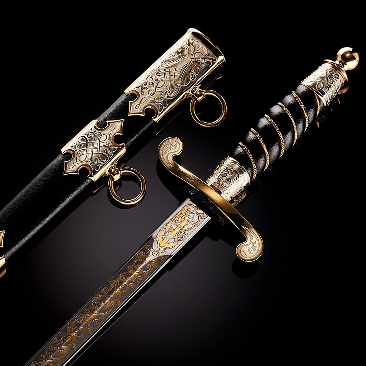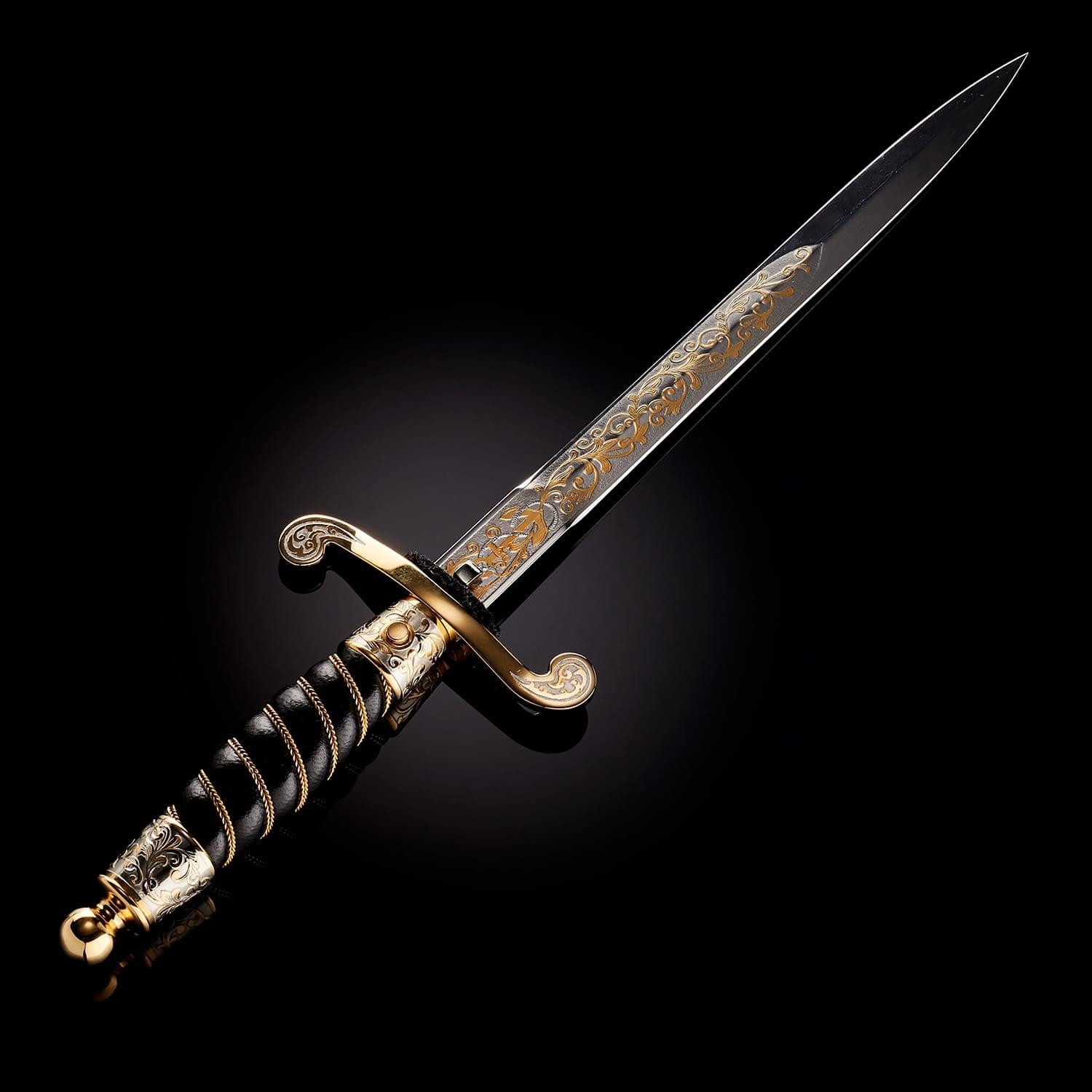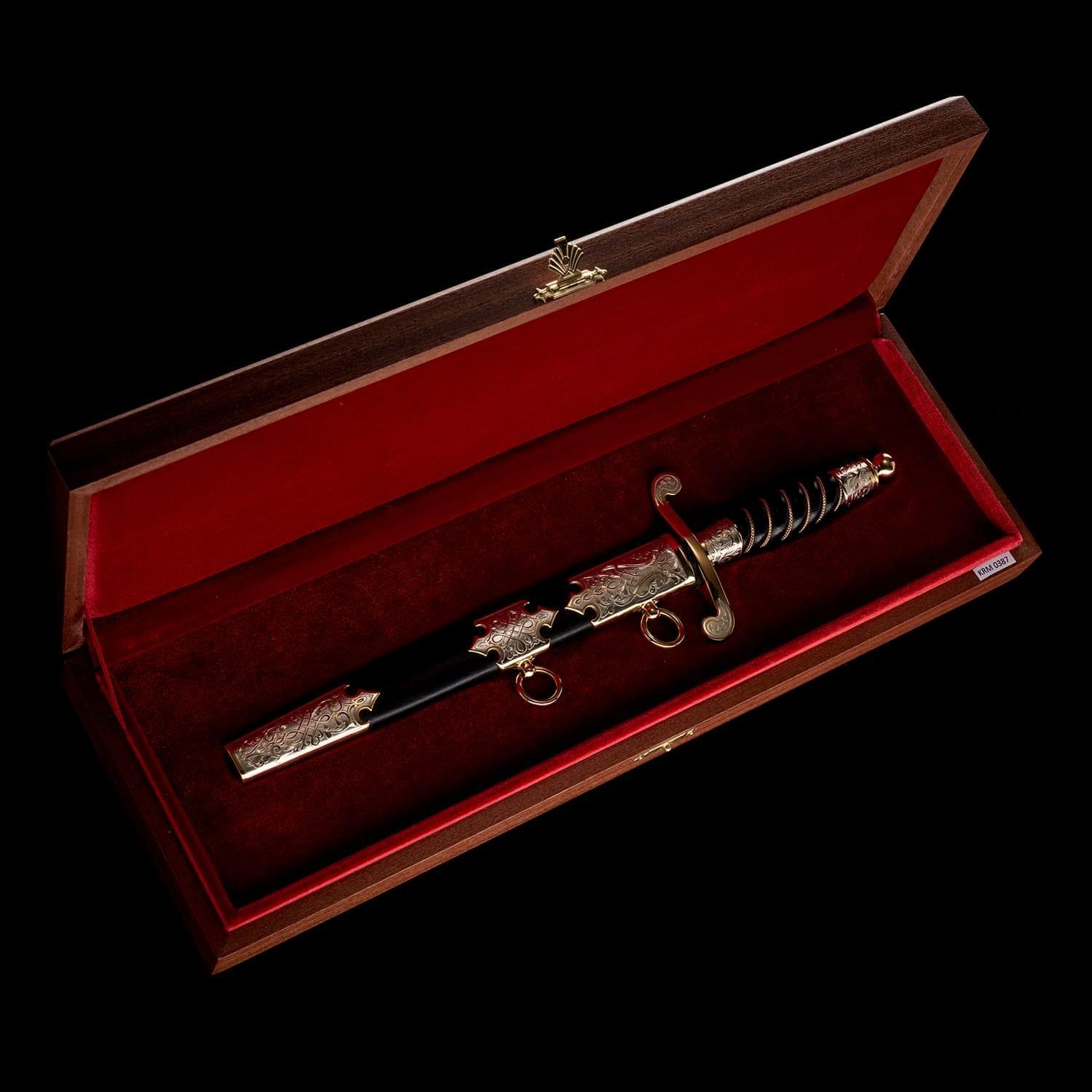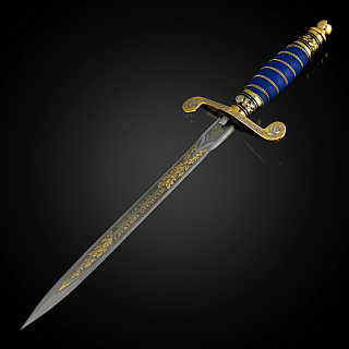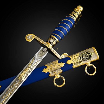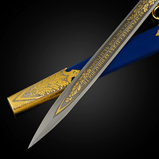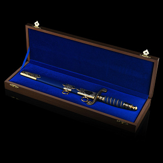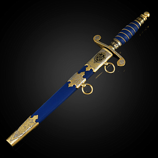 Кортиком называют холодное колющее оружие, прямой тонкий кинжал с клинком обоюдоострой формы, лезвия которого не заточены. Носится в ножнах на поясном ремне снаряжения или парадном поясе, на специальных ремешках. Сегодня входит в состав формы одежды в военно-морских флотах многих стран. В средневековой Польше народ использовал в качестве оружия большие ножи - корды. В немецком языке оно считалось домашним оружием. В XIX веке, когда в военно-морских флотах европейских стран офицеры носили форменный кинжал, кортик получил в Польше название описанного выше оружия kordzik. Согласно другой версии, слово происходит от нидерландского korte (короткий) или от испанского Corta (резак). Применялся кортик с конца 16 века как оружие в абордажном бою и был тогда длинным и серьезным оружием. В дореволюционной России его носили офицеры и гражданские чиновники морского ведомства. Во времена СССР он стал элементом парадной формы офицеров и мичманов ВМФ. По традиции кортик в России как личное оружие вместе с лейтенантскими погонами вручается выпускникам высших военно-морских училищ вместе с дипломом об окончании ВУЗа и присвоением офицерского звания. В ВМФ кортики носят мичманы. Материалы: сталь ЭИ-107 (40Х10С2М), латунь, никель, золото 999,9*, кожа Размеры: Общая длина - 33 см. Длина клинка - 21 см. Ширина клинка - 1,6 см.