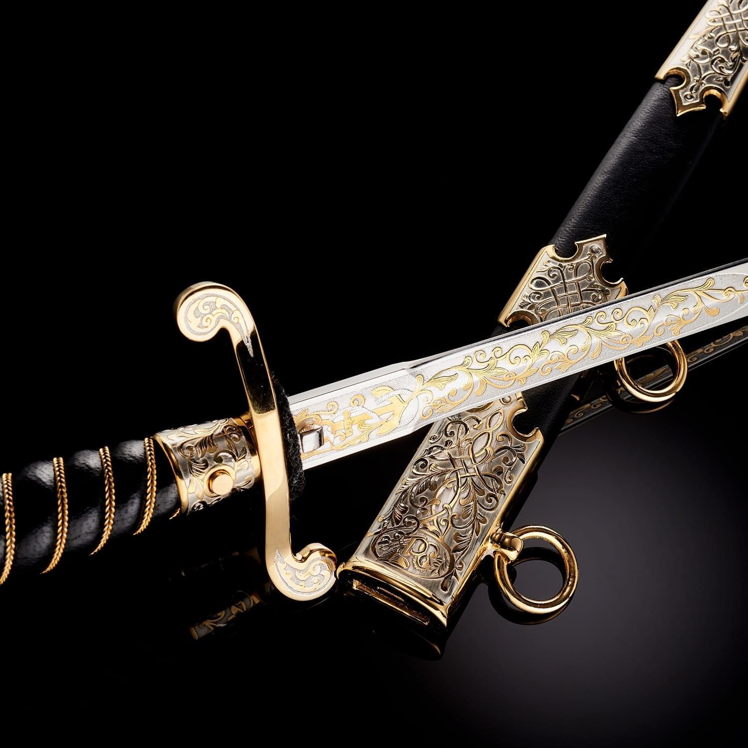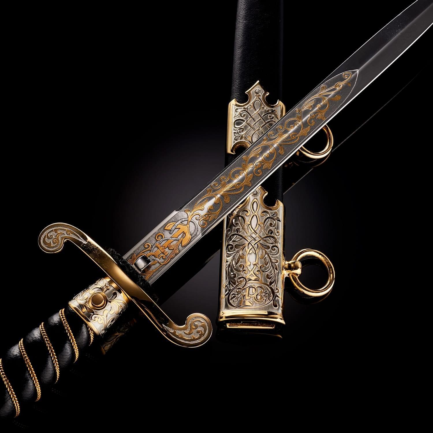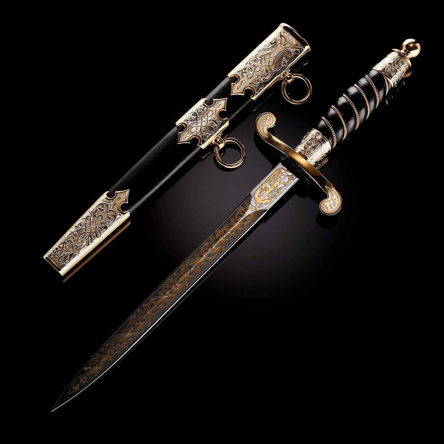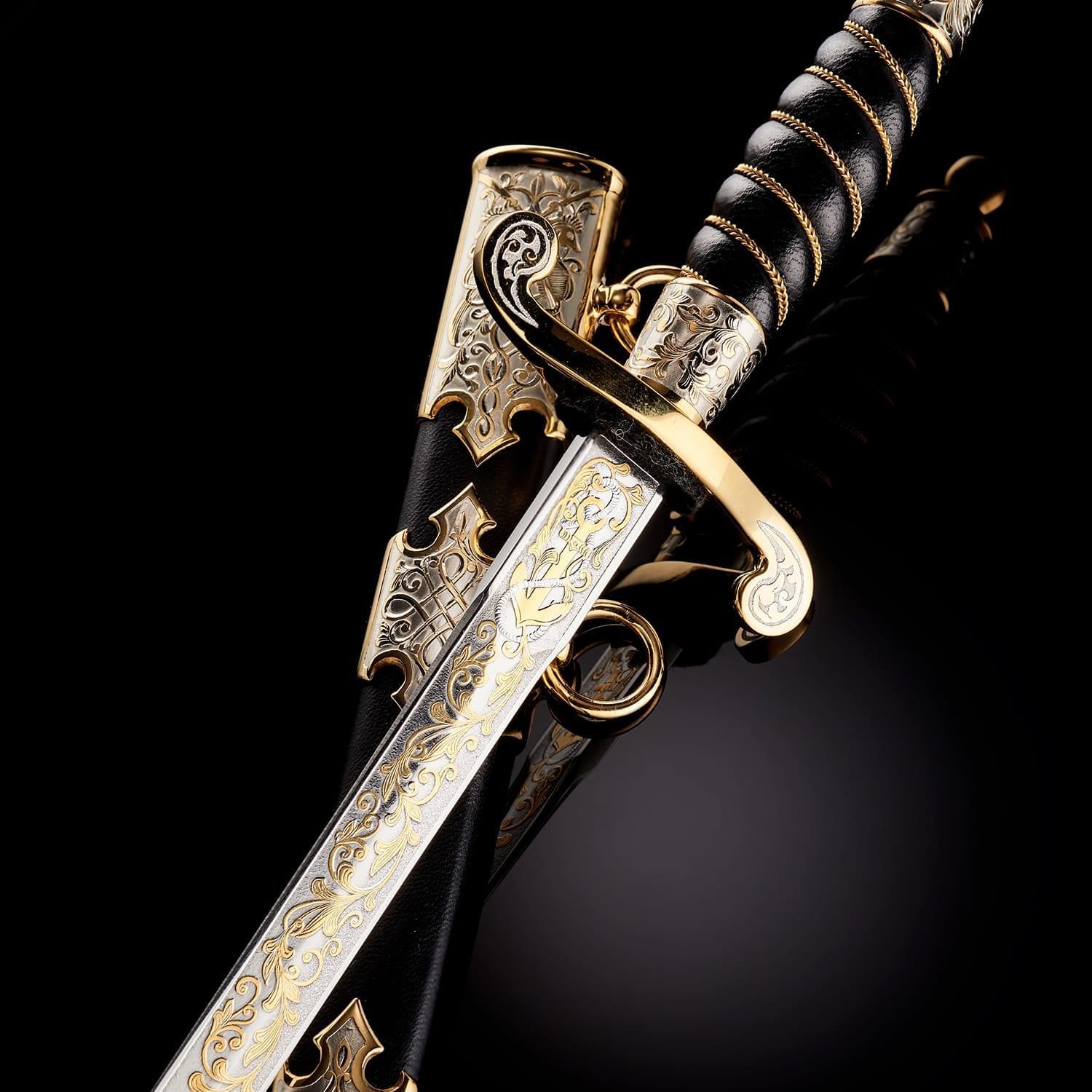 Кортиком называют холодное колющее оружие, прямой тонкий кинжал с клинком обоюдоострой формы, лезвия которого не заточены. Носится в ножнах на поясном ремне снаряжения или парадном поясе, на специальных ремешках. Сегодня входит в состав формы одежды в военно-морских флотах многих стран. В средневековой Польше народ использовал в качестве оружия большие ножи - корды. В немецком языке оно считалось домашним оружием. В XIX веке, когда в военно-морских флотах европейских стран офицеры носили форменный кинжал, кортик получил в Польше название описанного выше оружия kordzik. Согласно другой версии, слово происходит от нидерландского korte (короткий) или от испанского Corta (резак). Применялся кортик с конца 16 века как оружие в абордажном бою и был тогда длинным и серьезным оружием. В дореволюционной России его носили офицеры и гражданские чиновники морского ведомства. Во времена СССР он стал элементом парадной формы офицеров и мичманов ВМФ. По традиции кортик в России как личное оружие вместе с лейтенантскими погонами вручается выпускникам высших военно-морских училищ вместе с дипломом об окончании ВУЗа и присвоением офицерского звания. В ВМФ кортики носят мичманы. Материалы: сталь ЭИ-107 (40Х10С2М), латунь, никель, золото 999,9*, кожа Размеры: Общая длина - 33 см. Длина клинка - 21 см. Ширина клинка - 1,6 см.