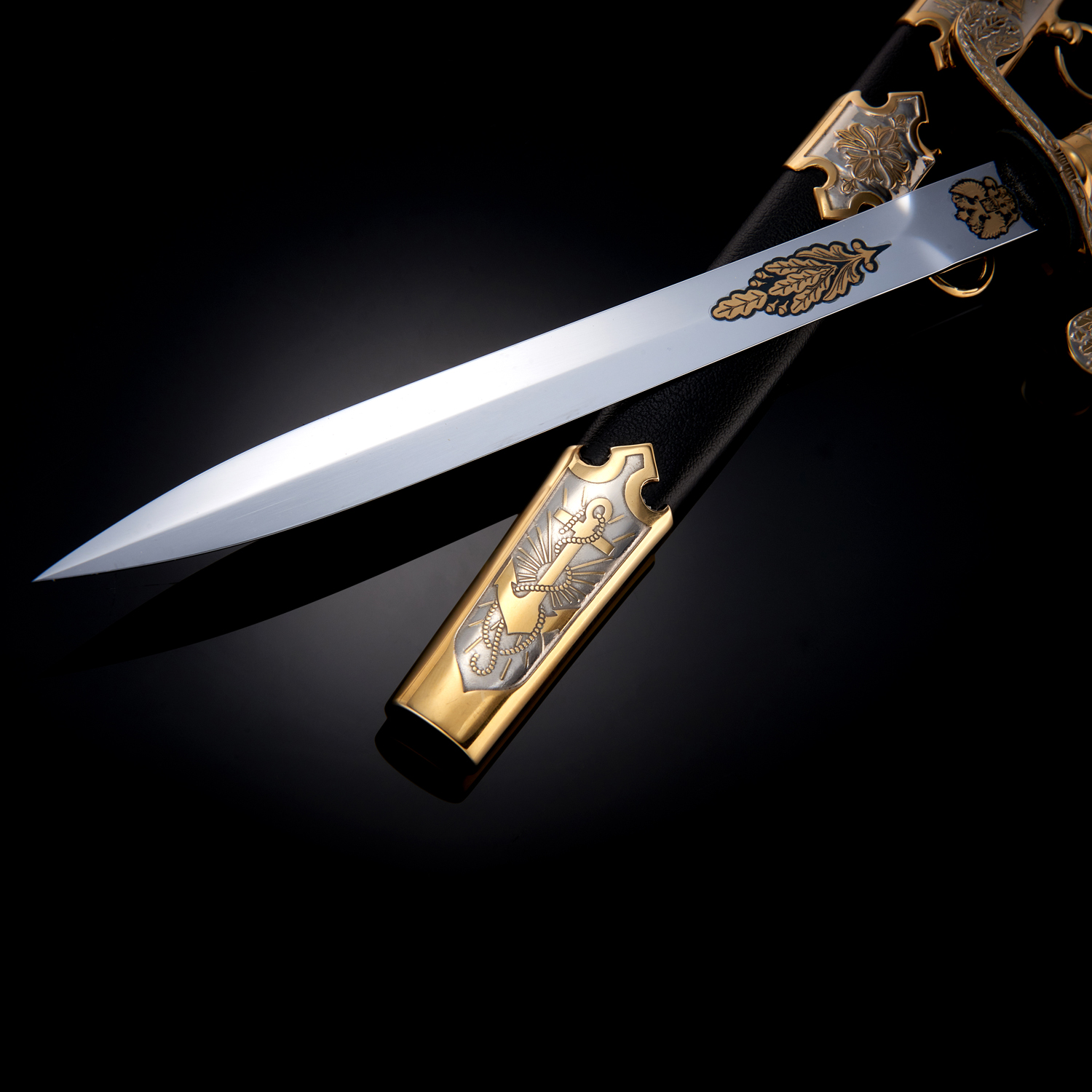 Кортик возник в конце 16 века как абордажное оружие. В первой половине XVI века морские державы Испания и Португалия вооружили своих моряков длинными тонкими рапирами, приспособленными для действий на верхней палубе против османских пиратов. Турки, вооруженные короткими кривыми саблями и ятаганами, не могли противостоять испанцам с длинными рапирами. Вслед за ними трофейными рапирами вооружились приватиры, «морские волки» Елизаветы I. С начала XVII века кортики стали очень популярны. Мечи, сабли, шпаги и рапиры оставались у военных. Дворяне вместо длинной и тяжелой боевой шпаги предпочитали носить и использовать короткий, легкий, удобный и красивый кортик. В Испании, Франции кортики не были популярны, так как мужчины выясняли отношения на дуэлях с рапирами и шпагами. Первыми моряками, вооружившимися кортиками, стали англичане и голландцы. Они попали на корабли благодаря буканьерам. Для разделки туш убитых животных и приготовления копченого мяса (букана) подходили охотничьи тесаки. В России кортик появился в конце XVI века как оружие офицерского состава военного флота. Петр Первый любил носить флотский кортик на перевязи. В Будапештском национальном музее хранился принадлежавший ему кортик с украшениями на клинке, символизирующими победу России над Швецией. На рукояти и клинке был выгравирован хвалебный гимн Петру I: «Виват нашему монарху». Русский морской кортик был настолько красив и изящен, что германский кайзер Вильгельм II, обходя в 1902 году строй экипажа русского крейсера «Варяг», приказал ввести для офицеров своего «Флота открытого моря» кортик по русскому образцу. Материал: сталь 65 г., золото, никель,кожа. Размер: длина (общая) 35 см. длина клинка 21,5 см. ширина клинка 1,7 см. Техника исполнения: токарные работы, рисовка кистью, гравировка иглой по лаку, травление, гравировка резцом, полировка, никелирование, золочение, хрусталь. В изделии использовались традиционные методы обработки и украшения Златоустовской гравюры на металле.