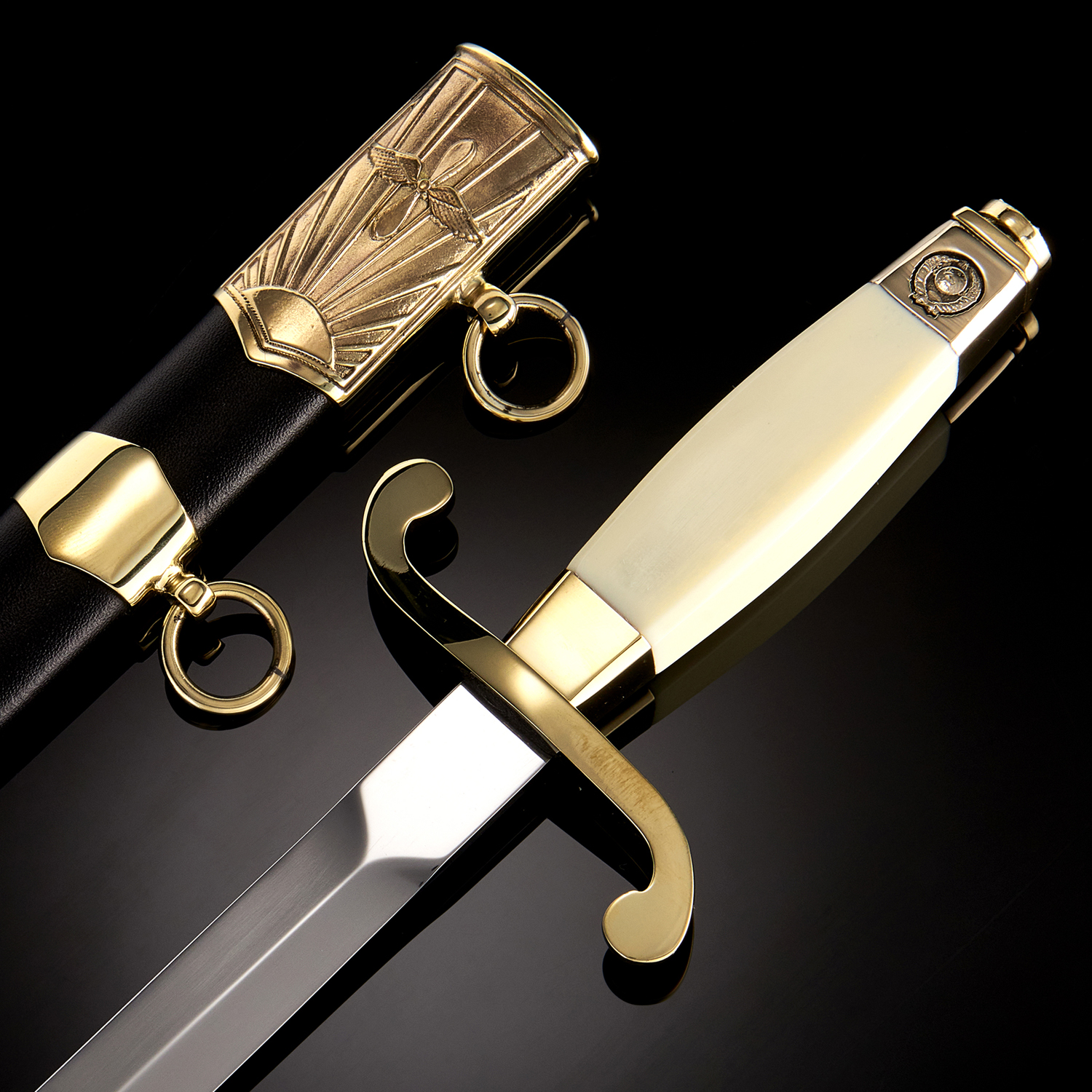 Офицерский кортик в ножнах с изображением Спасской башни Московского Кремля, главной резиденции президента РФ на латунном устье создан в техниках российского оружейного промысла. С Московским Кремлем 1482 года постройки связаны любопытные факты. Это не только крупнейшая средневековая крепость в России, но и наибольшая действующая крепость Европе. Кремлевские стены изначально были белыми. Они «приобрели» красный кирпич в конце XIX века. За 2235-метровыми стенами находятся 5 площадей и 18 зданий, среди которых популярны Спасская башня, Колокольня Ивана Великого, Успенский собор, Троицкая башня и Теремной дворец. Во время войны Кремль был замаскирован, чтобы выглядеть как жилой строительный блок. Купола церкви и знаменитые зеленые башни были окрашены в серый и коричневый цвета, поддельные двери и окна приделали к стенам Кремля, а Красную площадь обременили деревянными конструкциями. В Московском Кремле находятся самые большие в мире колокол и пушка. В 1735 году из металлического литья был изготовлен колокол высотой 6,14 метров, царь-пушка весом 39,312 тонны была потеряна в 1586 году и не использовалась в войне.