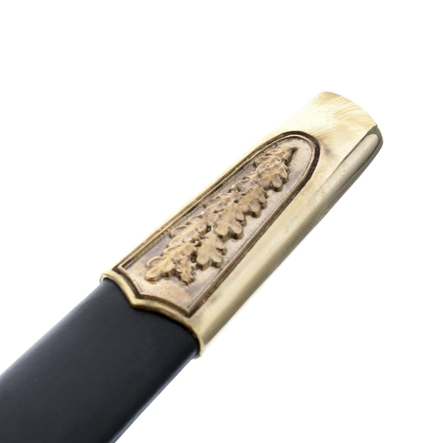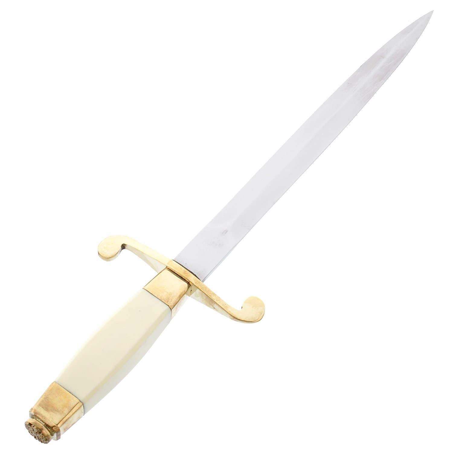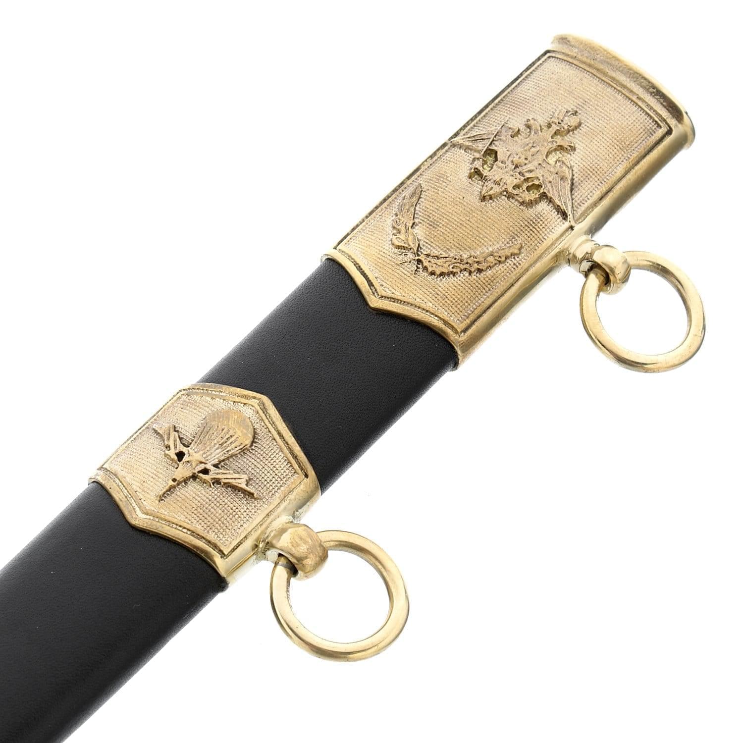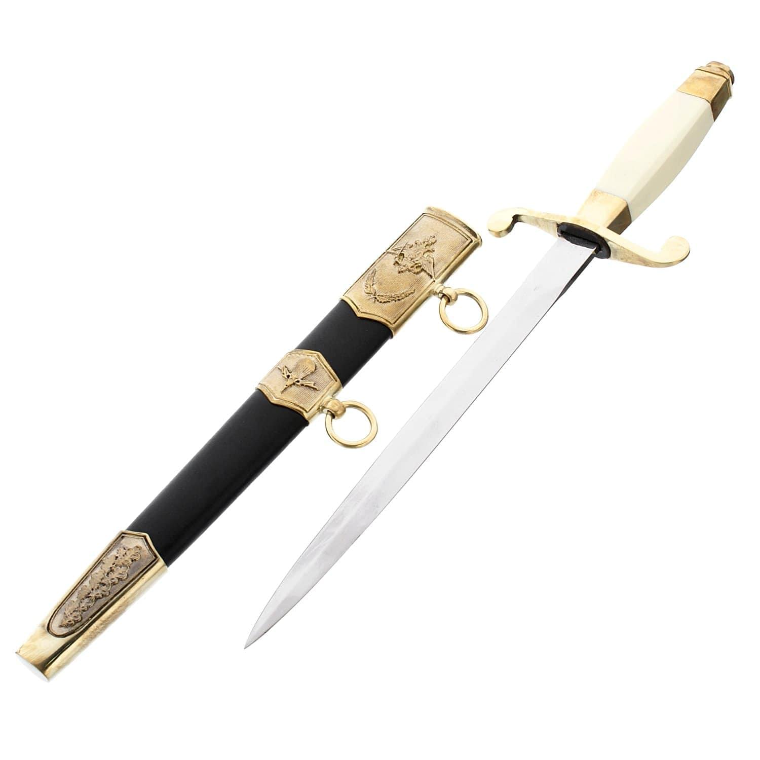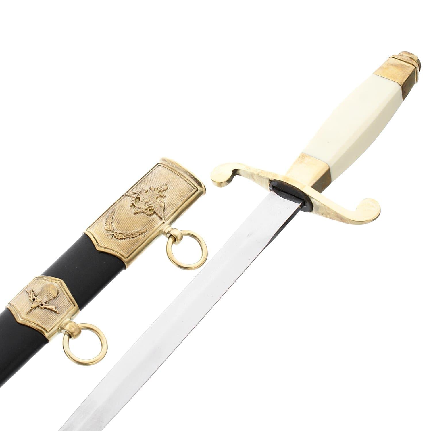Петр Первый любил носить флотский кортик на перевязи. В Будапештском национальном музее хранился принадлежавший ему кортик с украшениями на клинке, символизирующими победу России над Швецией. На рукояти и клинке был выгравирован хвалебный гимн Петру I: «Виват нашему монарху». Кроме морских офицеров, в 18 веке кортик носили и служащие сухопутных войск. В 1730 году он заменил шпагу у нестроевых армейских чинов. В 19 веке кортики дополняли форменную одежду чинов ремонтной телеграфной стражи. В 19 веке 39-сантиметровый кортик появился и на русском торговом флоте. Его украшали символы в виде львиных голов, заимствованные у герба русских царей династии Романовых. Русский морской кортик был настолько красив и изящен, что германский кайзер Вильгельм II, обходя в 1902 году строй экипажа русского крейсера «Варяг», приказал ввести для офицеров своего «Флота открытого моря» кортик по русскому образцу. В 80-х годах 19 века его заимствовали японцы, сделавшие его похожим на самурайский меч. В 1914 году приказом по военному ведомству кортики присвоили офицерам авиации, минных рот и автомобильных частей. В XIX веке кортик был прилагался к форменной одежде русских почтальонов. Напомним: в России День Воздушно-десантных войск отмечается ежегодно 2 августа. Материал: сталь 65Х13, твердость клинка менее 25HRC, бронза, латунь, кожа. Размеры: общая длина 31,5 см. длина клинка 21 см.