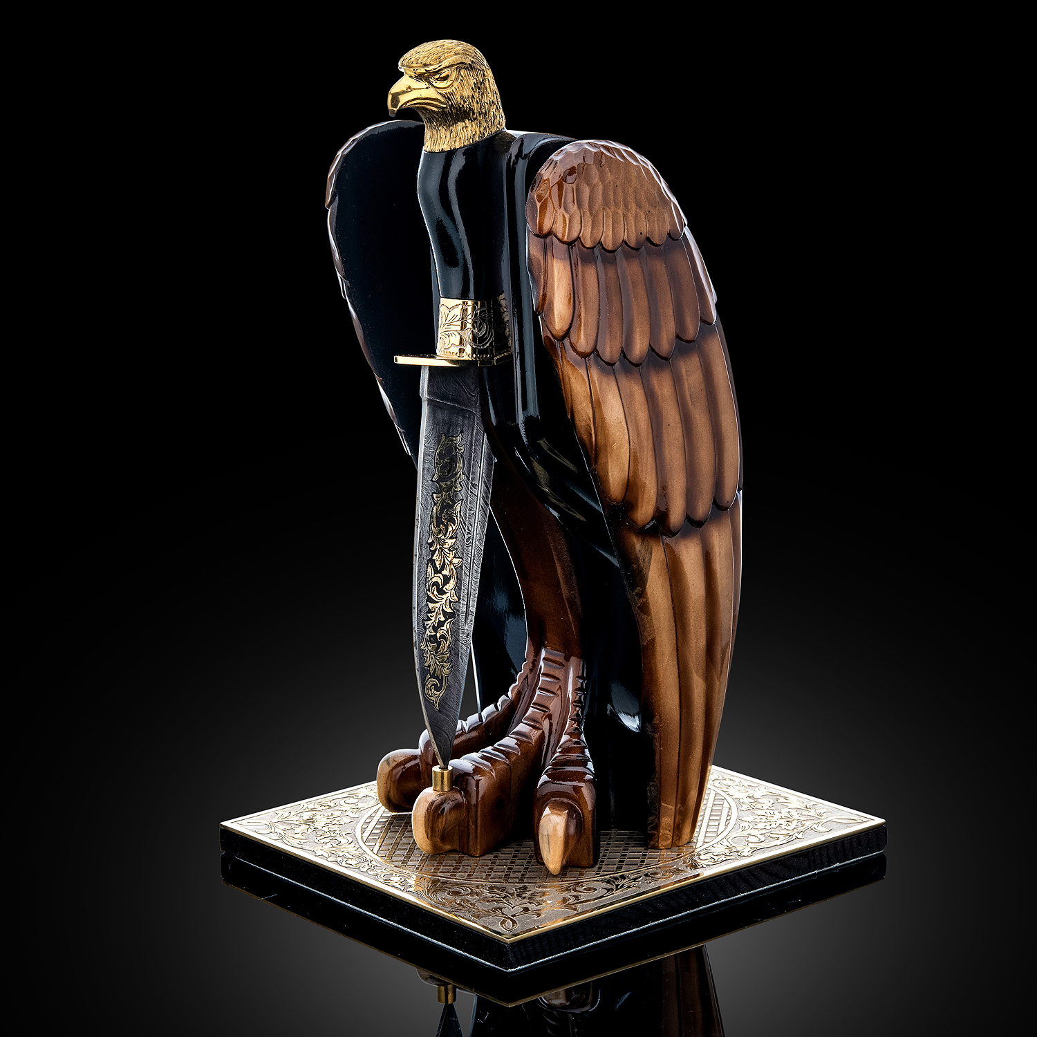 Разглядывая эту композицию, просто получайте удовольствие. Рукоятка ножа выточена из древесины ценной породы и украшена навершием в виде головы сокола. Фигурная подставка для ножа в виде туловища птицы также выточена из дерева в соответствии с авторским эскизом композиции в технике объемной резьбы по дереву. Она установлена на постамент в форме квадрата. Постамент покрыт тонкой пластиной из латуни, украшенной в техниках ручной гравировки на стали авторским орнаментом.