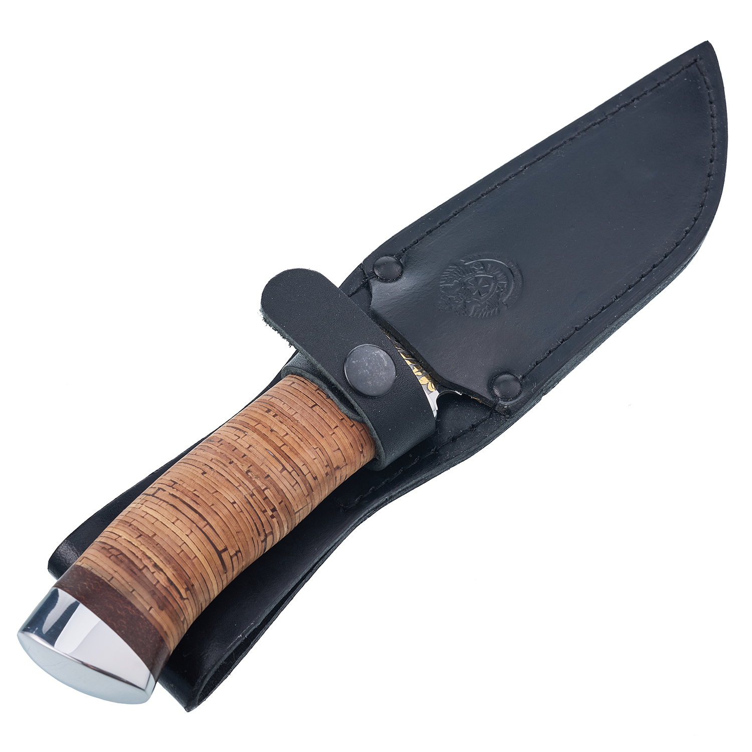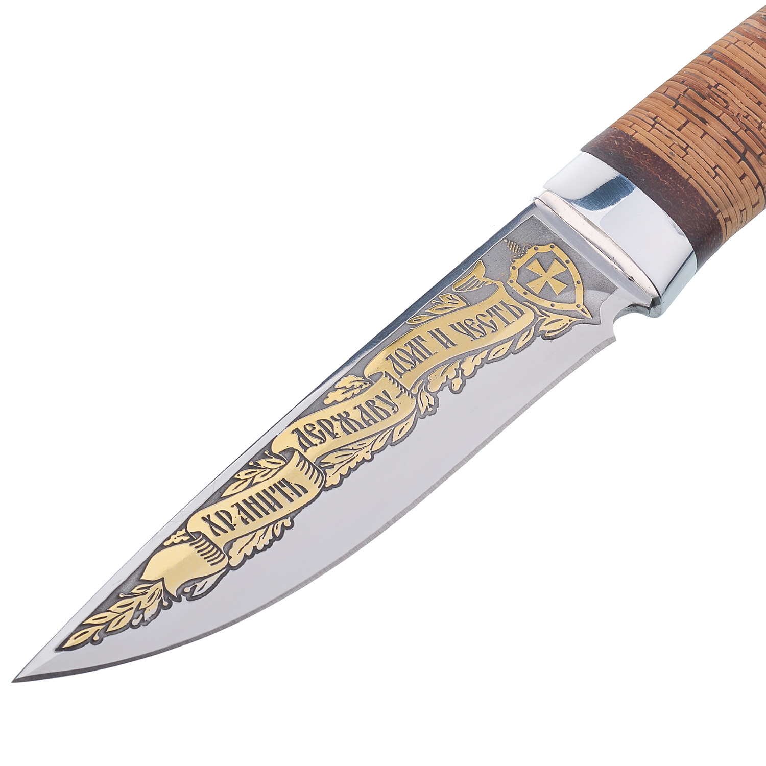 Материалы: сталь 40х10с2м, золото 999,9*, береста, кожа.