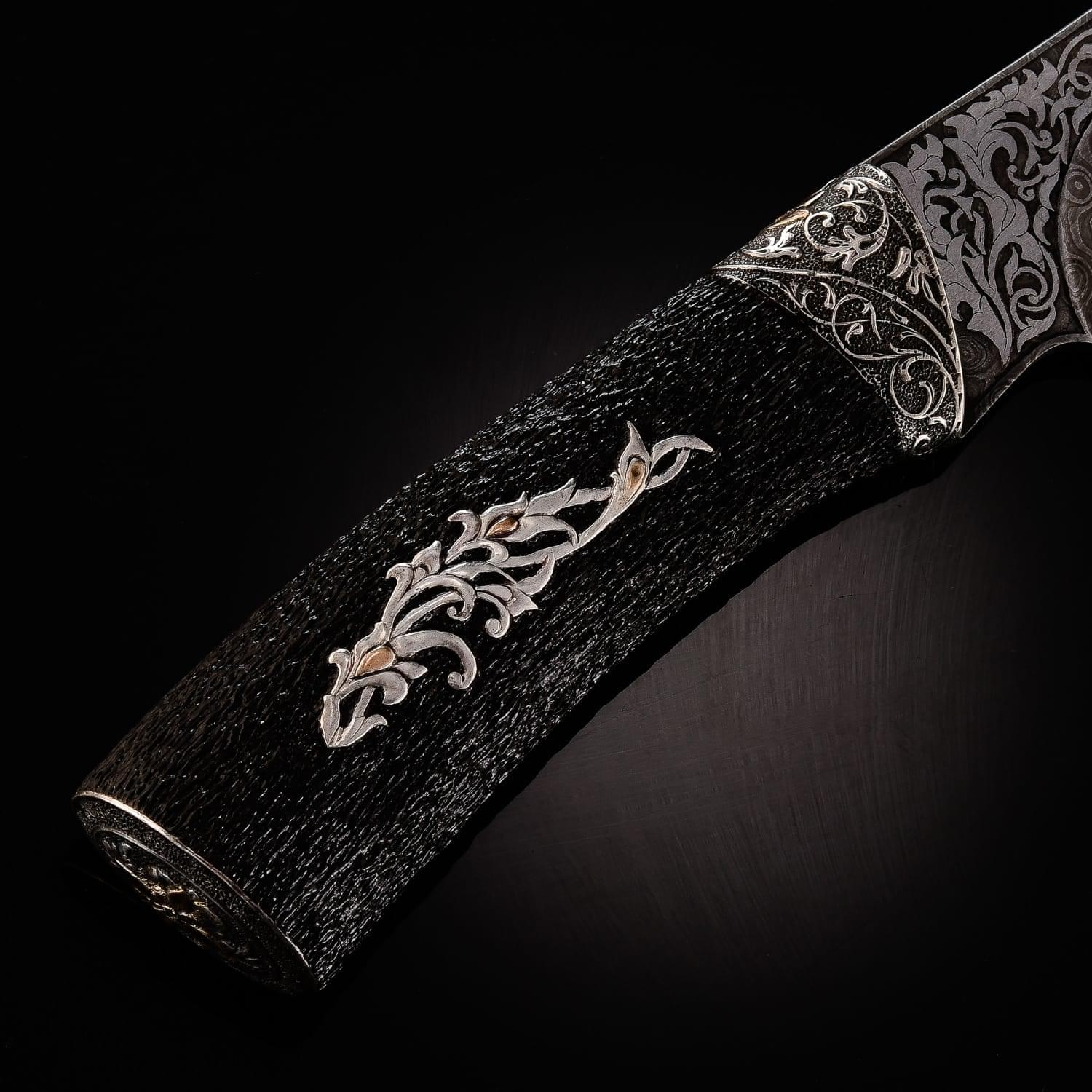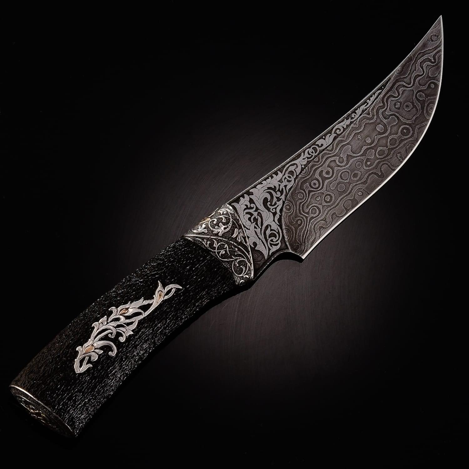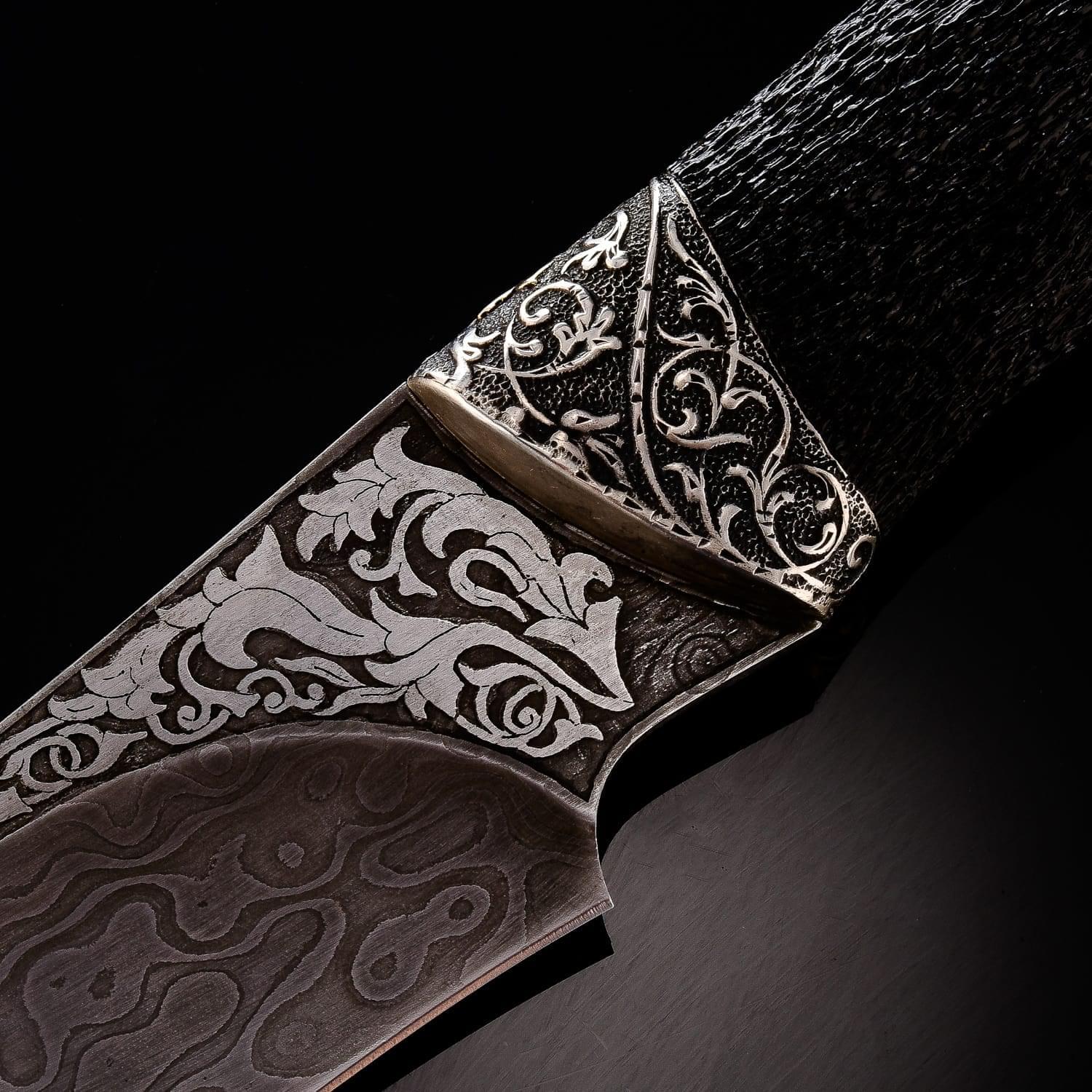 Дамасской сталью называют сталь с видимыми неоднородностями на поверхности, в виде узоров. Есть два рода «дамаска»: сварочный и рафинированный. Из стали делали холодное оружие, доспехи. По технике, принятой в арабских странах, раннесредневековой Европе или в Китае, проковывался пучок проволоки или ленты с содержанием углерода. Так тратилось меньше времени и железа. Уже в 3 веке до н. э. согласно археологическим находкам европейские кельты изготавливали сварные дамаски. В первые века нашей эры вошел в моду крученый харалуг; бруски из разнородных сталей сваривались, перекручивались спиралью, проковывались и соединялись с такими же заготовками в один брус. Узоры на поверхности - оптический эффект неравномерного распределения углерода. Этот эффект усиливался полировкой и травлением кислотами. Существуют теории о превосходстве «настоящей дамасской стали» над другими видами металла. Это мнение распространилось в начале 19 века через романтическую литературу, «Талисман» и «Айвенго» Вальтера Скотта. Само название ставится под сомнение: город Дамаск (от имени которого произошло наименование стали) не славился кузнечным делом и мастерами. Сохранившиеся булатные клинки происходят из Сирии, Персии и Индии. В Дамаске существовал рынок оружия, где они продавались. По другой версии, первый клинок нашли близ Дамаска, в связи с чем он получил свое название. Размеры: общая длина - 25 см. длина клинка - 13 см. ширина клинка - 3,5 см.