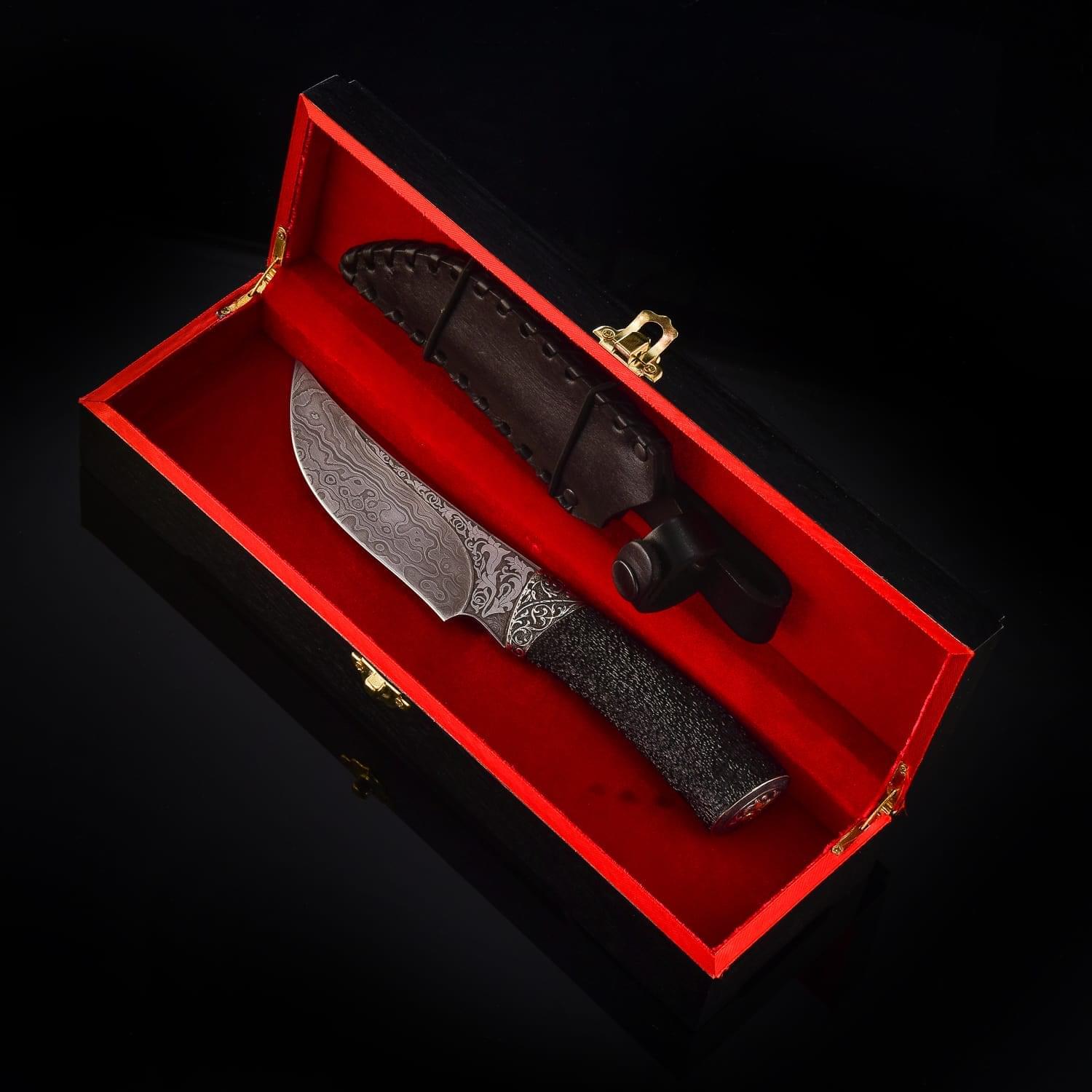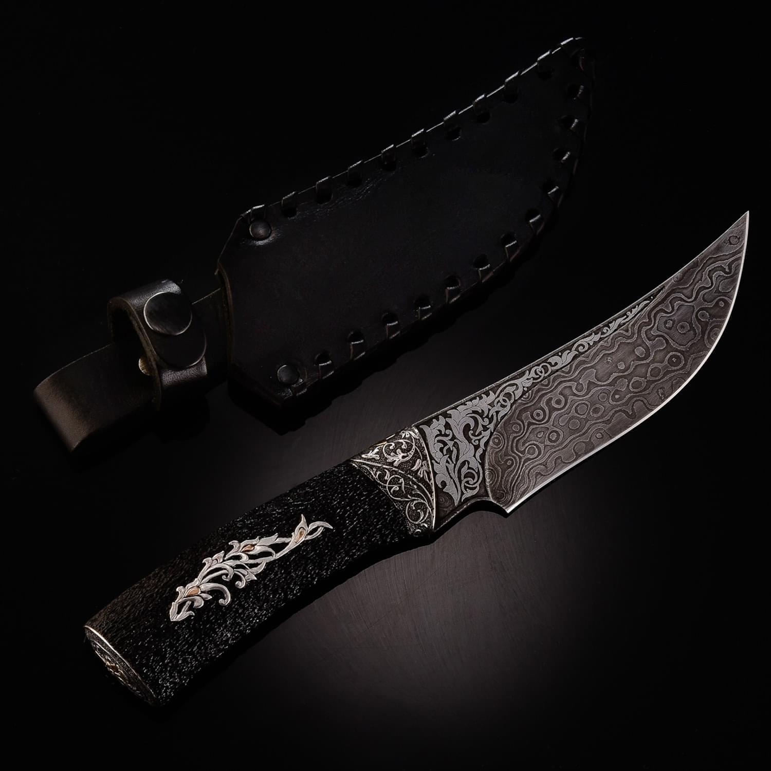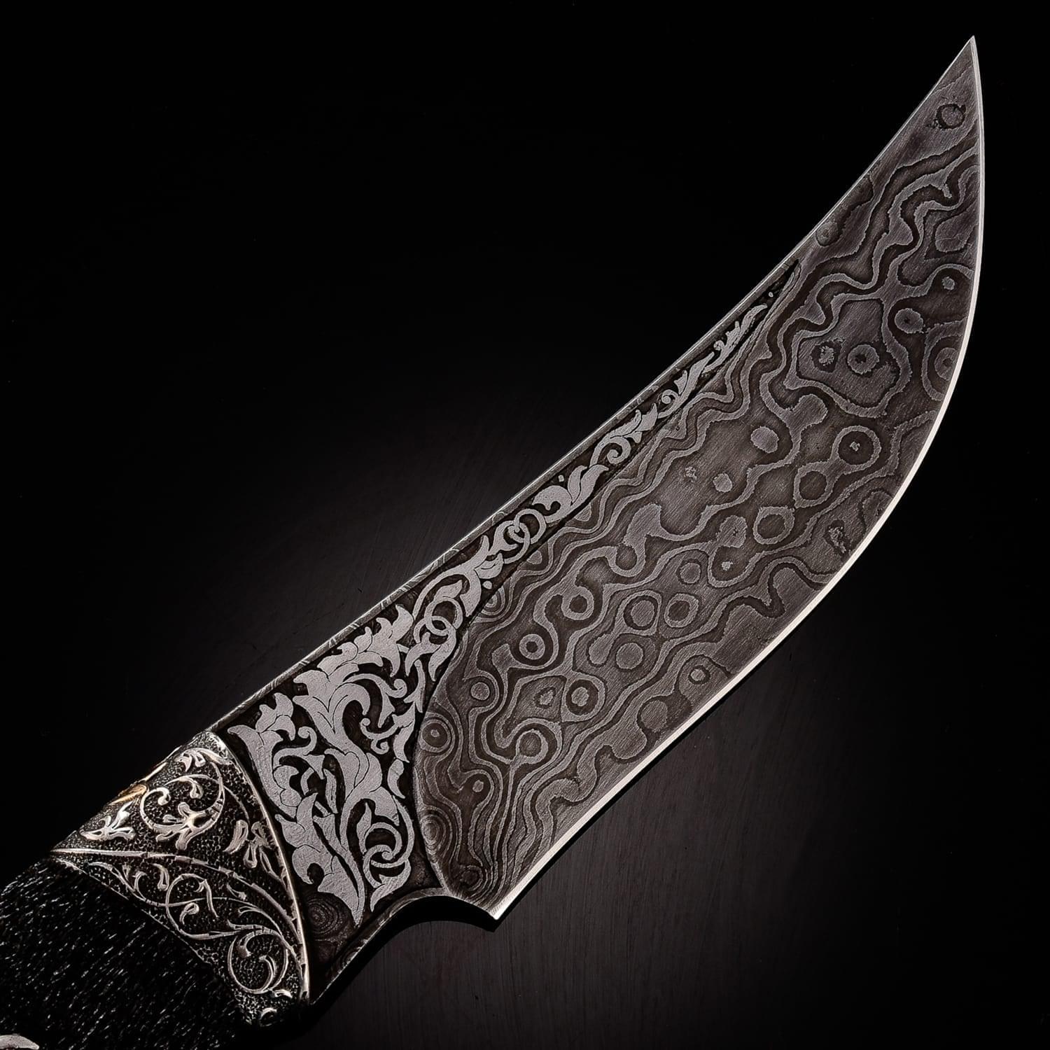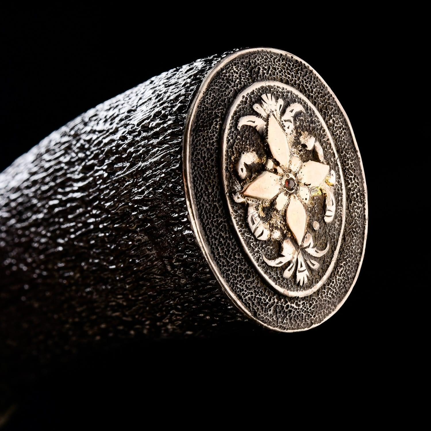 Дамасской сталью называют сталь с видимыми неоднородностями на поверхности, в виде узоров. Есть два рода «дамаска»: сварочный и рафинированный. Из стали делали холодное оружие, доспехи. По технике, принятой в арабских странах, раннесредневековой Европе или в Китае, проковывался пучок проволоки или ленты с содержанием углерода. Так тратилось меньше времени и железа. Уже в 3 веке до н. э. согласно археологическим находкам европейские кельты изготавливали сварные дамаски. В первые века нашей эры вошел в моду крученый харалуг; бруски из разнородных сталей сваривались, перекручивались спиралью, проковывались и соединялись с такими же заготовками в один брус. Узоры на поверхности - оптический эффект неравномерного распределения углерода. Этот эффект усиливался полировкой и травлением кислотами. Существуют теории о превосходстве «настоящей дамасской стали» над другими видами металла. Это мнение распространилось в начале 19 века через романтическую литературу, «Талисман» и «Айвенго» Вальтера Скотта. Само название ставится под сомнение: город Дамаск (от имени которого произошло наименование стали) не славился кузнечным делом и мастерами. Сохранившиеся булатные клинки происходят из Сирии, Персии и Индии. В Дамаске существовал рынок оружия, где они продавались. По другой версии, первый клинок нашли близ Дамаска, в связи с чем он получил свое название. Размеры: общая длина - 25 см. длина клинка - 13 см. ширина клинка - 3,5 см.
