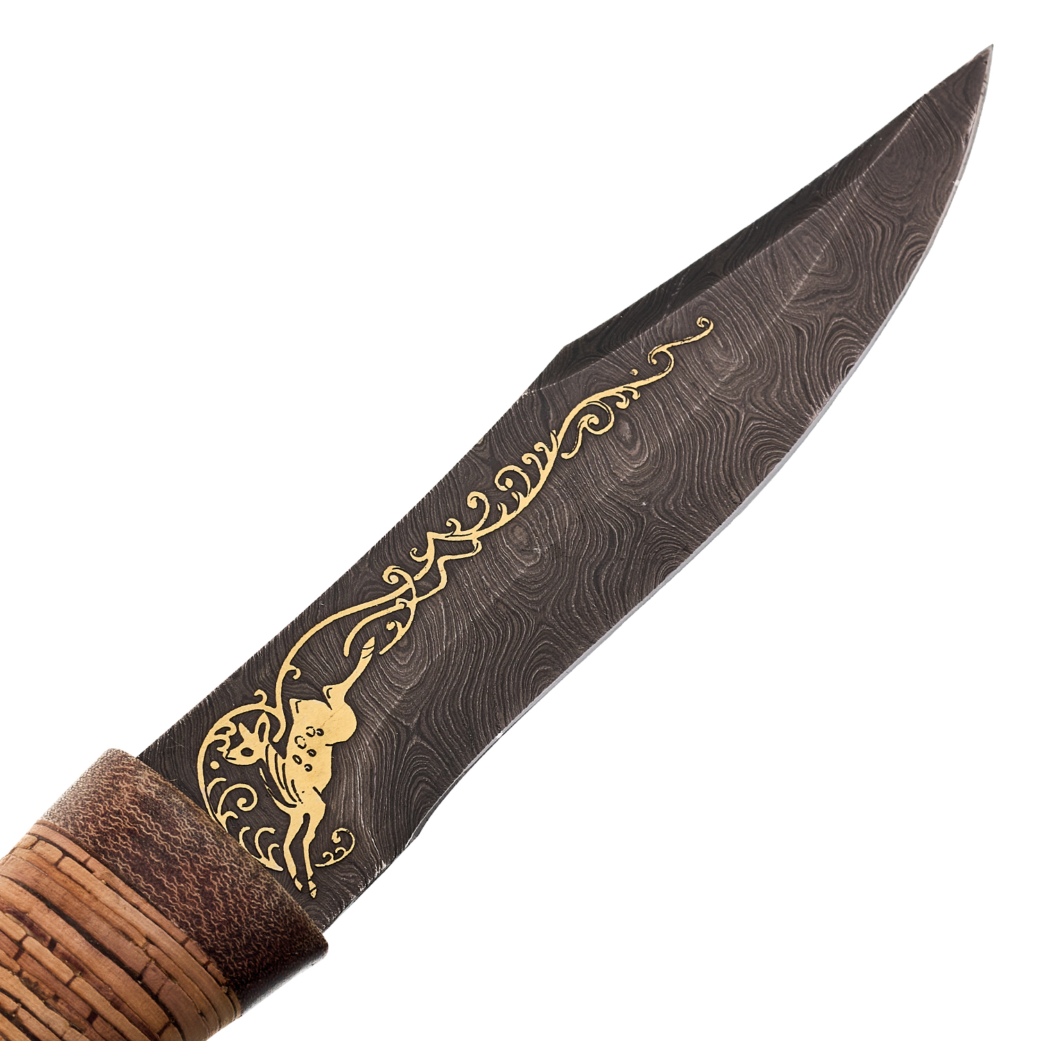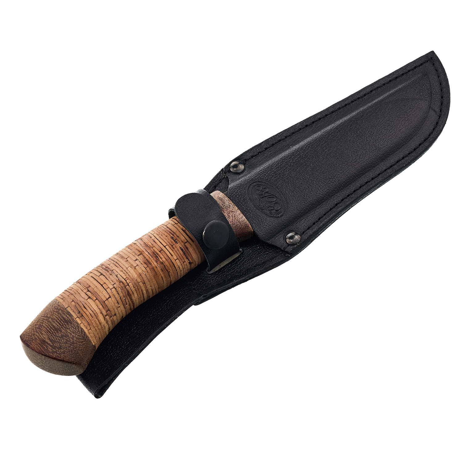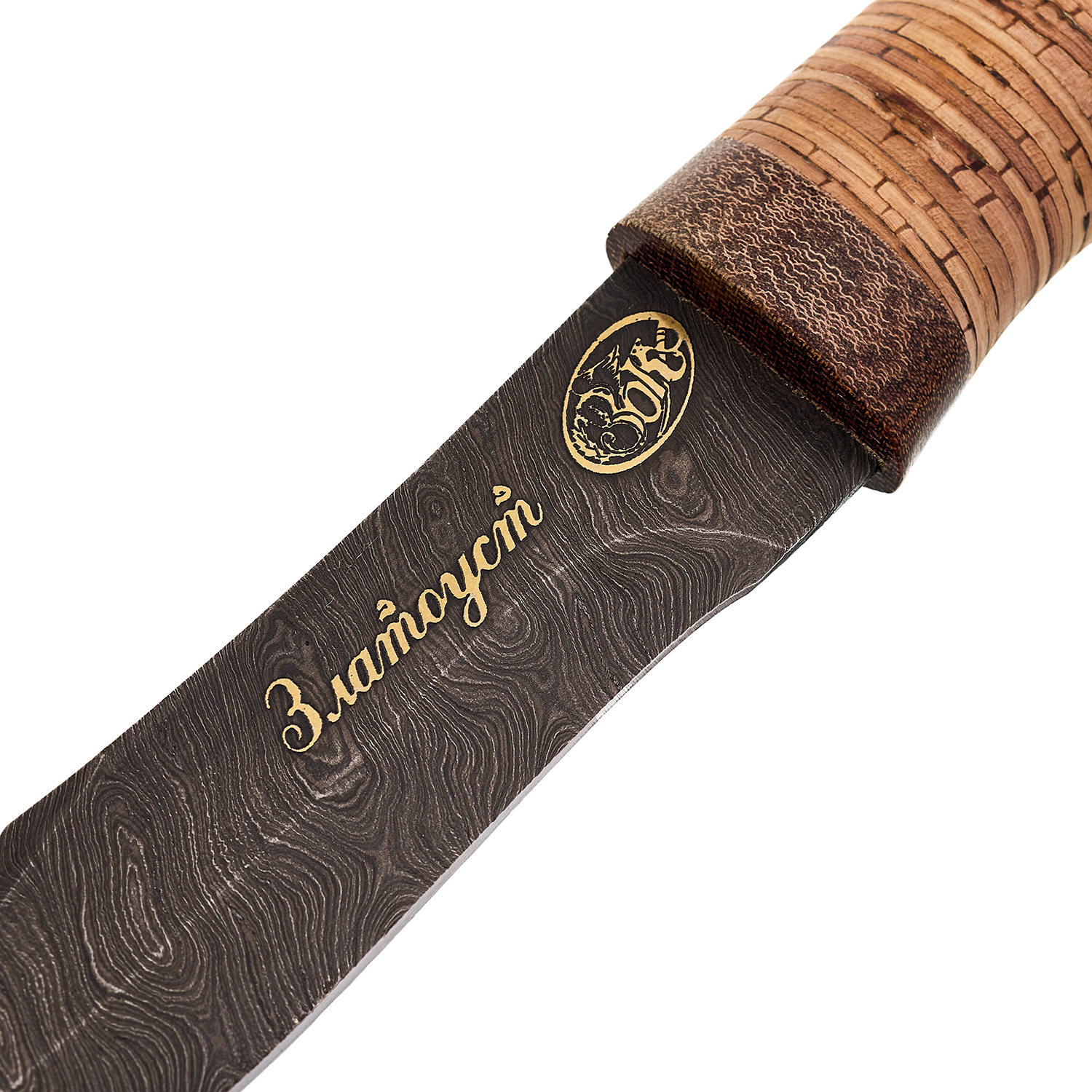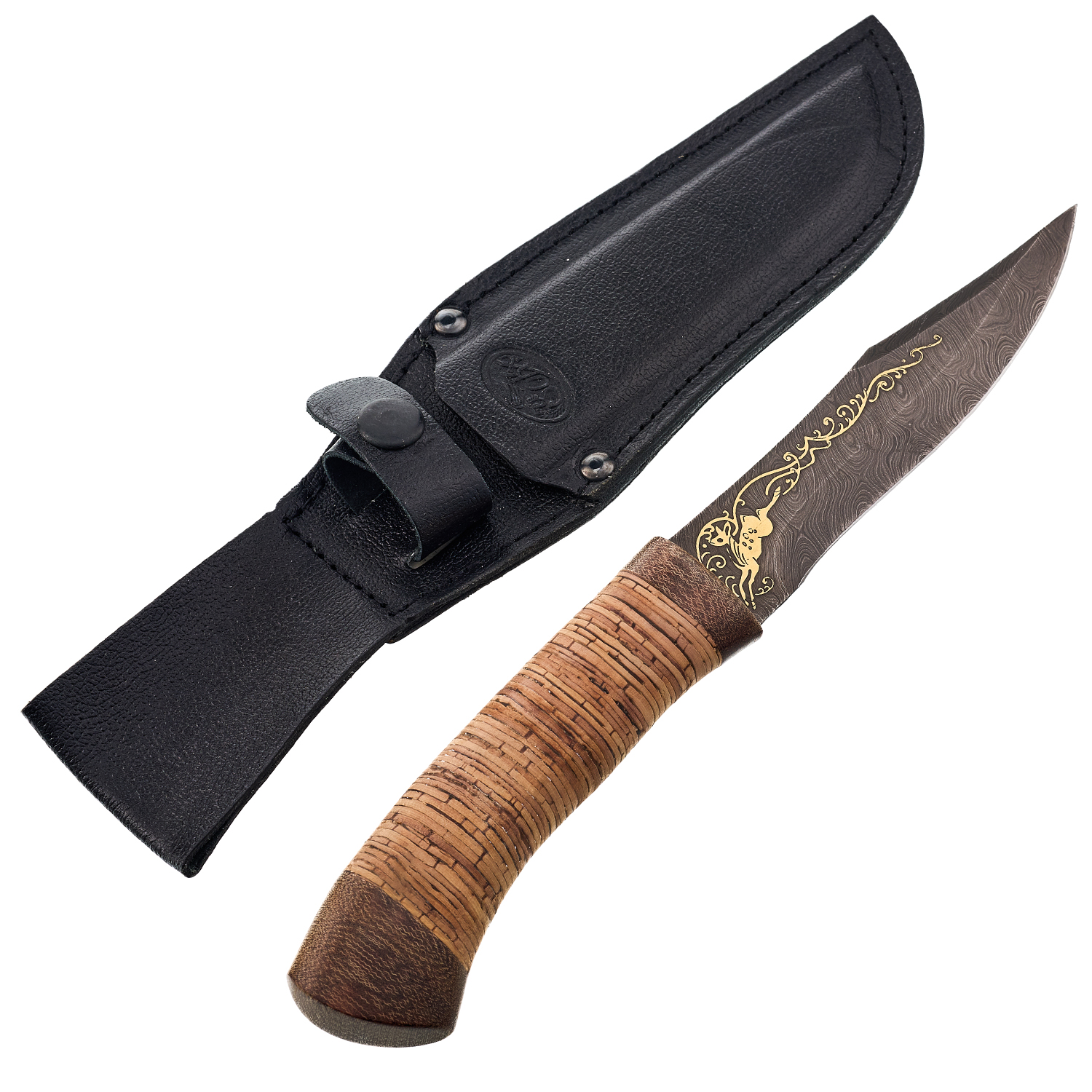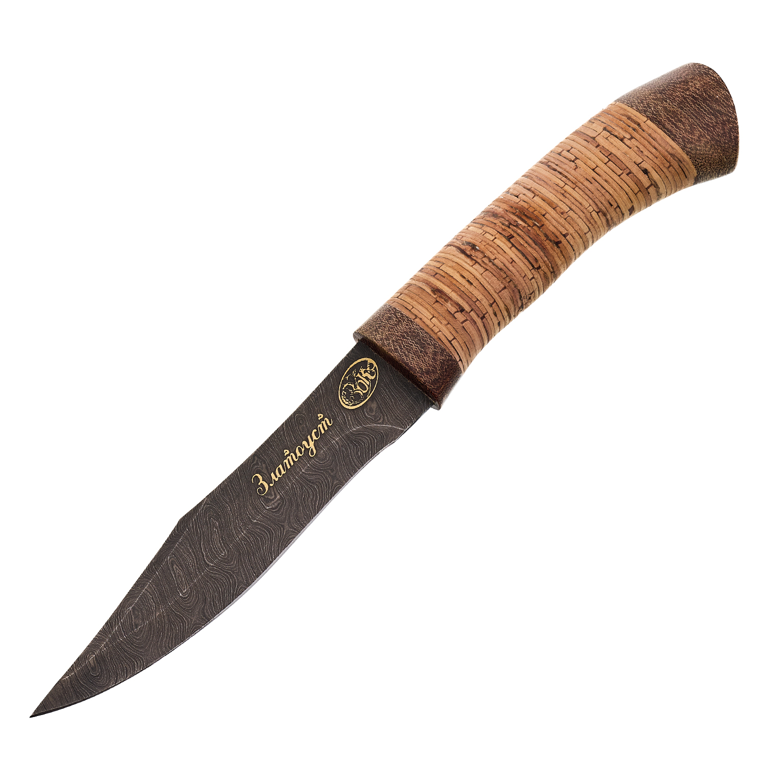 Материалы: дамасская сталь, береста, текстолит, кожа.