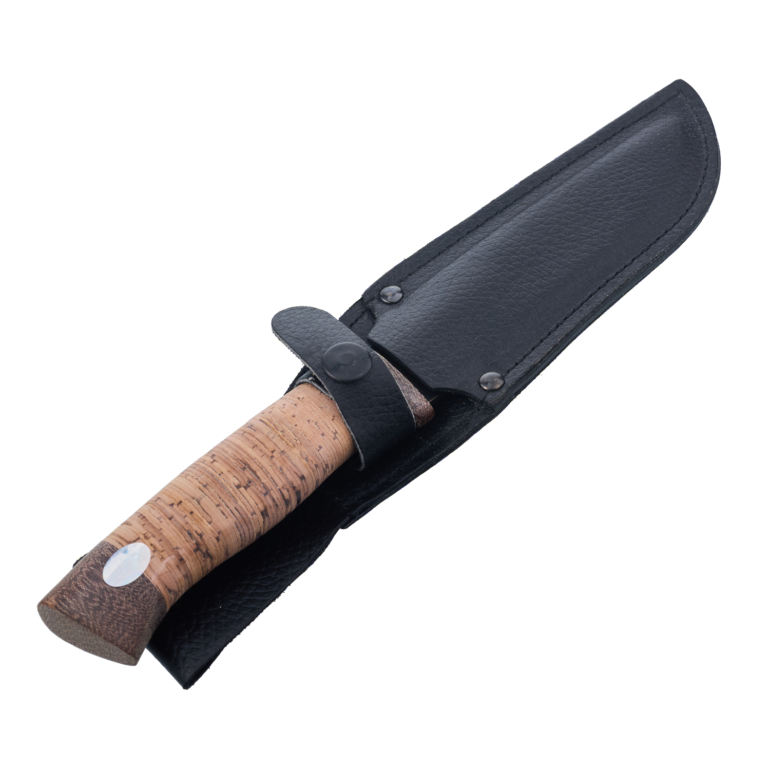 Материалы: дамасская сталь, береста, золото 999,9*, текстолит, кожа.