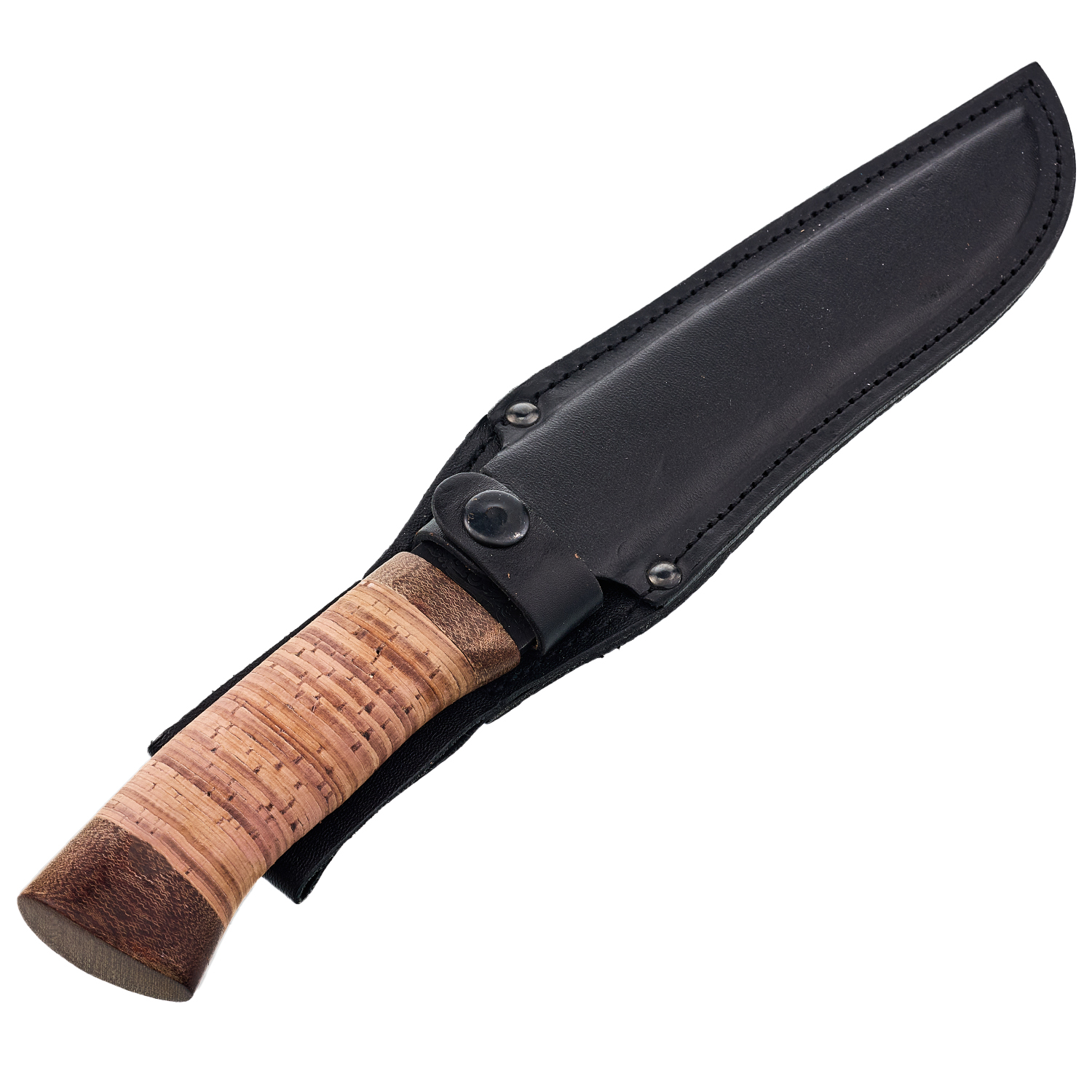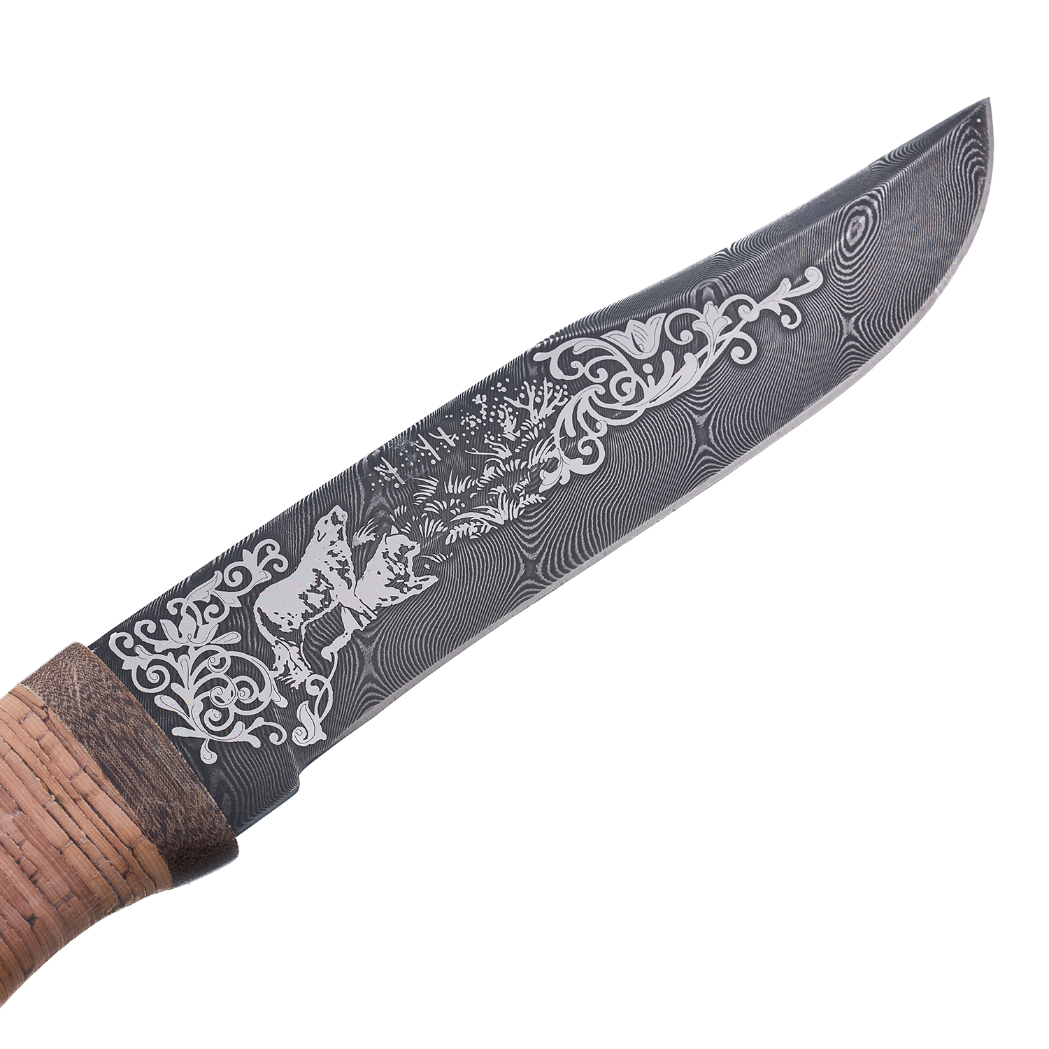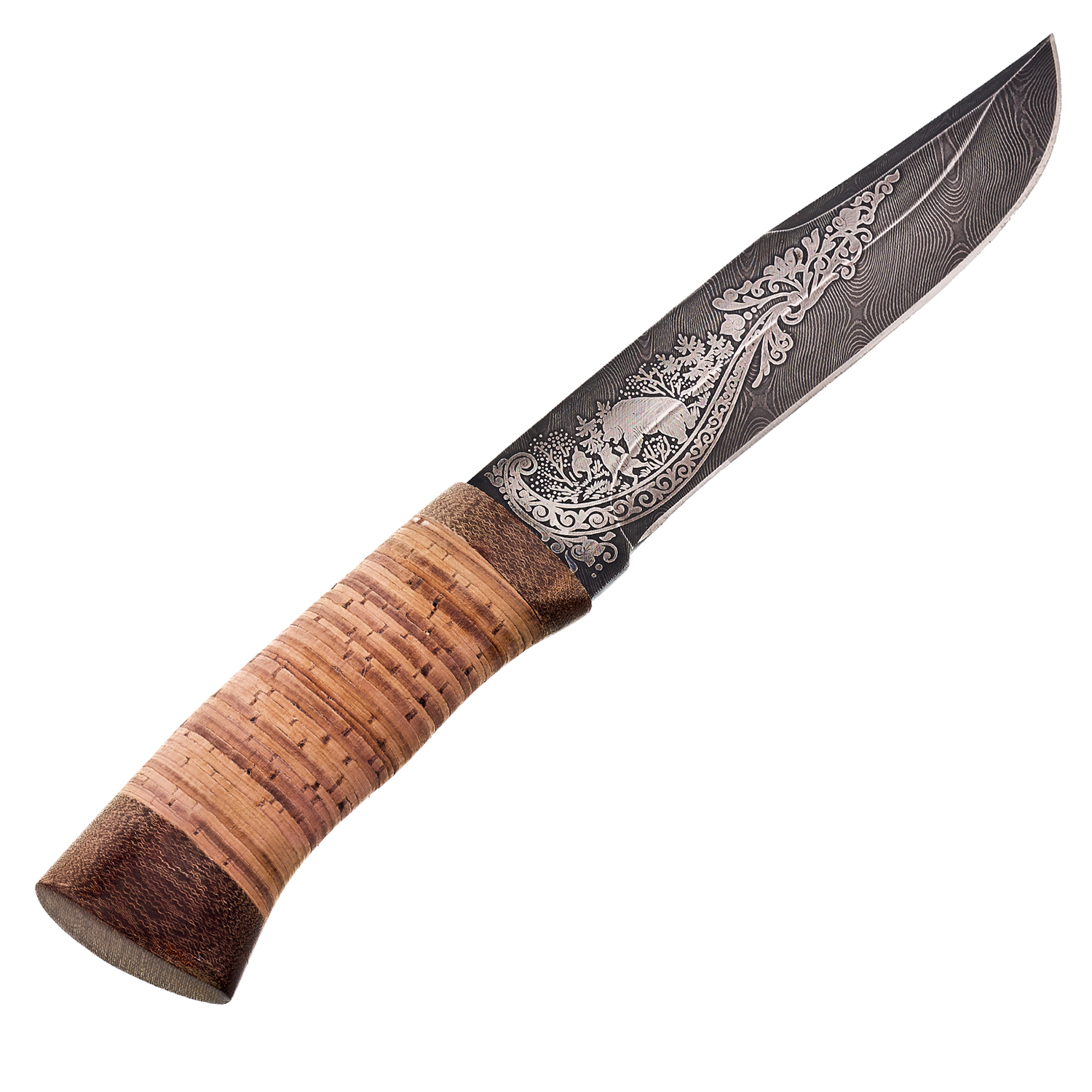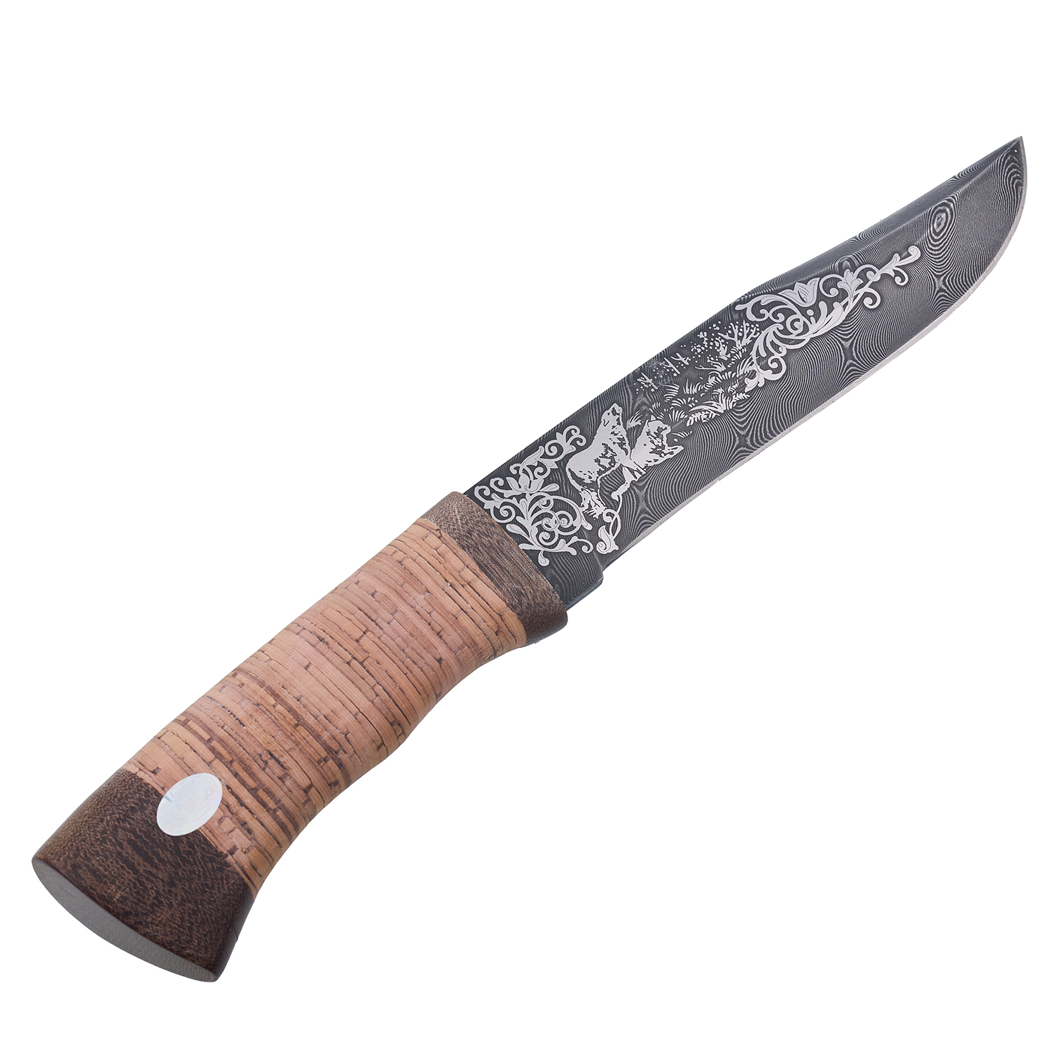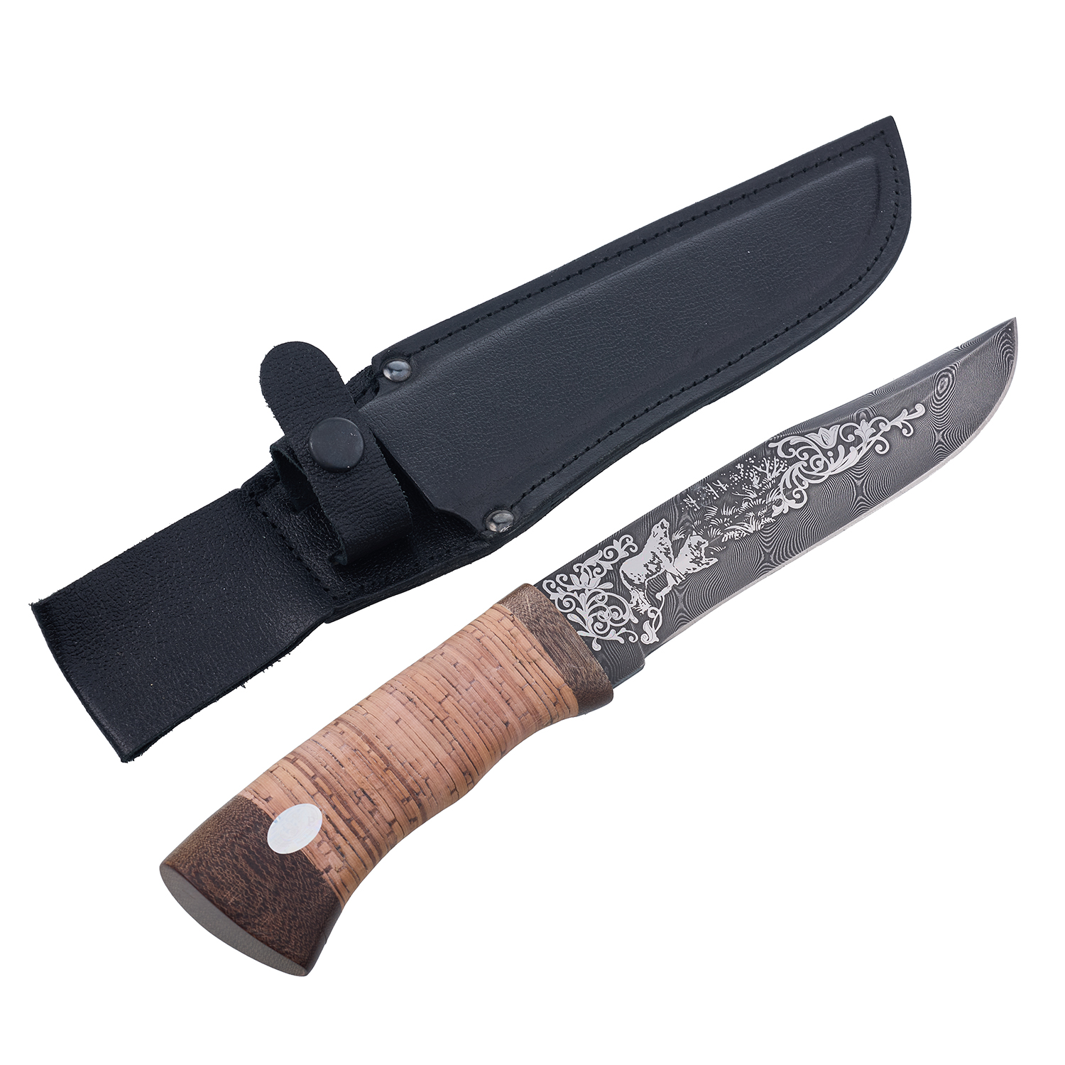 Материалы: дамасская сталь, береста, текстолит, кожа.
