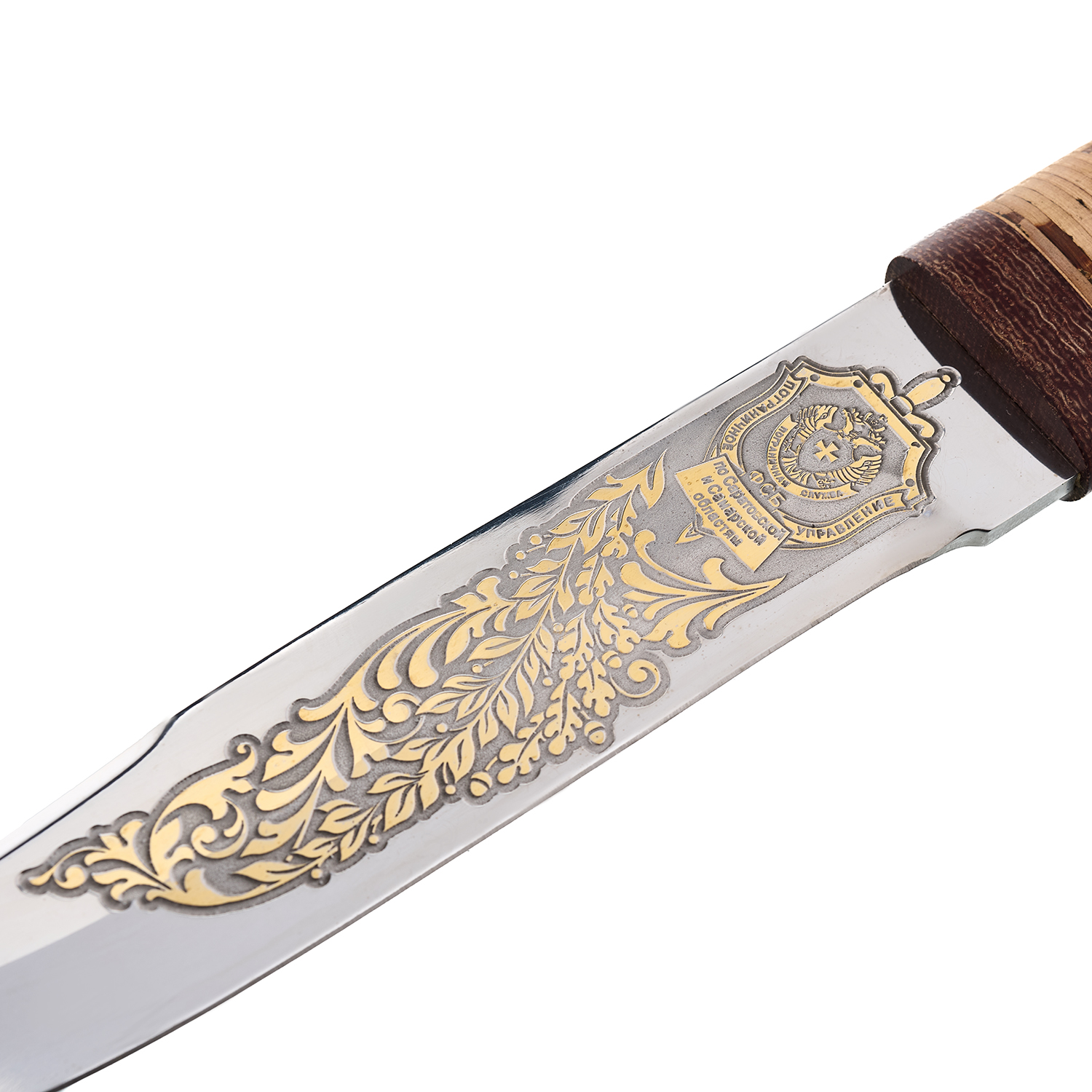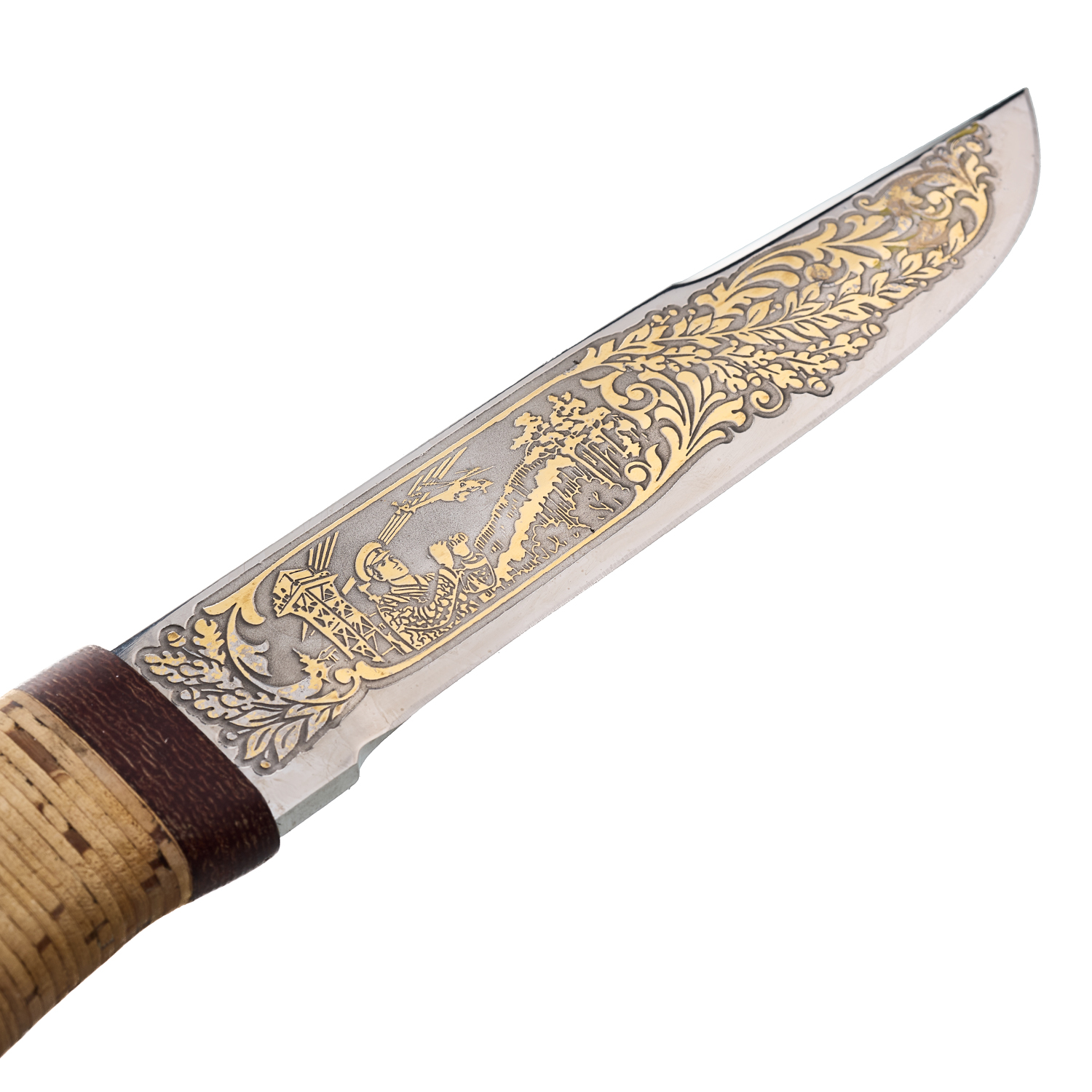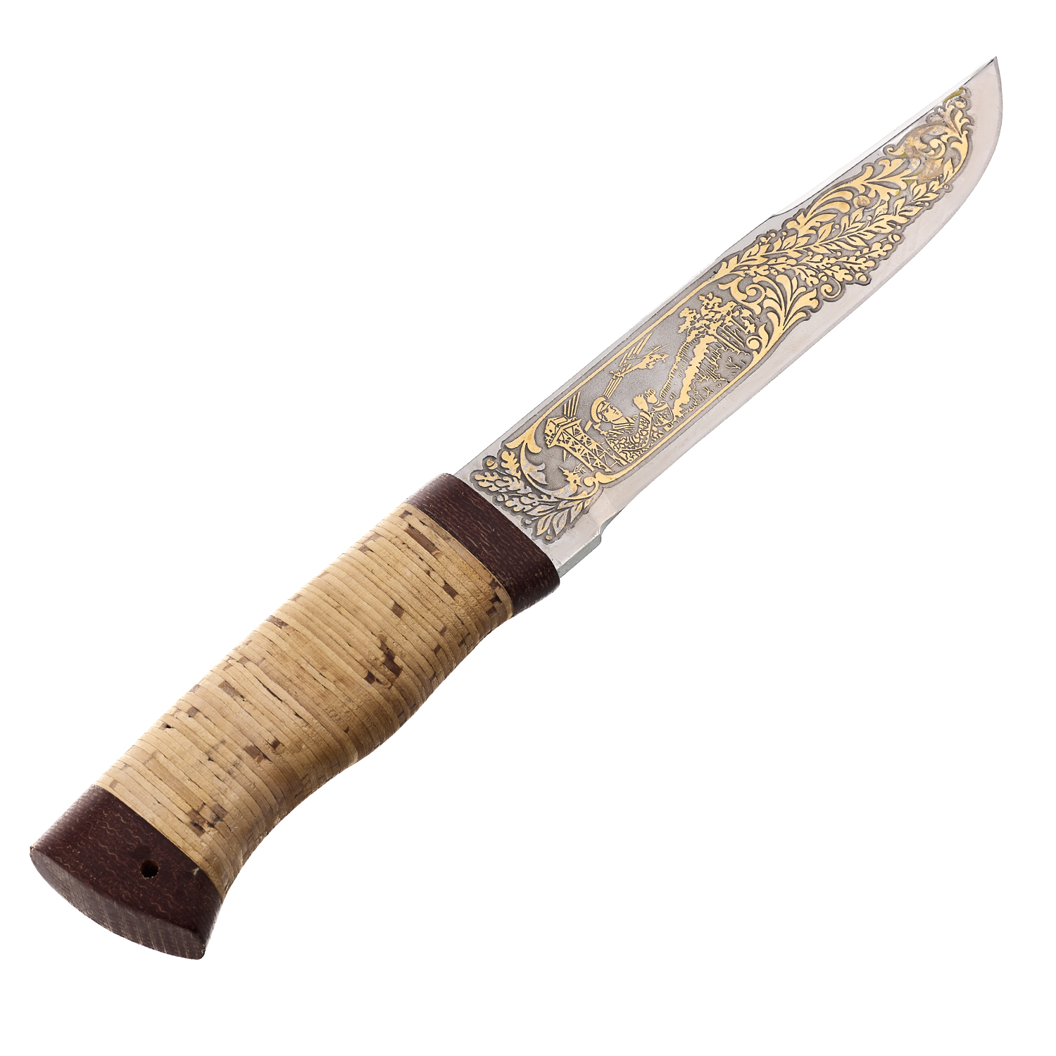 Материалы: сталь 40х10с2м, текстолит, береста, золото 999,9*, кожа.