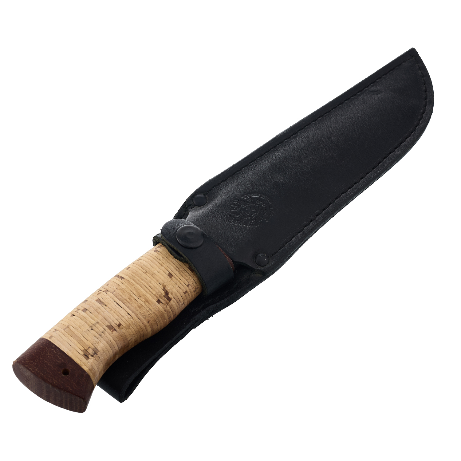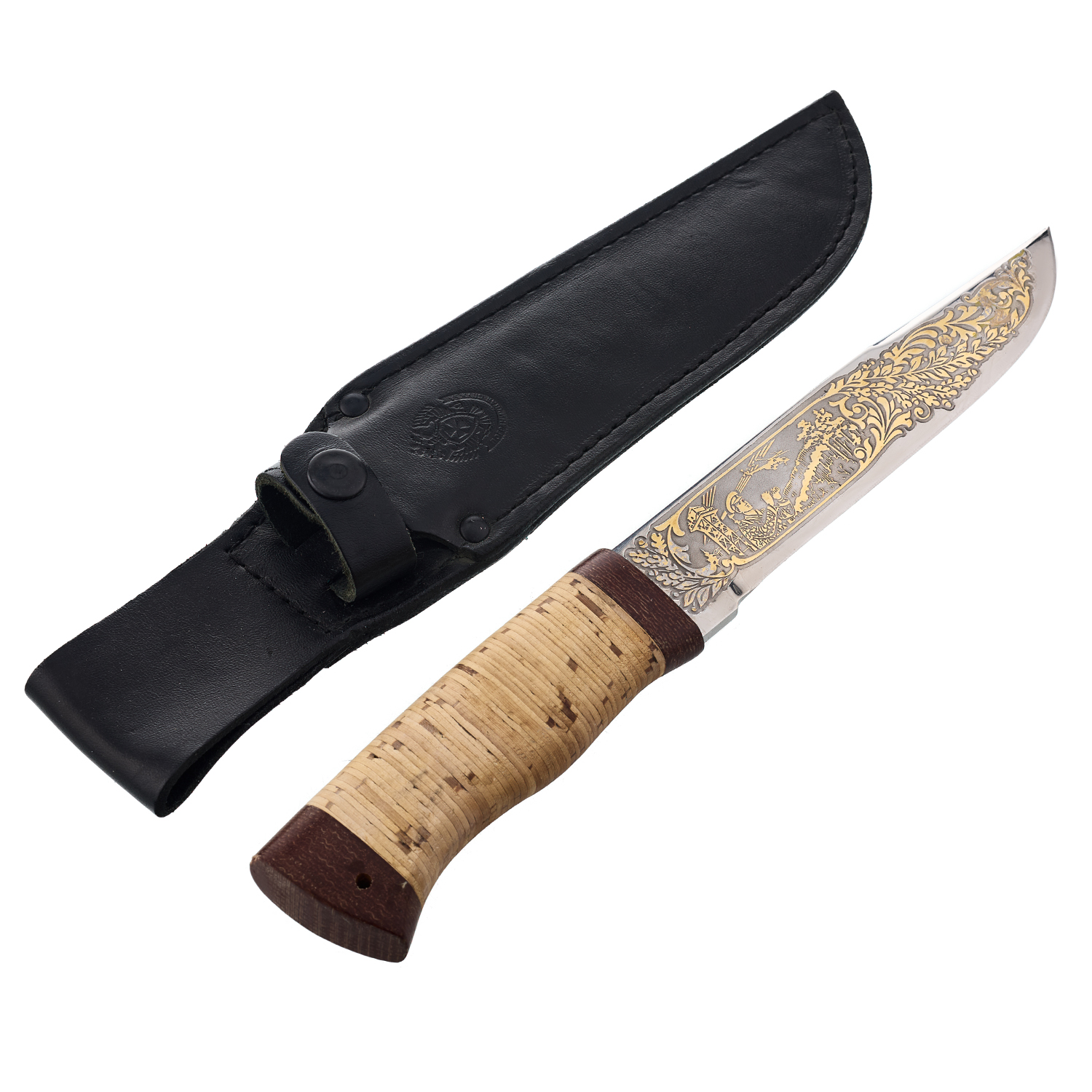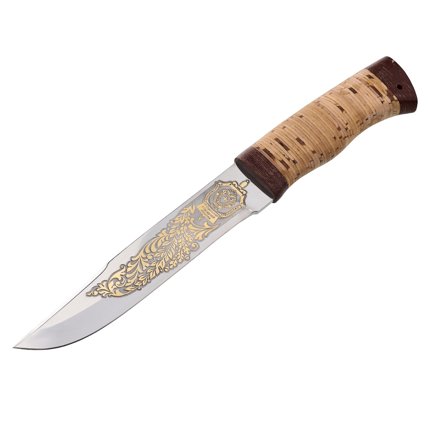 Материалы: сталь 40х10с2м, текстолит, береста, золото 999,9*, кожа.