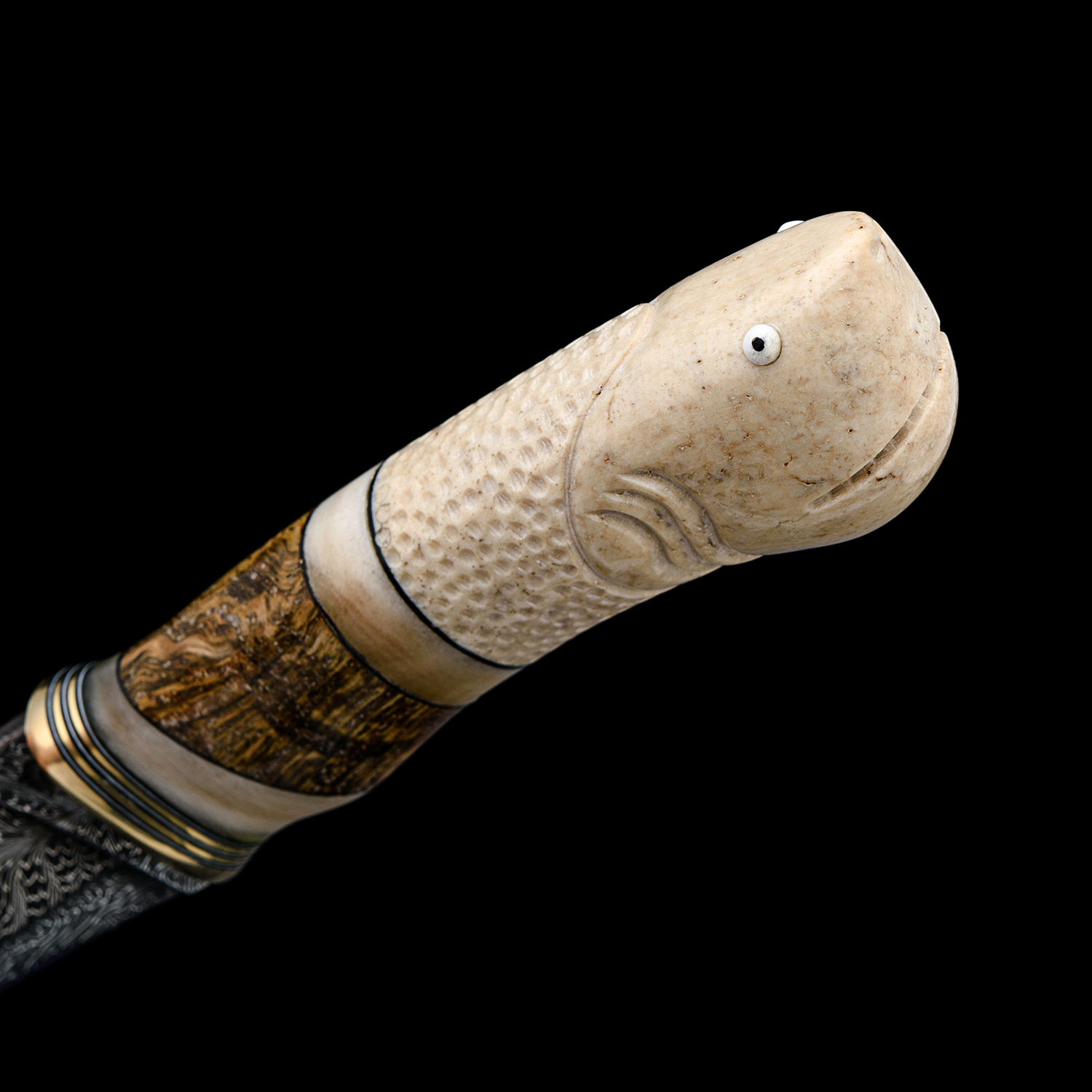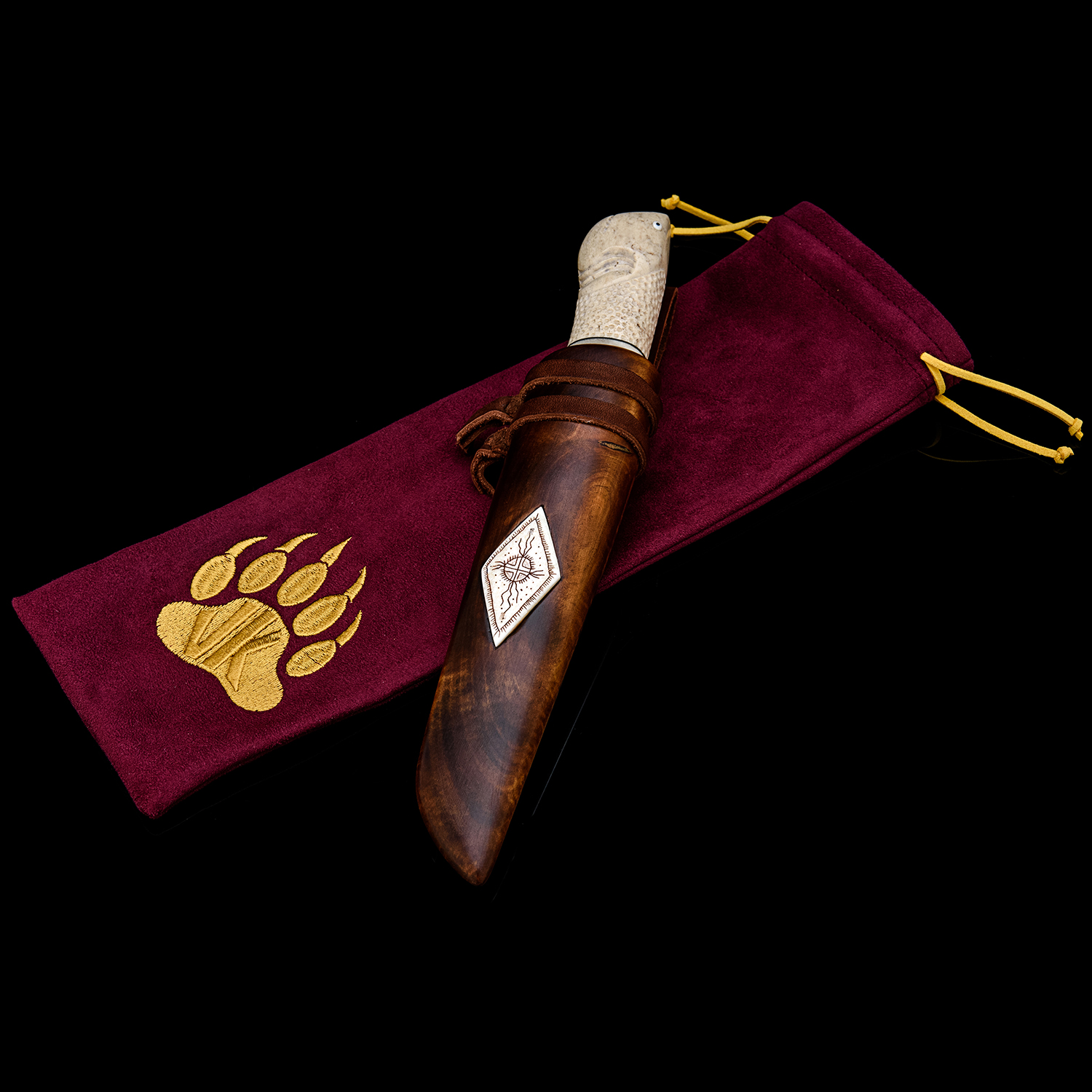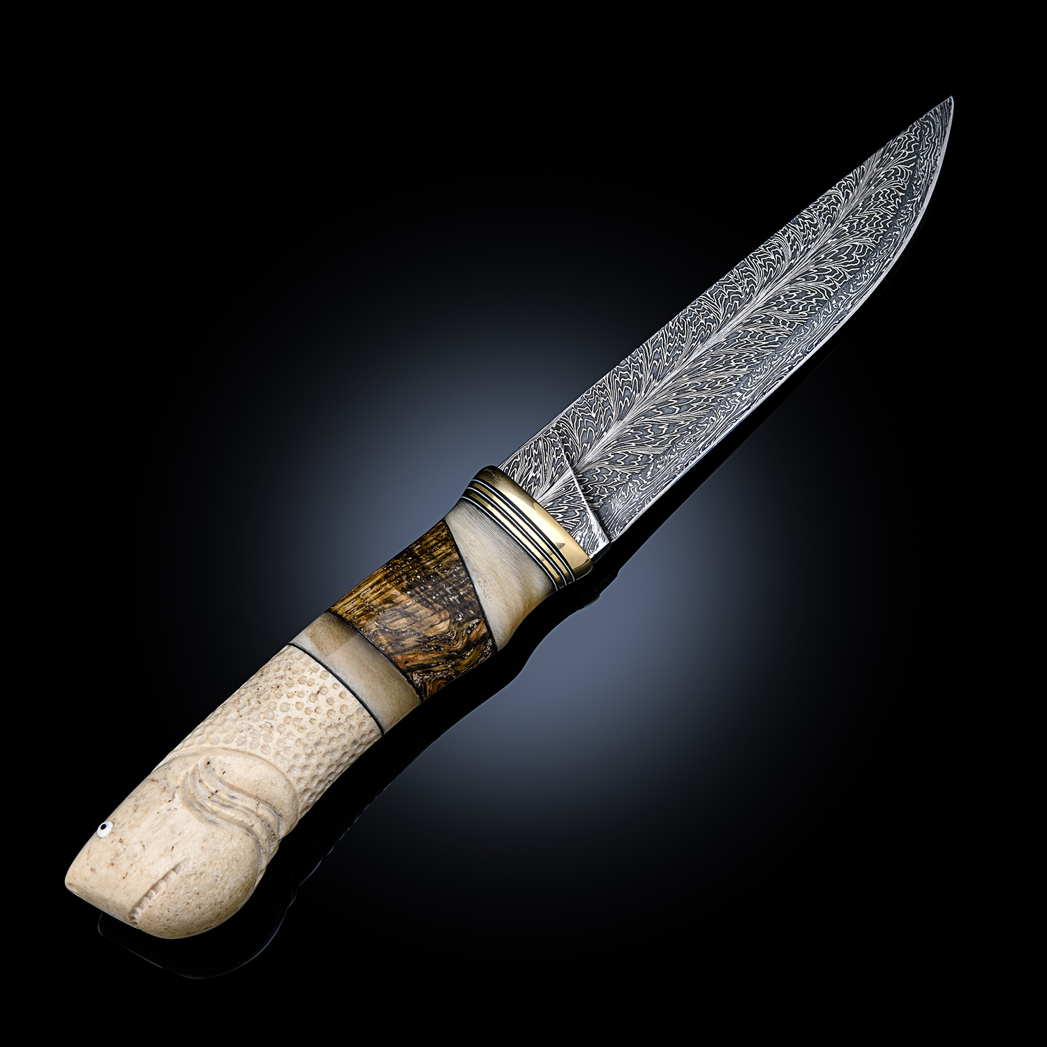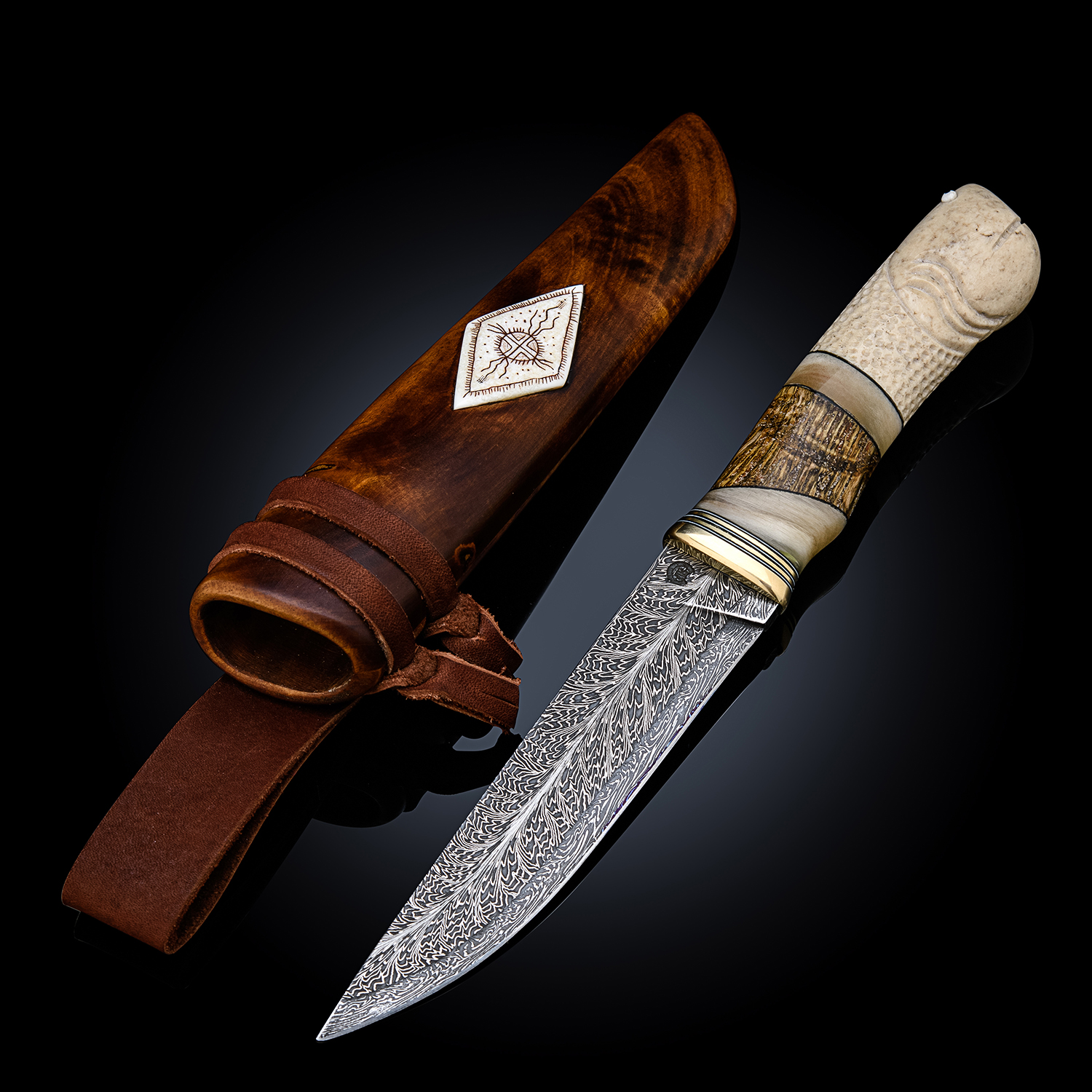 Материалы: дамасская сталь, ребро коровы Стеллера, клык моржа, кожа.