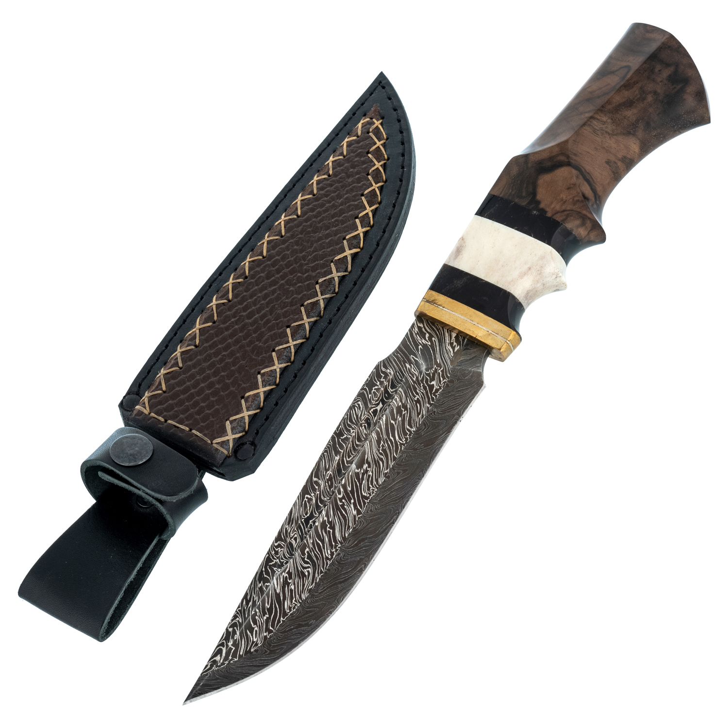 Материалы: дамасская сталь, латунь, рог тура, кость лося, кап канадского клена, кожа.