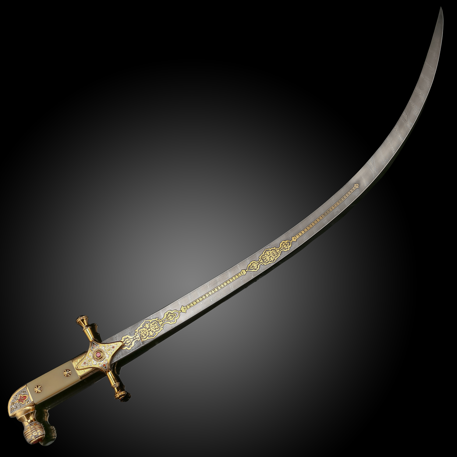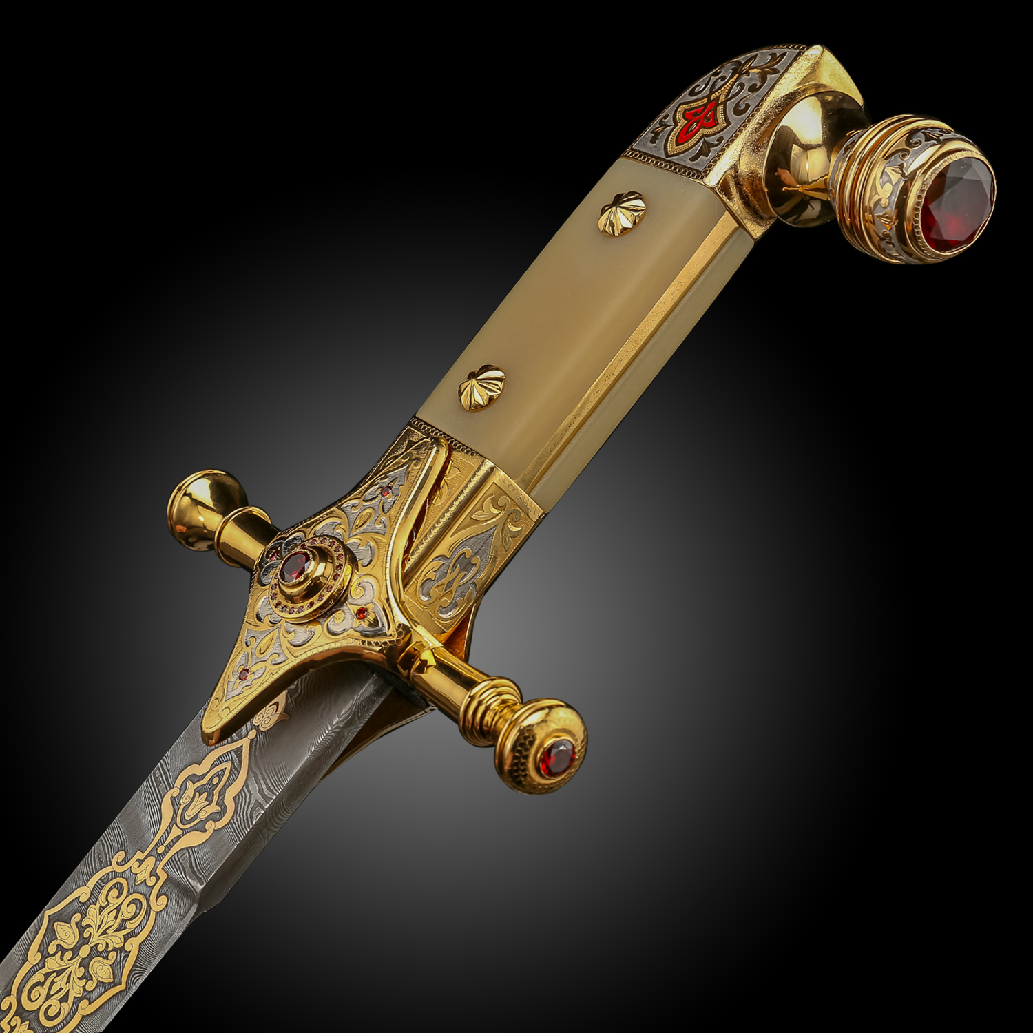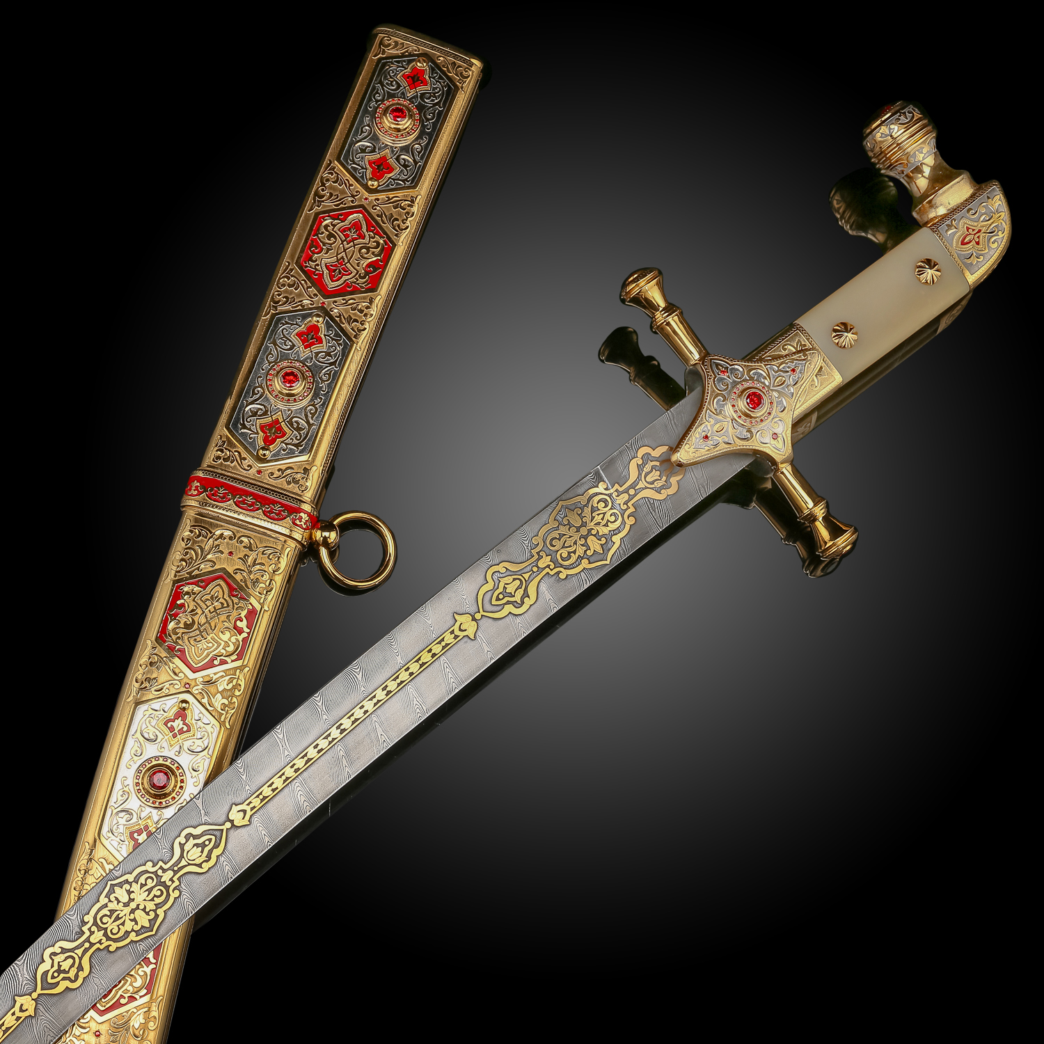 Материалы: дамасская сталь, латунь, никель, золото 999,9*, эмаль, фианиты.