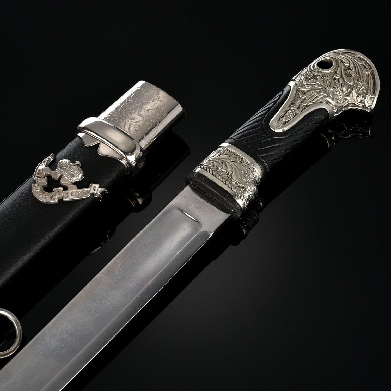Материал: сталь 60C2А, твердость клинка 25 HRC по Роквеллу, латунь, никель, дерево, кожа.